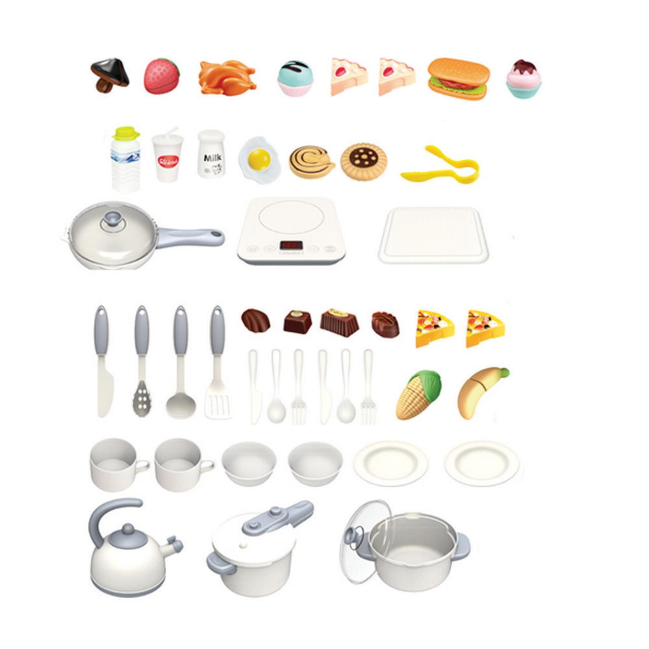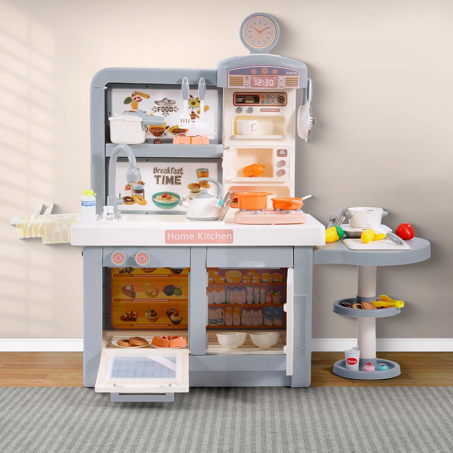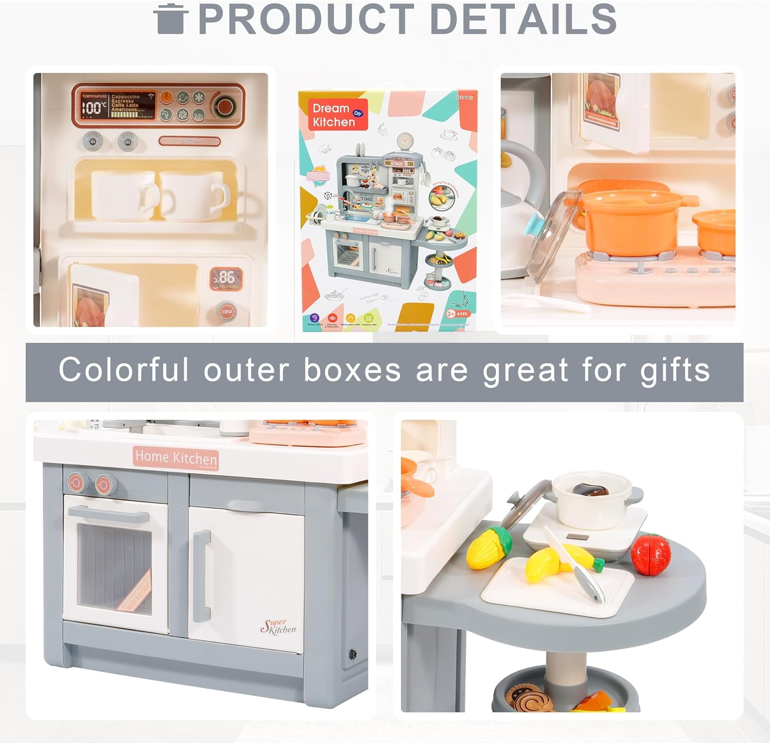 BIG TOY KITCHEN SET FOR KIDS 49 PCS. Play and cook pretend with sink, lights, sounds, cutting food, steam and water features, electronic stovetop with steam, play sink with running water, induction cooker for kids, kitchen utensils, oven, microwave, cutting play food, dessert shelf, various kitchen accessories – all ready for play and fun. With this Play Kitchen Set, children can pretend to be a chef and cook with their parents or friends. They can improve their coordination, social skills, and use their imagination. It’s a great gift for birthdays, parties, Children’s Day, Christmas, Halloween, Thanksgiving, and New Year’s Day. Suitable for boys and girls aged 3 to 6.