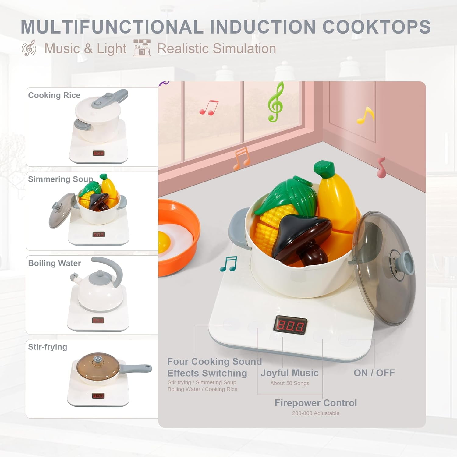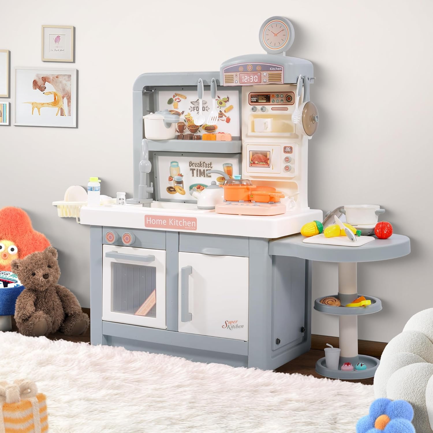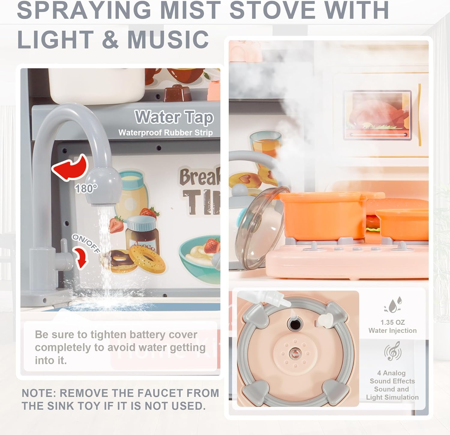 BIG TOY KITCHEN SET FOR KIDS 49 PCS. Play and cook pretend with sink, lights, sounds, cutting food, steam and water features, electronic stovetop with steam, play sink with running water, induction cooker for kids, kitchen utensils, oven, microwave, cutting play food, dessert shelf, various kitchen accessories – all ready for play and fun. With this Play Kitchen Set, children can pretend to be a chef and cook with their parents or friends. They can improve their coordination, social skills, and use their imagination. It’s a great gift for birthdays, parties, Children’s Day, Christmas, Halloween, Thanksgiving, and New Year’s Day. Suitable for boys and girls aged 3 to 6.