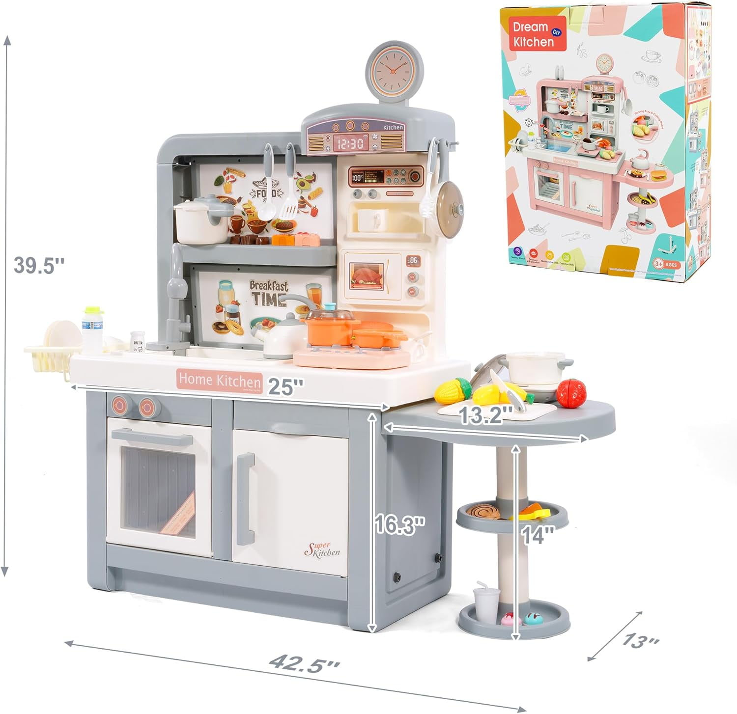 REALISTIC KITCHEN COOKING TOY: Pretend stovetop burner features realistic electronic lights, sounds & Steam. Electronic cooker with lights & sound effects, the firepower can be adjustable. The water sink toy adopts an water circulation system. Oven, microwave doors all open and close. Children can use hanging tableware to store and dry tableware to keep their tableware placed, and to develop children’s storage habits from an early age. Mini blackboard to write menu. And many more functions to discover with your little ones. Product Dimensions (L*W*H): 42.5*13*39.5 inches. Fun and Educational Role Play Kitchen Toy: Simulated Kitchen Toy with many realistic cooking utensils,your little one can role-play with their friends or parents, learn to identify colors of vegetables and fruits while playing, improving their hands-on, imaginative, language and social skills. This kitchen toy set is made of durable and safe plastic material that is easy to clean and store.