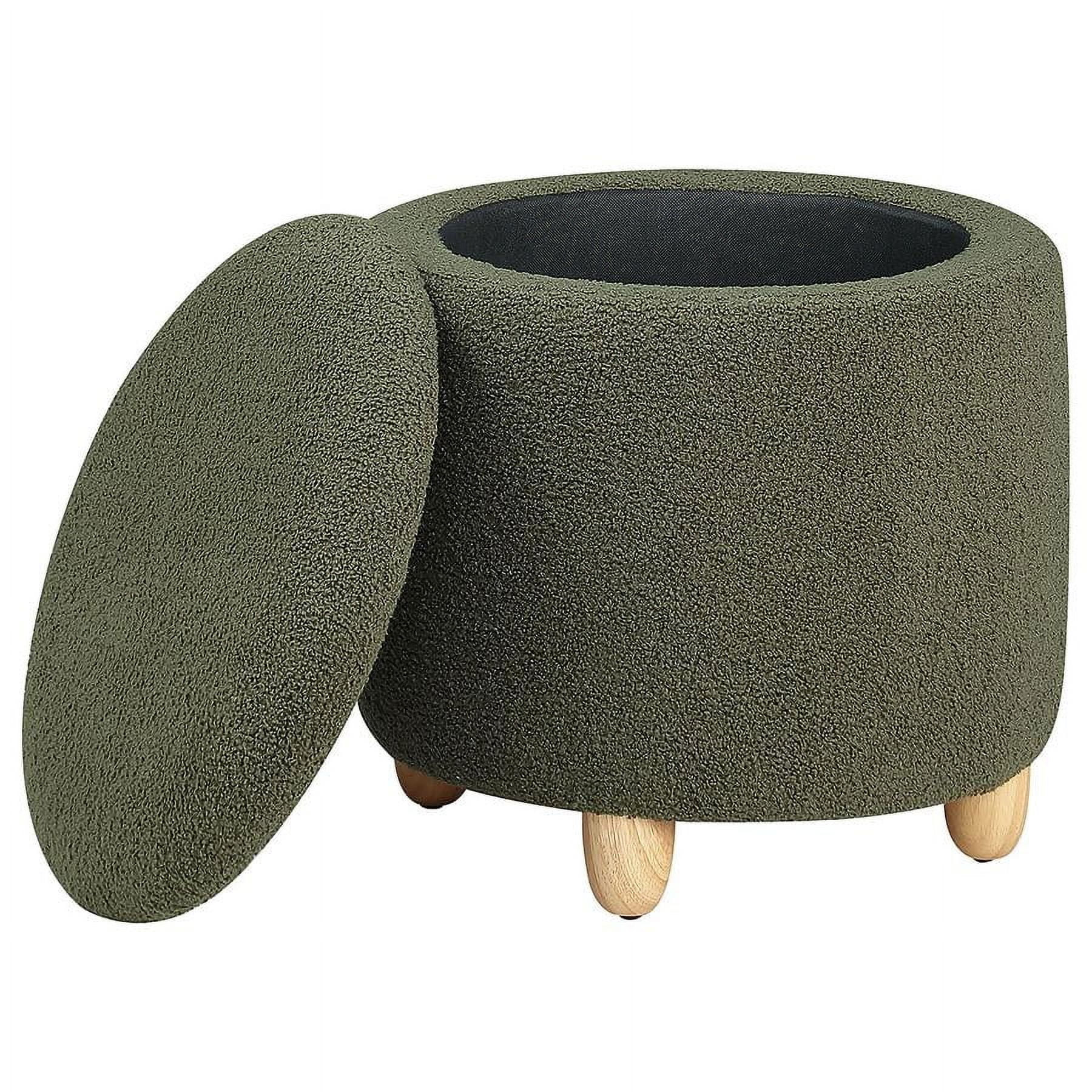 Round storage ottoman with luxurious faux sheepskin upholstery Features subtle, rounded wood feet in a natural brown finish The top lifts off to reveal a handy storage space Provides a soft, inviting texture to any room Versatile functionality, perfect for a variety of home settings