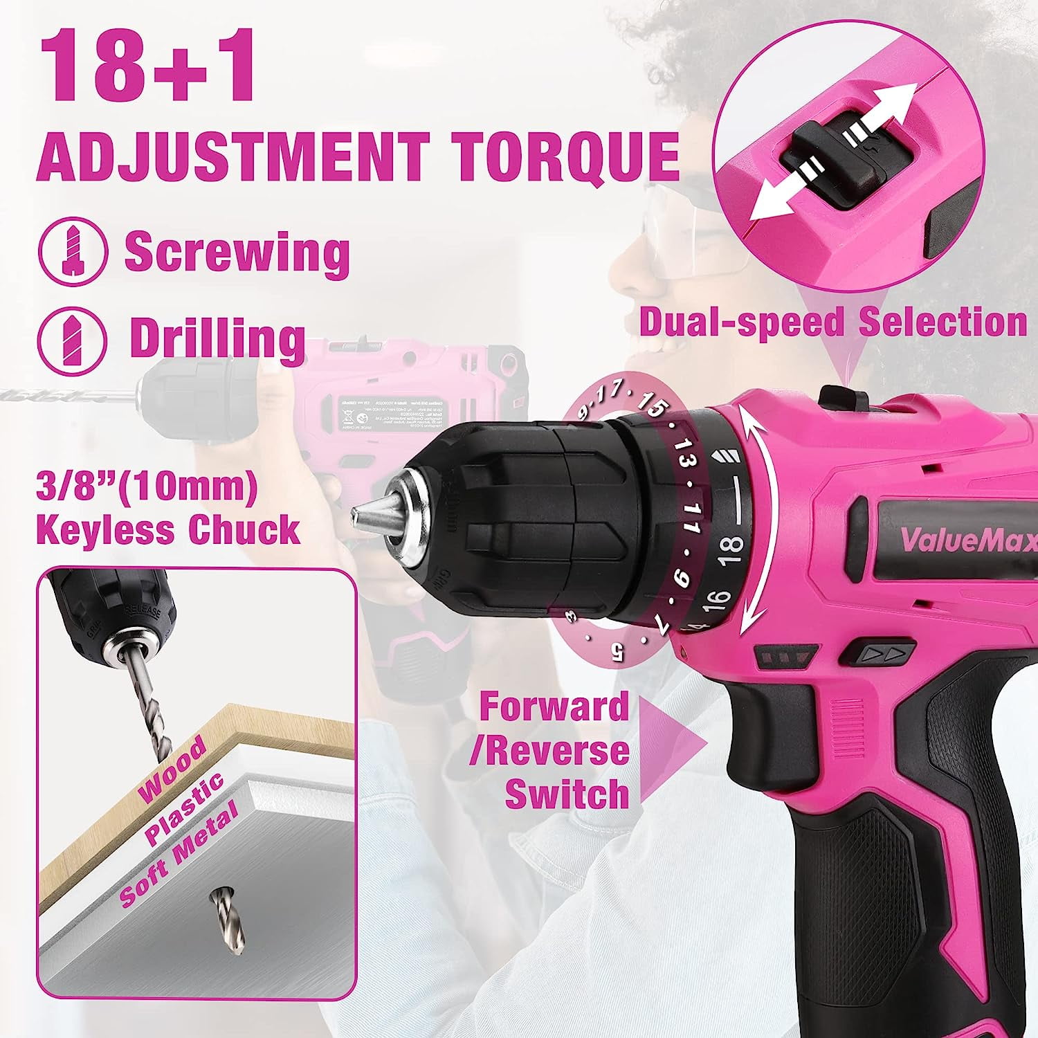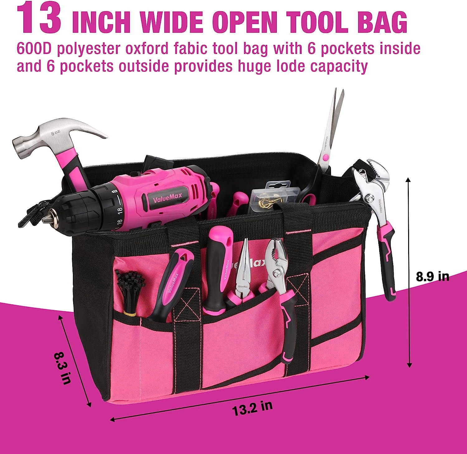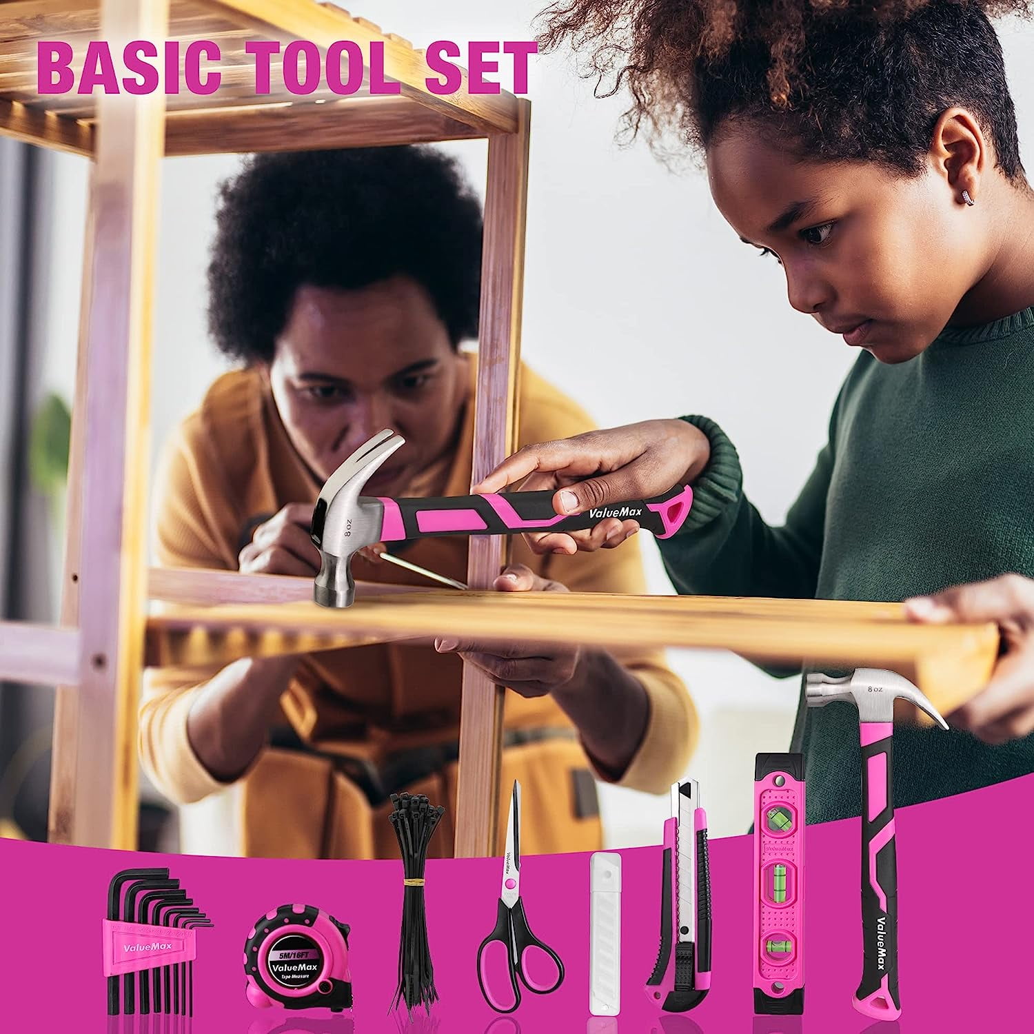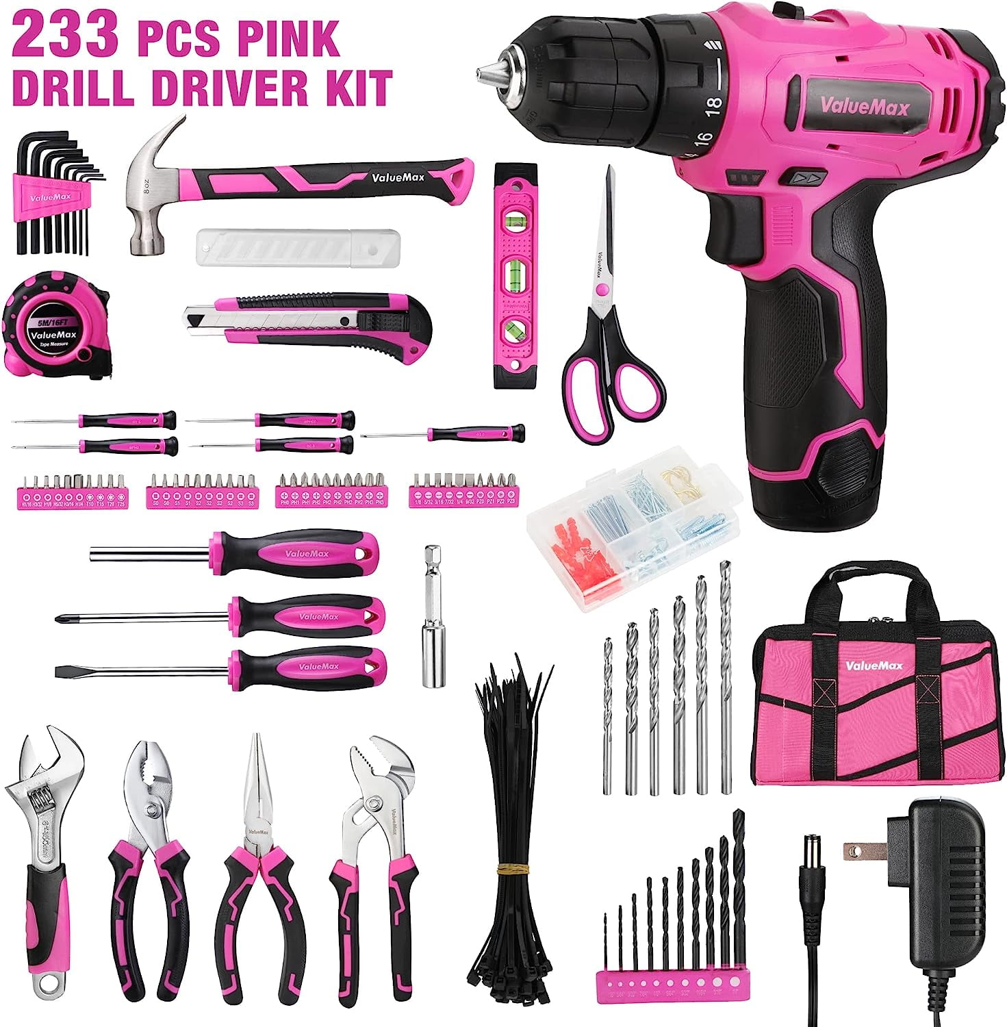 ValueMax 233-Piece Pink Home Tool Kit with Cordless Drill, Lithium-Ion Power Tools Set with Storage Bag, Ideal for DIY, Home Projects & Repairs