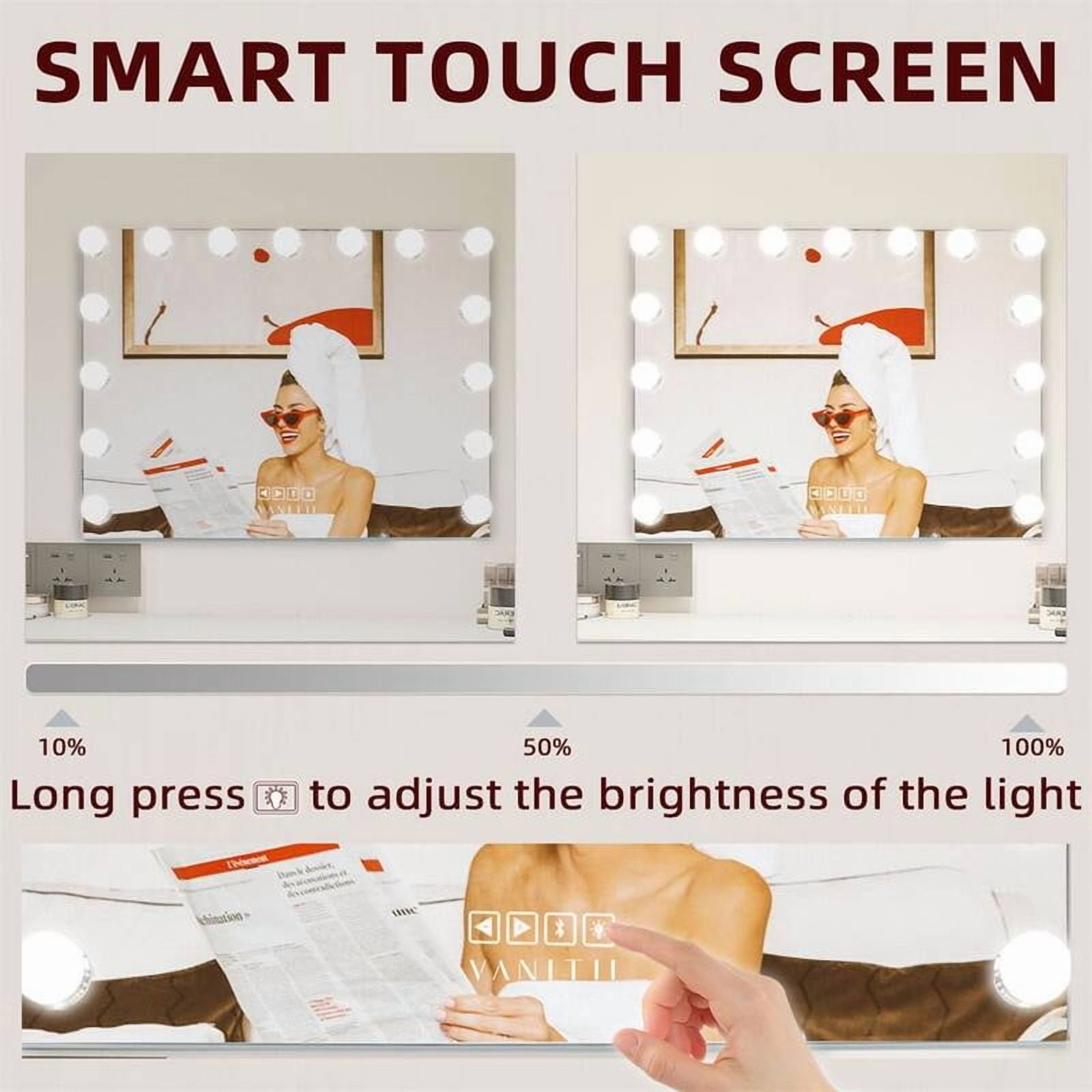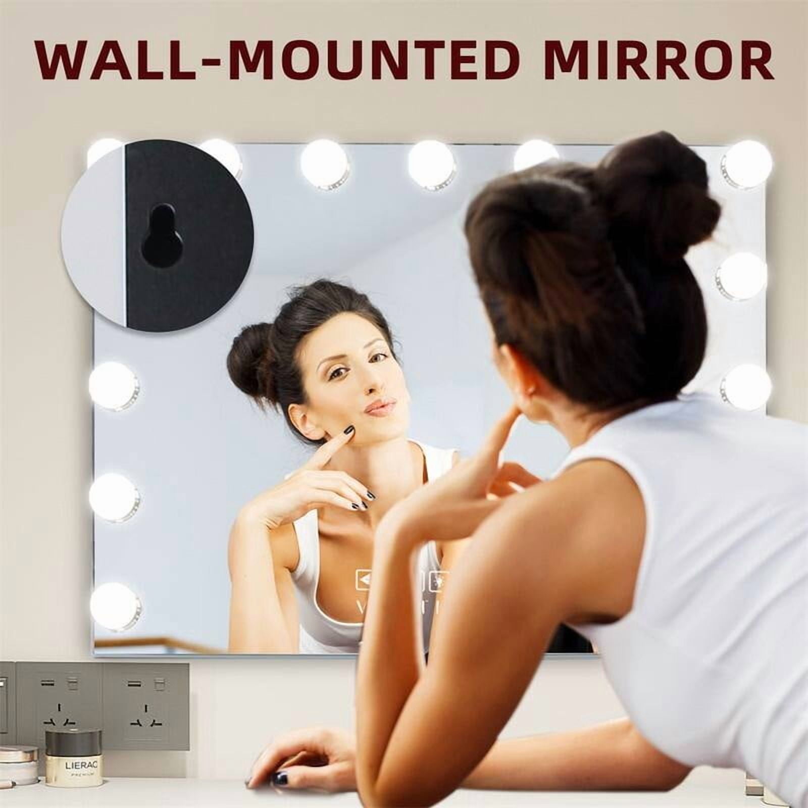 VANITII LLC VANITII Large Hollywood Vanity Makeup Mirror with 15 LED Bulbs 3 Color Lights Bluetooth Tabletop Wall Mount Metal White