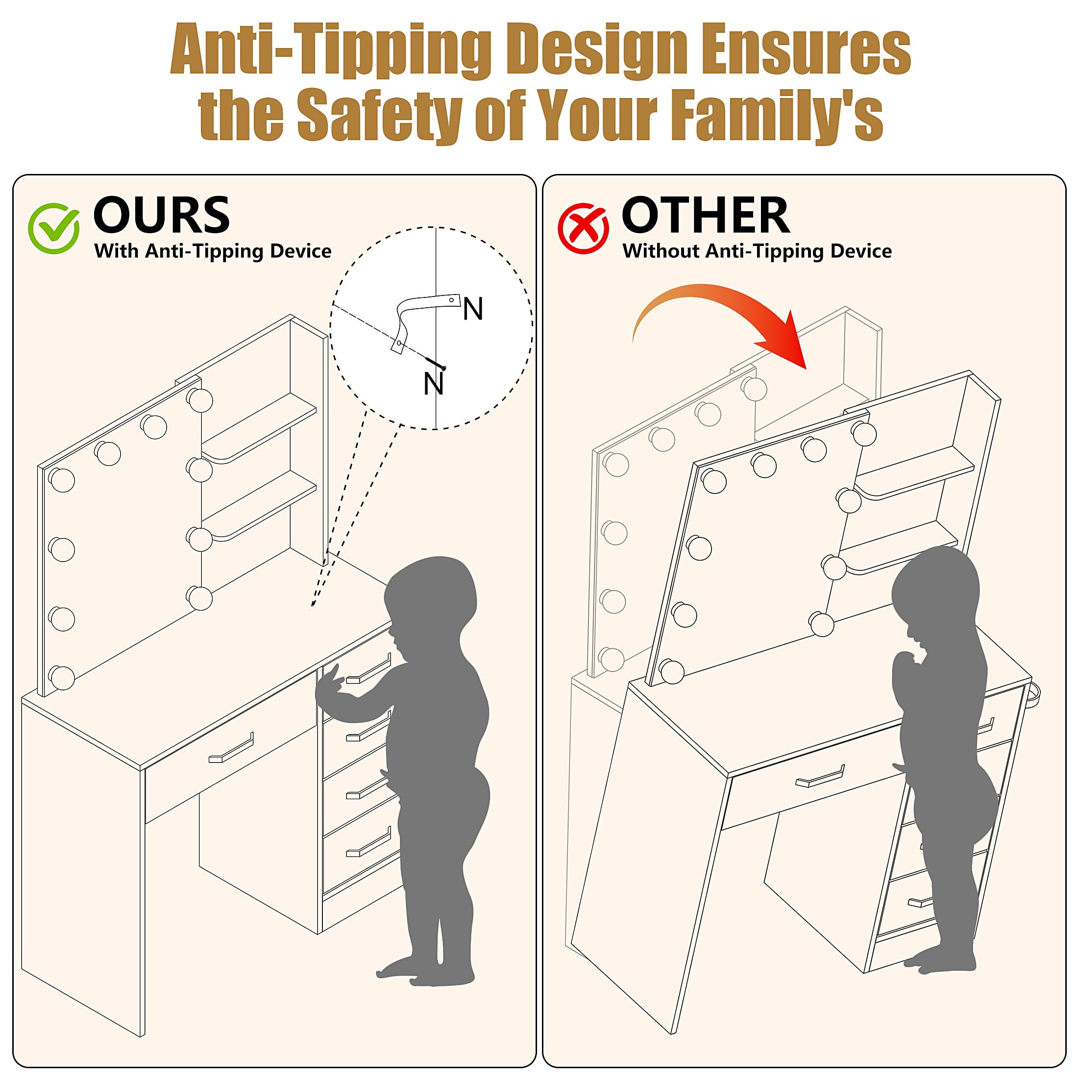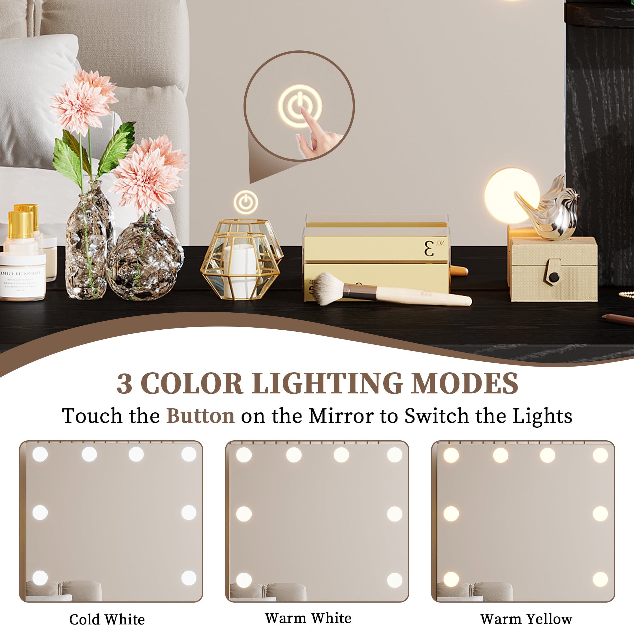 Elevate your beauty routine with our sophisticated vanity sets, featuring a 3-color light mirror that mimics natural sunlight, soft ambiance, or warm evening glow to suit any time of day perfectly. The standout feature of the UHOMEPRO Vanity Desk is its large mirror adorned with 10 bulb lights. The 5 spacious drawers, open shelves, and large desktop offer ample room to store all your beauty products, hair tools, and accessories. The drawers glide smoothly and the cabinet is spacious enough to hold larger items, ensuring everything has a dedicated home and stays organized. The included vanity stool is designed for comfort and style, featuring a padded seat and sturdy base that provides stability and support. Its sleek design complements the vanity set perfectly, creating a cohesive and polished look in your bedroom or makeup area. Specifications: Product Name: Makeup Vanity Set Main Material: Particle Board Color Option: White/Black Number of Drawers: 5 Product Size: 33.46 x 14.17 x 51.17 in(L x W x H) Product Weight:71.65lbs Package Weight:76.94lbs 3 Color Lighting Modes: Cool White/Warm White/Warm Yellow Package Includes: 1 x Makeup Vanity Desk 1 x Vanity Stool Instructions Notes: Due to the light or display, the color of the actual product may be slightly different from the picture. Manual measurement was used, and there may be some reasonable errors.