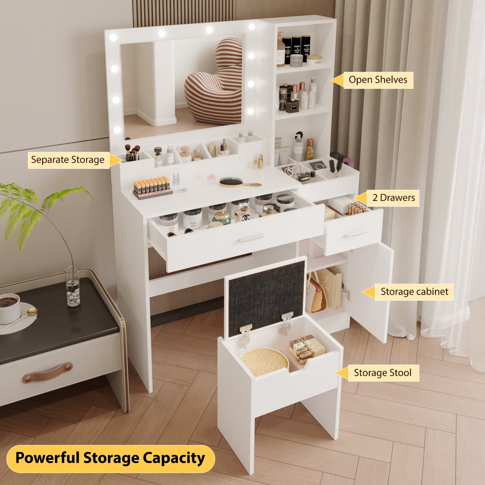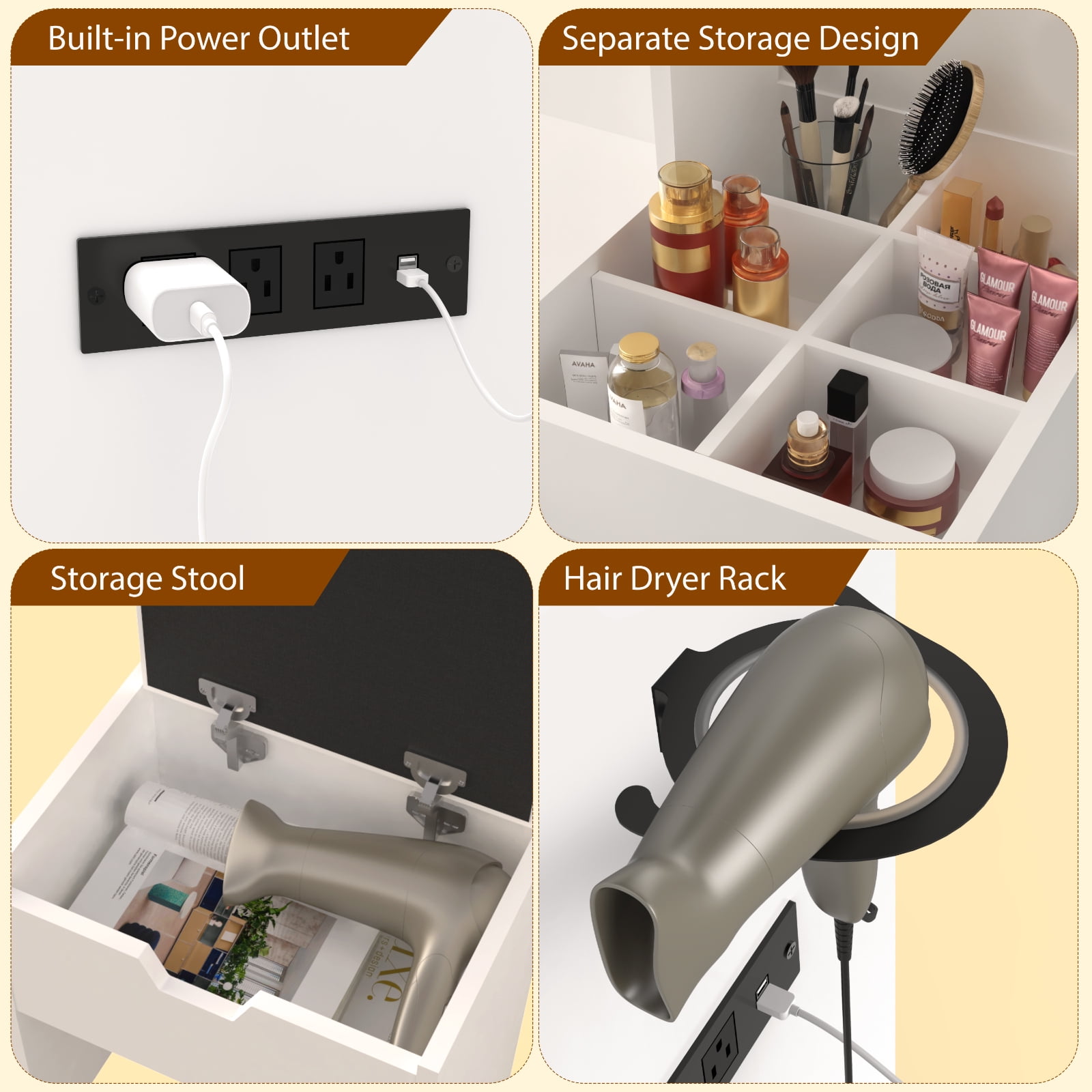 Enjoy 3 adjustable brightness levels for the 10 Hollywood-style plastic light bulbs, offering warm, natural, and cool color modes to suit your preferences. This vanity table features a bright 26×27 inch mirror on top, making it perfectly suitable for all age groups. Ample storage capacity with 2 drawers, three open shelves, a storage cabinet, a storage stool, and a desktop partitioned storage for all your beauty essentials. This vanity desk comes complete with a charging station featuring 3 standard power outlets and 2 USB ports, keeping your devices powered up. A stool is included with the purchase of the vanity table, so you don’t have to pay extra or go through the hassle of finding a matching stool. Effortless assembly with detailed instruction manual, ensuring a hassle-free setup experience, and in case of any issues, simply click “Contact Seller” for prompt and satisfactory solutions. Benefit from dedicated after-sales support, ensuring peace of mind. Our team is ready to assist with any questions or concerns to ensure your satisfaction.