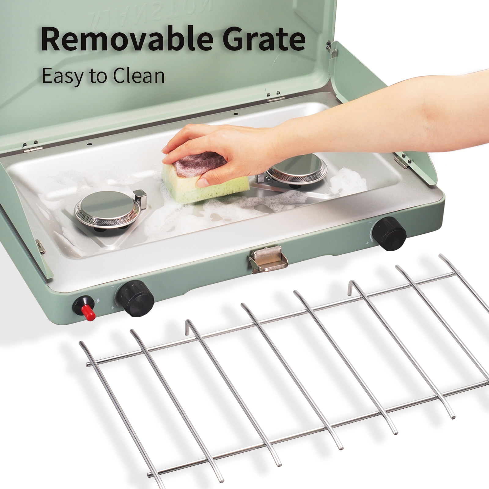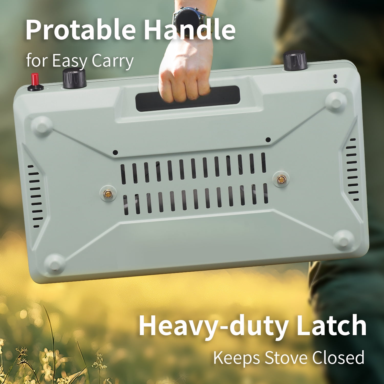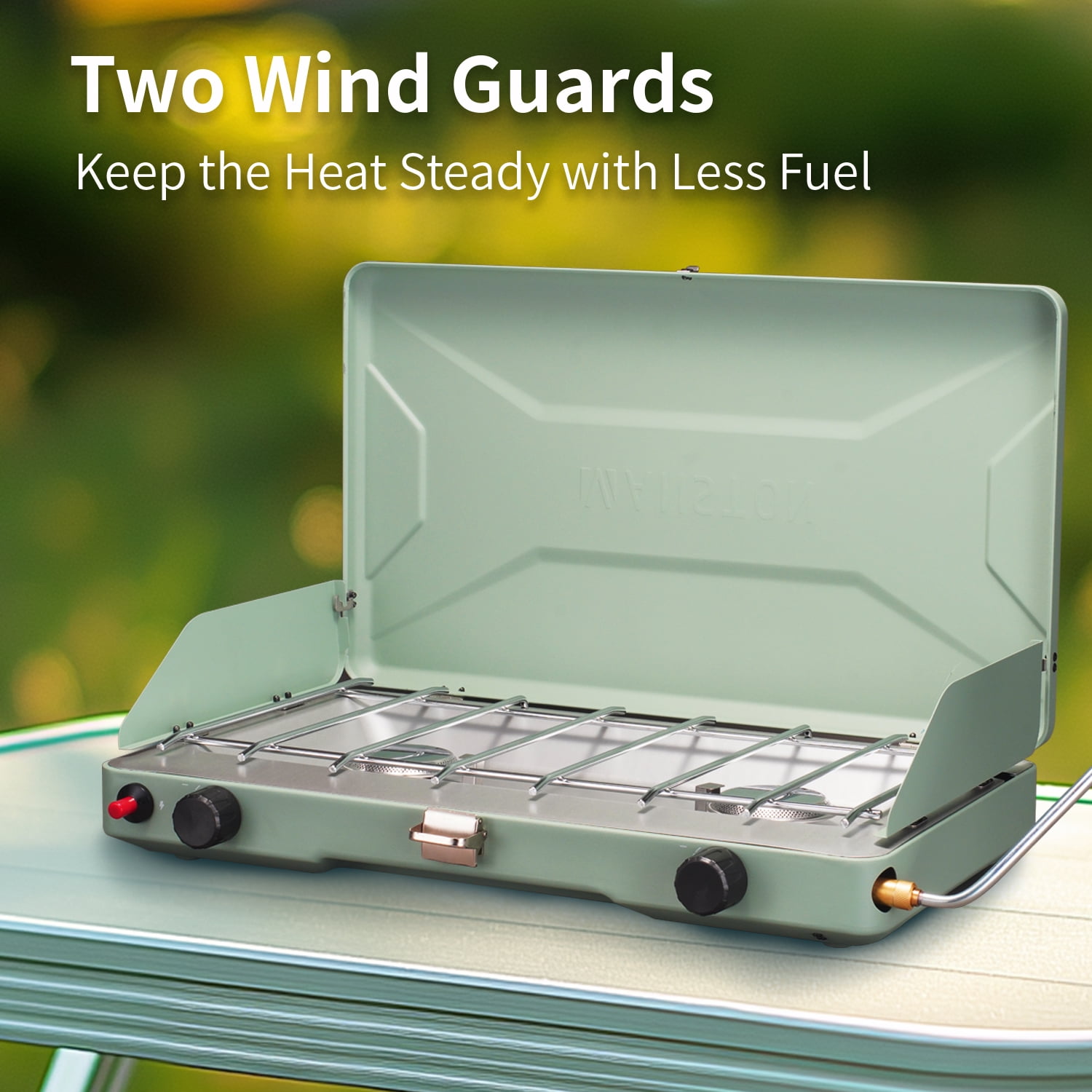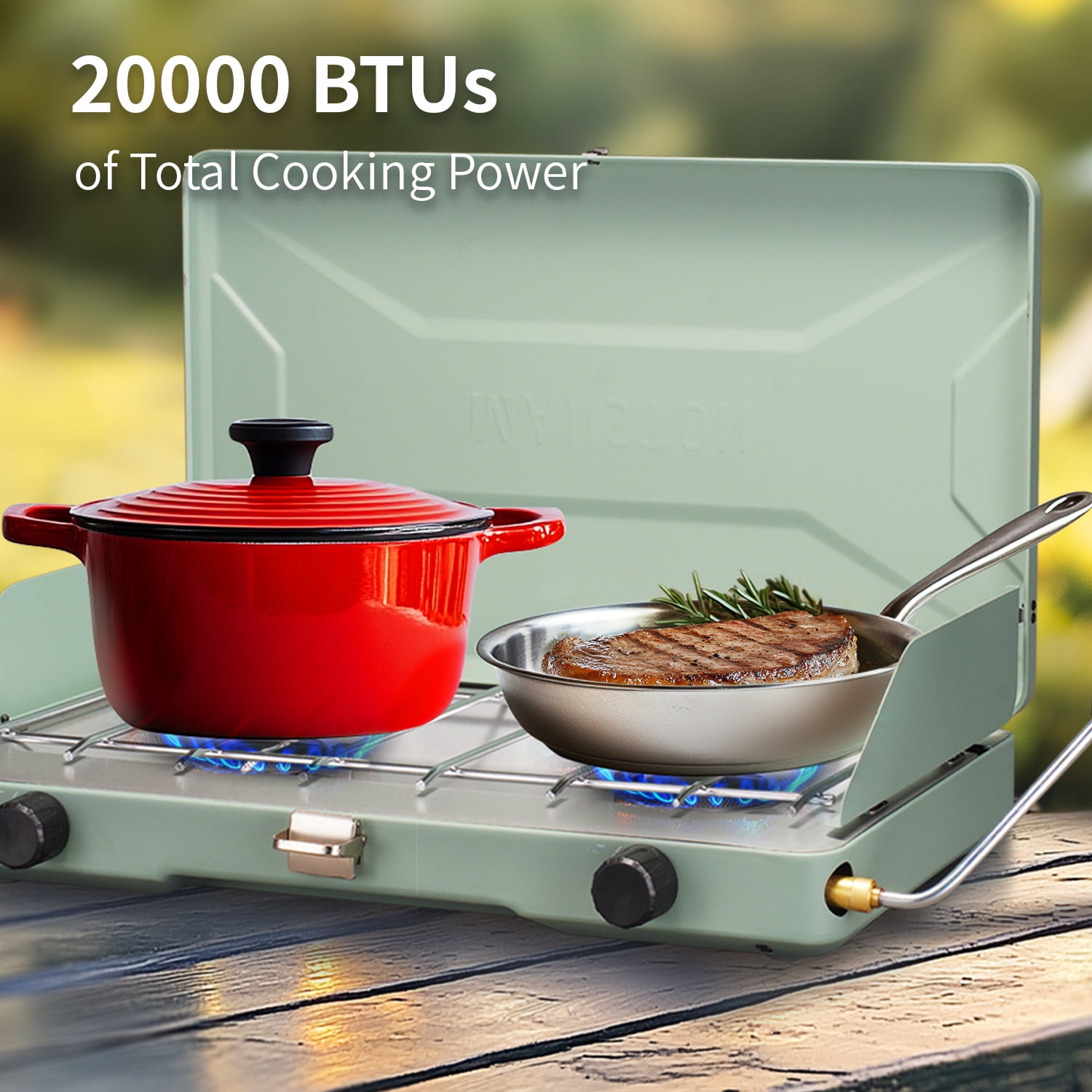 Type:2-Burner Propane Camping Stove Material: Alloy Steel Fuel Type: Propane Power Source: Gas Powered Propane gas grill features 2 burners on each 10,000 BTU, total 20,000 BTUs of amazing outdoor cooking power. Perfect for preparing steaks, burgers, eggs, bacon, sausage, pancakes, coffee, soup, boil water. The 2 wind-blocking panels can fix with the lid cover, which creating a 3-side windshield protection against the elements for chefs during camping, hiking, picnicking, tailgating. Each burner is controled independently by improved knob rotation for precise temperature adjustment. Our spacious burner fits a 12-inch and 10-inch pan at the same time. PLEASE TURN ON THE KNOB FIRST BEFORE START TO IGNITION. Only 4 steps to begin your camping stove, open the cover and lock to the windshield, tighten up the pressure regulator between the stove and gas, turn on the knob and start to ignite. Chrome-plated grate is removable for easy clean up, aluminized steel cooktop is rust-resistant. Briefcase size with Handle for Stress-Free Travel. Open Size: 20.9(L)x13(W)x14.8(H) inches, Close Size: 20.9(L)x13(W)x3.8(H) inches. Unit Weight: 8.5LB. Easy to open and keeps the stove closed when not in use. Durable, chrome-plated grate is removable for easy cleanup. For precise temperature and simmering control of two independently adjustable burners. Up to 1 hour on high on one 16 oz. propane cylinder (sold separately) Included Components: Stove, Grill/Griddle Plate