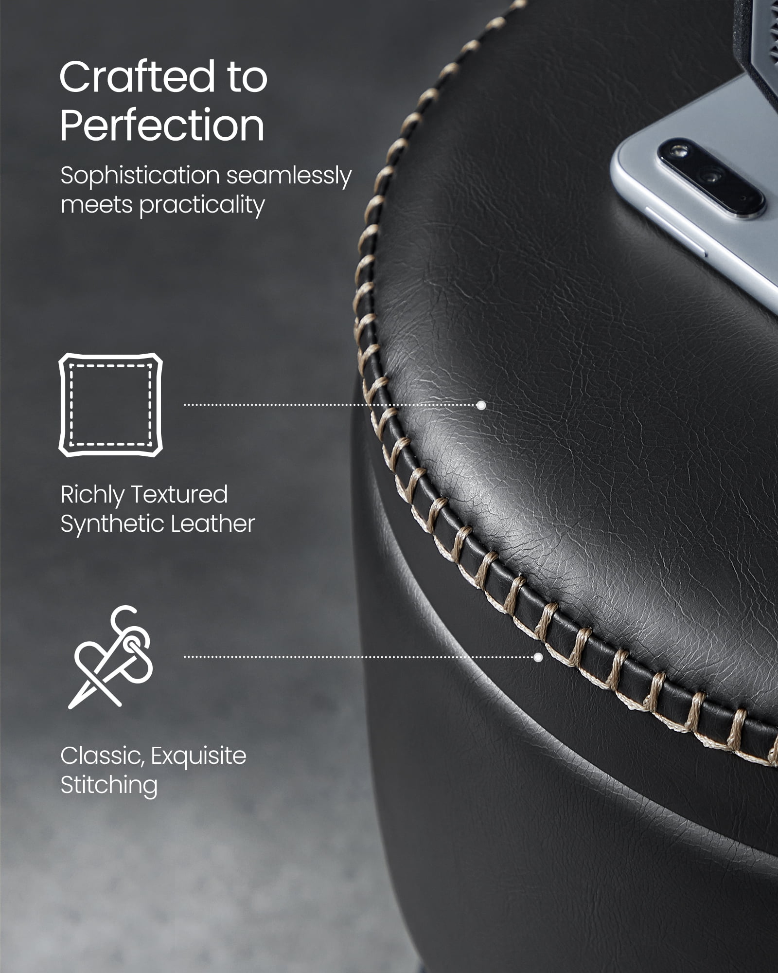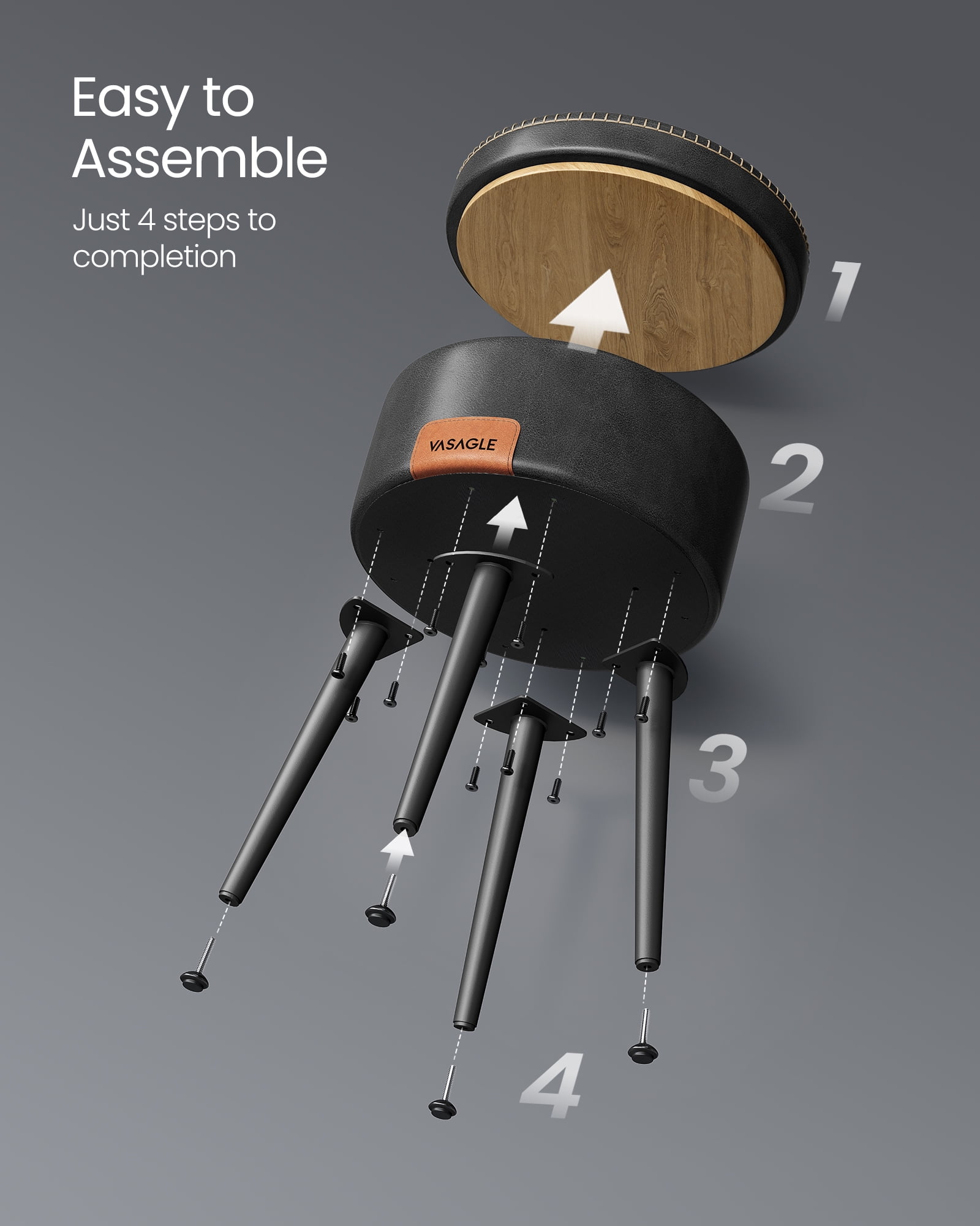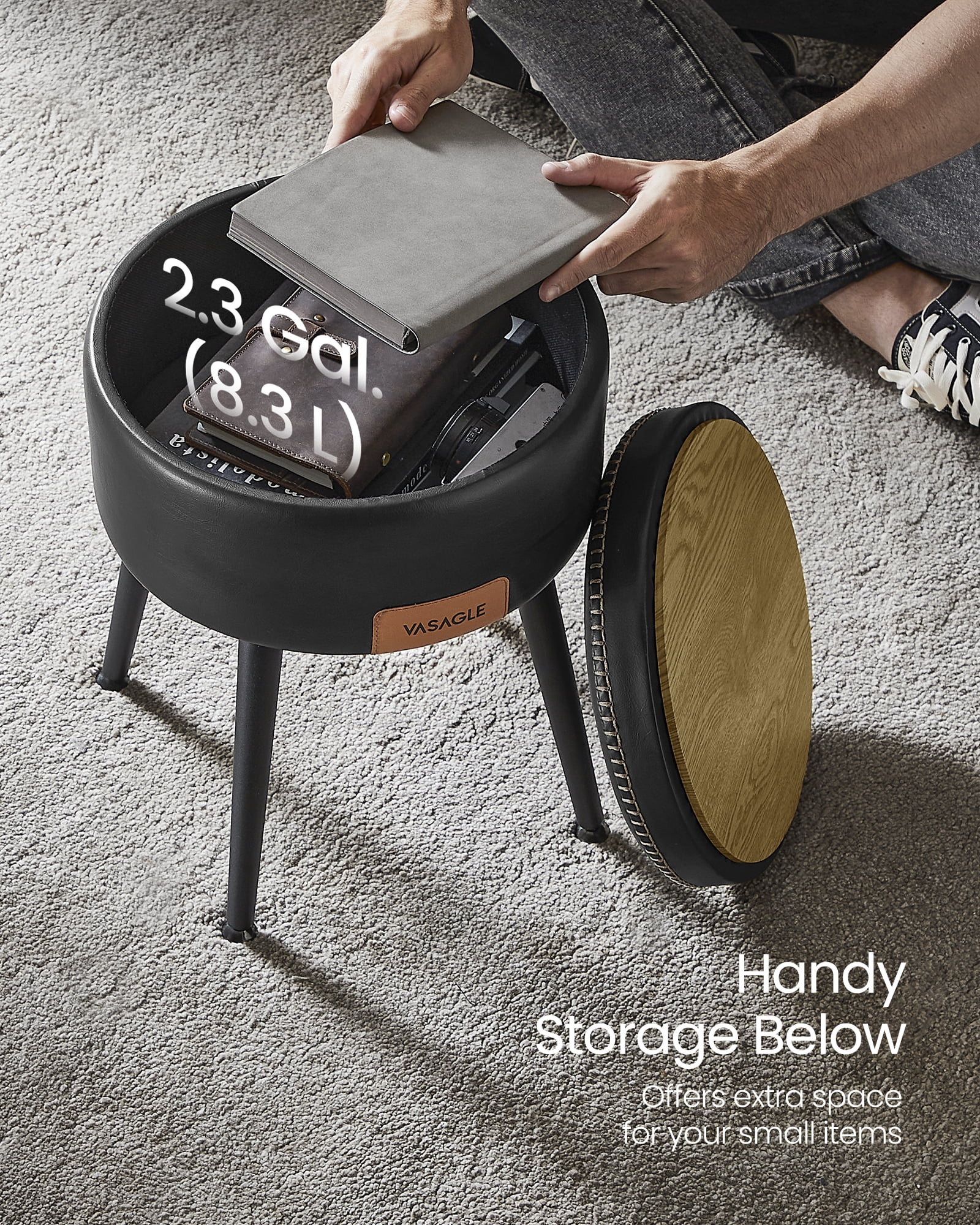 Stylish and Functional: Elevate your space with the EKHO Collection Storage Ottoman, a versatile and chic addition that serves as a vanity chair, stool, and round storage seat. Premium Synthetic Leather: Crafted with high-quality synthetic leather and detailed stitching, this ottoman offers a luxurious feel while providing durability for long-lasting use. Steel Legs for Stability: Supported by 4 sturdy steel legs, reinforced with a 1.2 mm thickened wall, and swivel leveling feet, this storage ottoman can bear a weight load of up to 330 lb, ensuring stability and reliability in everyday use. Comfort at Every Sit: Glide your hand over the smooth cover, then sink into the supportive 1.6″ (4 cm) thick, 25D high-resilience foam. This vanity stool provides a comfortable seat that will stand the test of time without deformation Easy Assembly, Effortless Cleaning: Assembly is a breeze?simply attach the legs and your storage ottoman is ready for use. As for cleaning? The high-quality synthetic leather surface makes it a cinch! Color: Ink Black Material: Steel, 25D High-Resilience Foam, PU (Polyurethane) Leather, Plywood Product Size: 12.6″Dia. x 17″H Product Weight: 7.3 lb Max. Overall Static Load Capacity: 330 lb 1 x Storage Ottoman 1 x Accessory Kit 1 x Instructions
