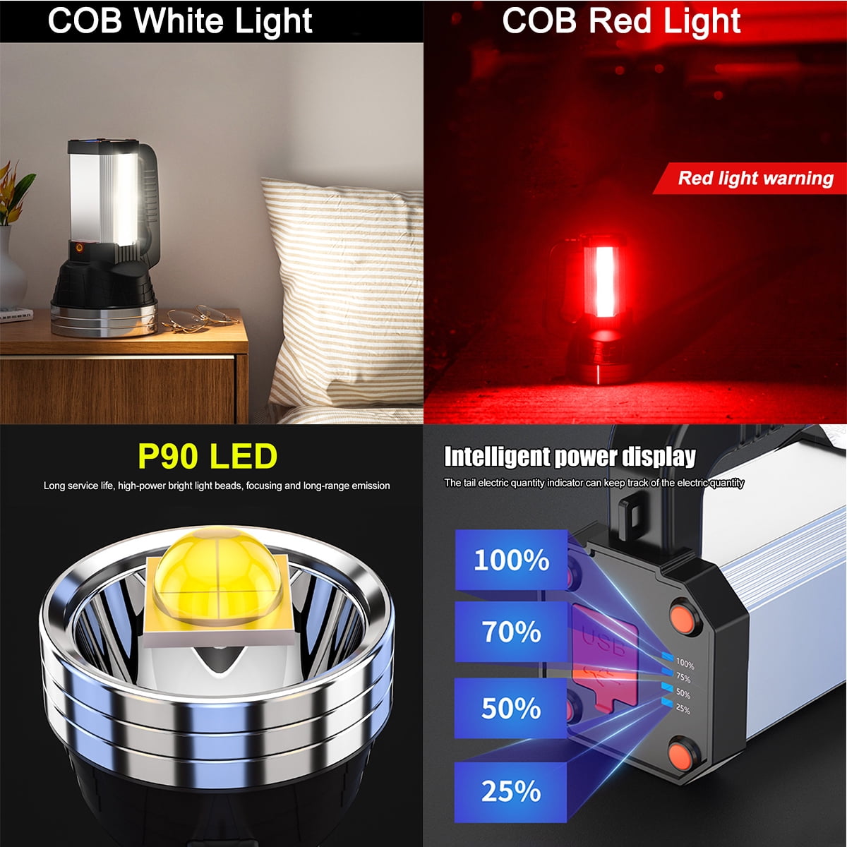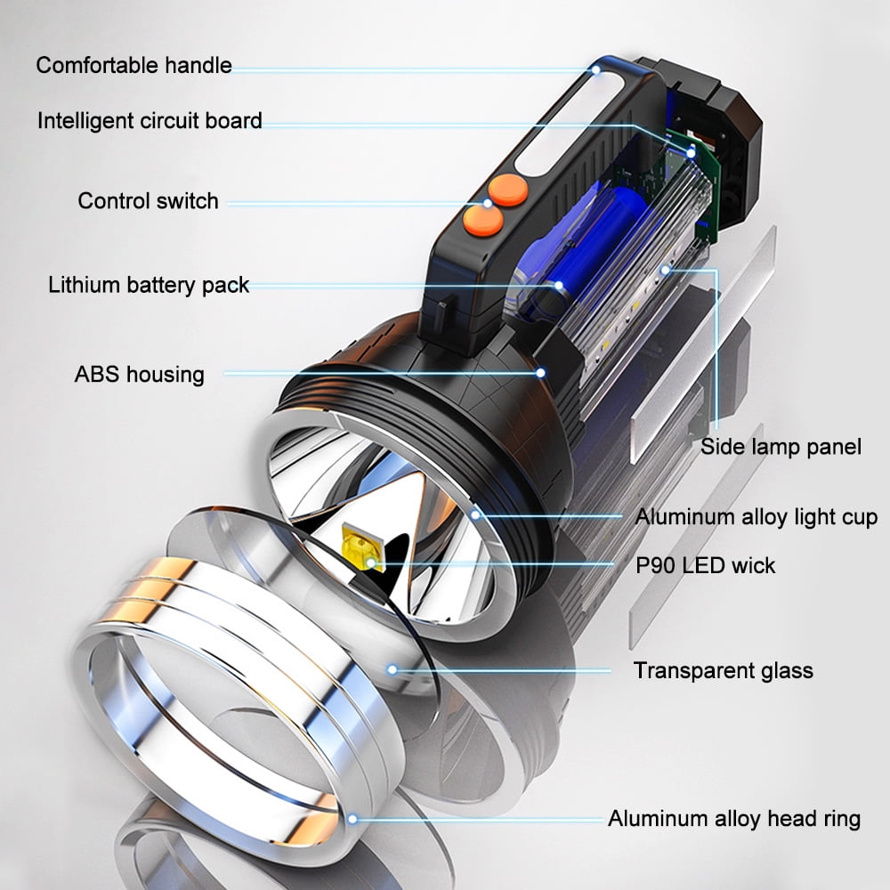 Vastfire 10000 lumens ultra-bright portable spotlight an upgraded vision of the market similar appearance’ spot light, higher lumens and bigger capacity power pack, longer runtime to 10 hours. most powerful flashlight utilizes xhp90.2 led, max beam distance 1870feet(570 meters).the searchlight can easily light up a football field, with table lamp and power bank function, best for emergency lighting, fishing,camping, excursion,exploration, search and rescue, hiking. Easy carry shoulder strap, green red lens, and tripod are included Vastfire Best hunting spotlight with Red & Green filters for shining deer, Predator Spotlights (Best Coyote Hunting Lights) to brighten up the entire field, light the way as you search for firewood, scare away predators from camp, ultimate long throw flashlight for long distance game viewing, best spotlight to locate the hunt at a marginal distance, hunting flashlight to track wounded animals through the night or go searching for a lost hunter Super Bright LED Rechargeable Spotlight Flashlight Color temperature 5000K(Neutral White), High-efficiency constant current circuit will maintain constant brightness, Multiple Safety Protection: Advanced Intelligent Thermal Protection System, protects LED and components, is safe and reliable, and increases user comfort. Aluminum alloy body, wear-resistant Type III hard-anodized surface, 1-meter impact resistance and IPX7 waterproof rating, IPX7 means it can be washed with water from all angles and soaked for a short time. suitable for outdoor activities in light rain or snow Multi-functional high-end outdoor camping flashlight with 3 strong light modes: Brightest, Bright, and strobe, Two brightness settings offer you the flexibility to choose the optimum brightness settings according to the nature of the work, well suited for outdoor rescue, patrol, travel, night walking, fishing, hunting, etc. Built-in large capacity power, can be used as a portable charger, power bank or a mobile power source. 3 hours get a full charge by the USB-C charging cable, saving your time, never be absent in duty, very convenient, never worry about the surrounding darkness, you can immediately take it with your family to travel happily together USB C rechargable handheld spot light with table lamp function:100 lumens foldable side lamp, 150°adjustable light angle, soft reading light, reduce eye strain. It can also be your night light, work light. The additional bright COB light that is suitable for reading, camping, car repairing and other activities, Ultra bright flashlight lantern combo with red light specially designed for outdoor application,the red flashing light feature is very useful for calling for help or alerting people if your car breaks down or runs out of power. Easy Carry Shoulder Strap Handheld Headlamp Carry With Shoulder Straps To Free Your Hand, Front Headlights illuminate long range, Make it a good flashlight for walking dogs, outdoor camping, hunting, boating The pistol-styled grip of this spotlight is super comfortable to hold, and use. very easy to carry around. In addition, there is also the tripod-stand that comes in very handy for hands-free operation. can be directly mounted to a tripod, turning it into a camp light or a fixed supplementary light, and stands for hands-free which is the best work light for hiking, camping, sailing & hunting Handheld spotlights are an important piece of equipment in every emergency kit or camping supplies. Because of its bright lumen output and wide illumination area, they are also used in workplace or job sites at nights. They are small, portable, and light in weight so you can store and carry them around easily, Be it worksite at night, evening hike, camping, fishing, or boating, a handheld spotlight is an absolute must-have