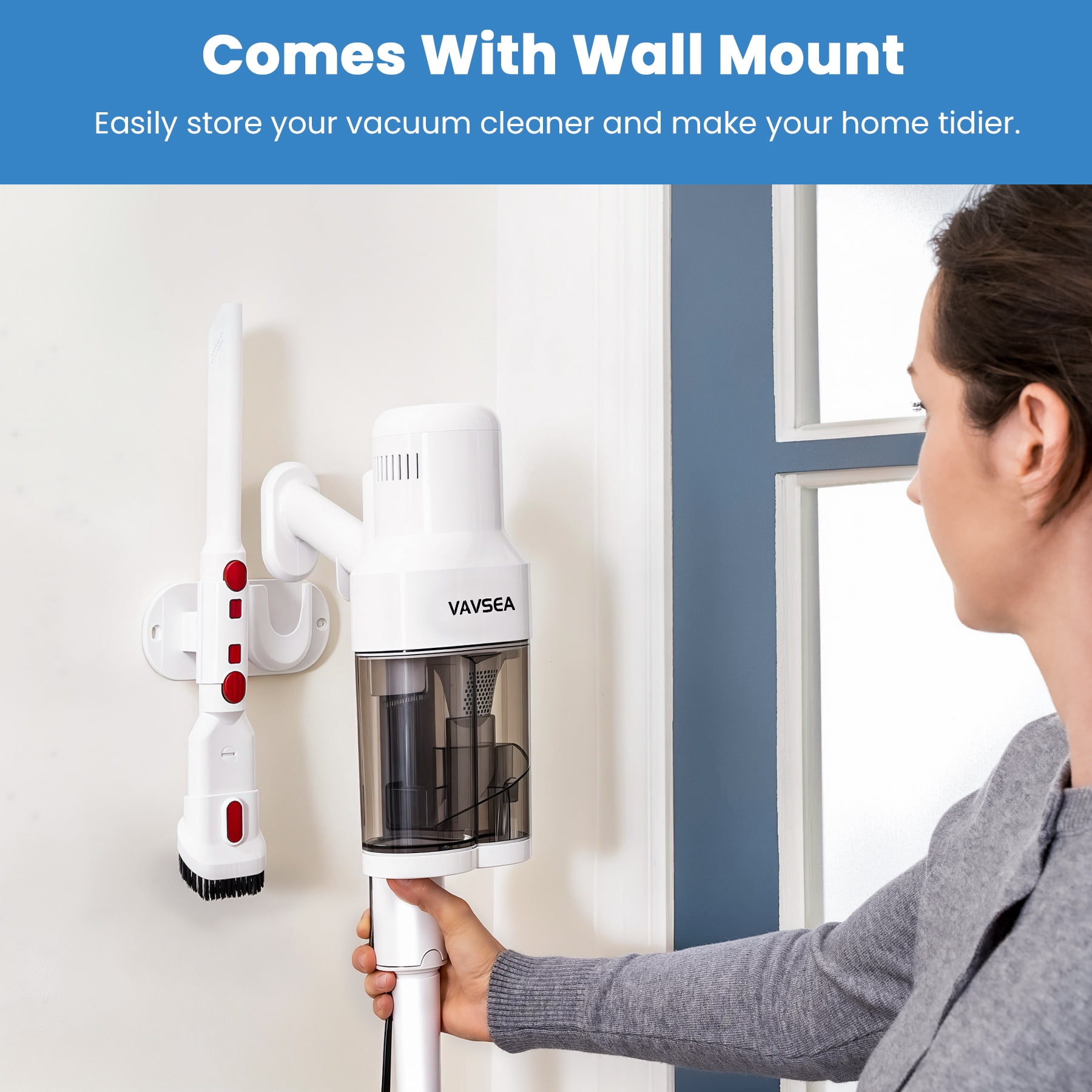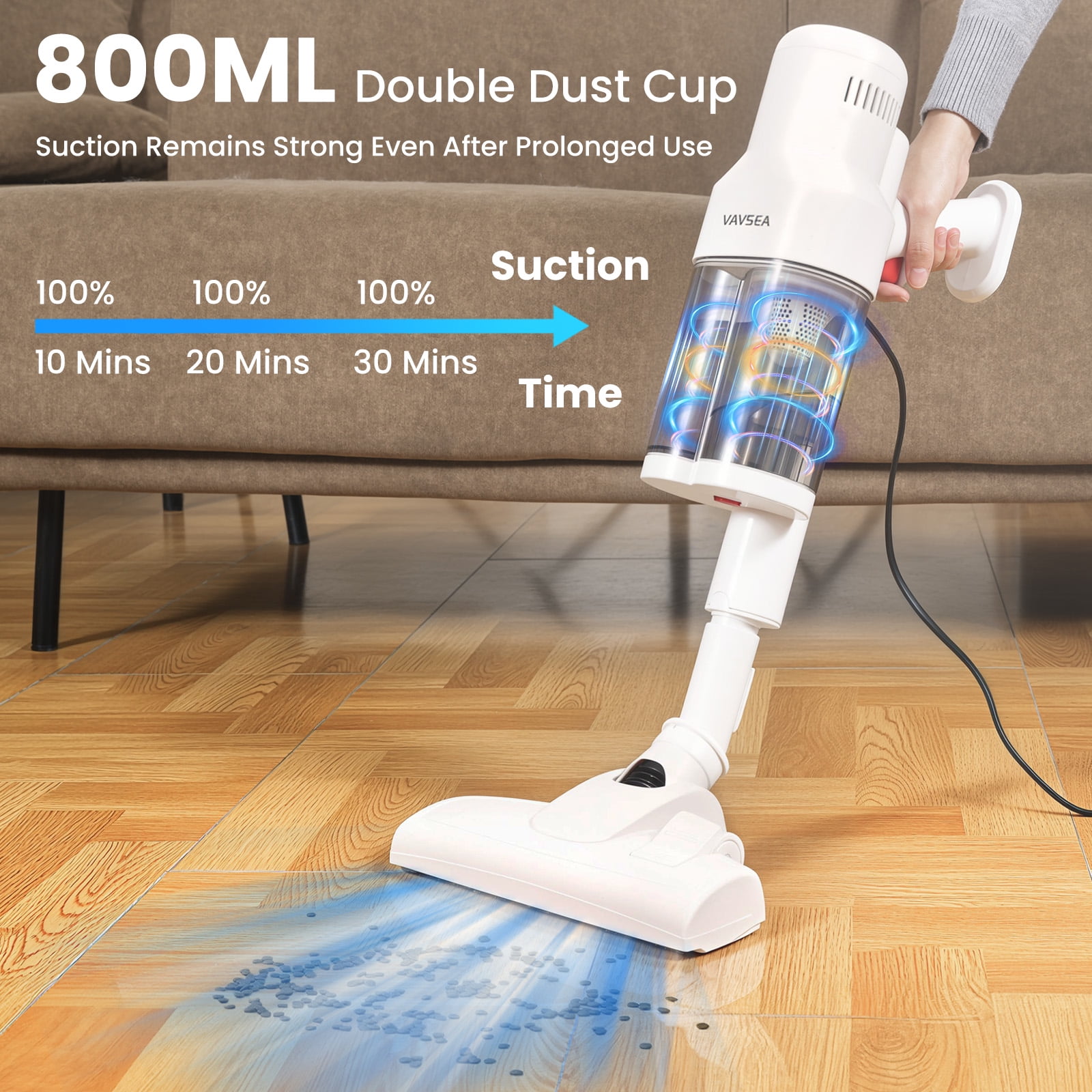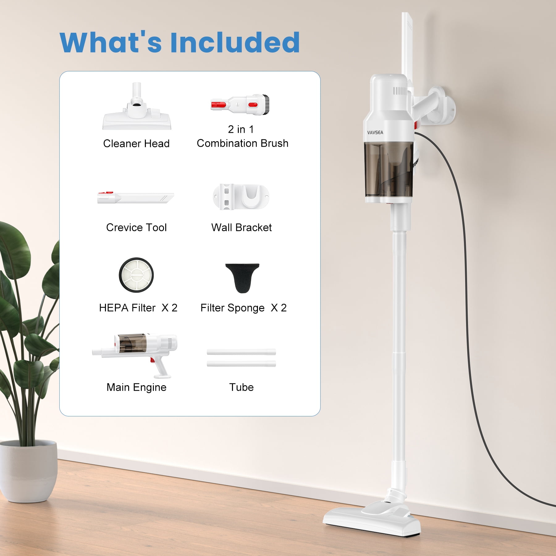 800ML Dual Dust Cup: The VAVSEA vacuum cleaner features a dual dust cup design that separates larger particles to maintain strong, consistent suction by preventing blockages. 16Kpa Powerful Suction with Rubber Brush: Equipped with a 600W motor, this vacuum cleaner for home efficiently cleans hard floors and low-pile carpets, while the extendable rubber brush enhances pet hair and dust removal. Cyclonic Design & 6-Stage Filtration: The household vacuum cleaner’s cyclonic separation technology effectively separates dust and debris, preventing filter clogs. The 6-stage filtration system also prevents dust from entering the motor and extends the stick vacuum’s lifespan. Versatile Cleaning Accessories: This lightweight corded vacuum cleaner Includes a crevice tool and 2-in-1 brush for pet hair, sofas, windows, and more, with extra washable HEPA and sponge filters for lasting suction. 16.4ft Long Cord: The 16.4ft long cord allows you to clean larger areas without frequent outlet changes. Comes with a wall mount for easy storage. One-click Dump Design: The handheld vacuum cleaner’s dust cup employs a one-click dump design at the bottom, allowing you to dispose of the trash without any contact. Specification: Color: White Is Cordless: Yes Capacity:800ML Length of Cord:16.4 FT Wattage:600W Suction:16Kpa Item Weight:6.6 lbs Recommended Uses For Product: Hard Floor, Carpet Included Components: Vacuum Main Body (Main Motor & HEPA Filter & Sponge Filter ) x 1 Cleaner Head x 1 2 in 1 Combination Brush x 1 Crevice Tool x 1 Wall Bracket x 1 An Extra Sponge x 1 An Extra HEPA Filter x 1 User Manual x 1