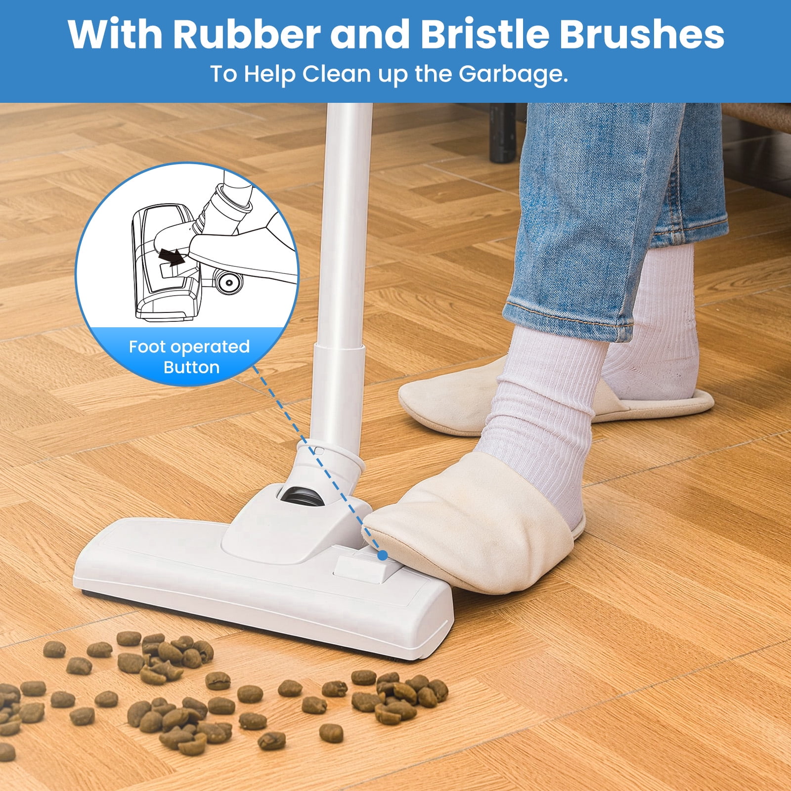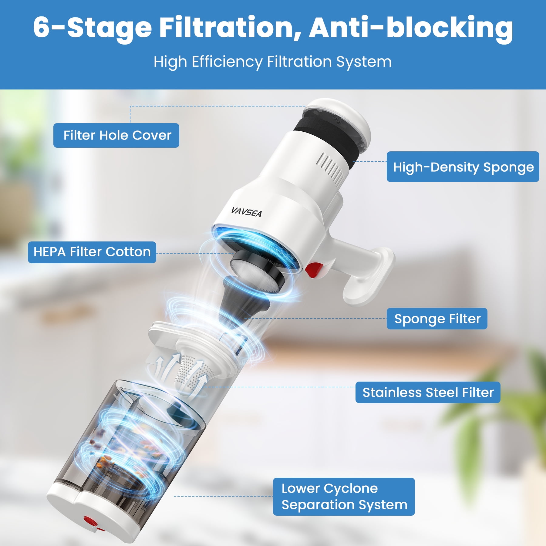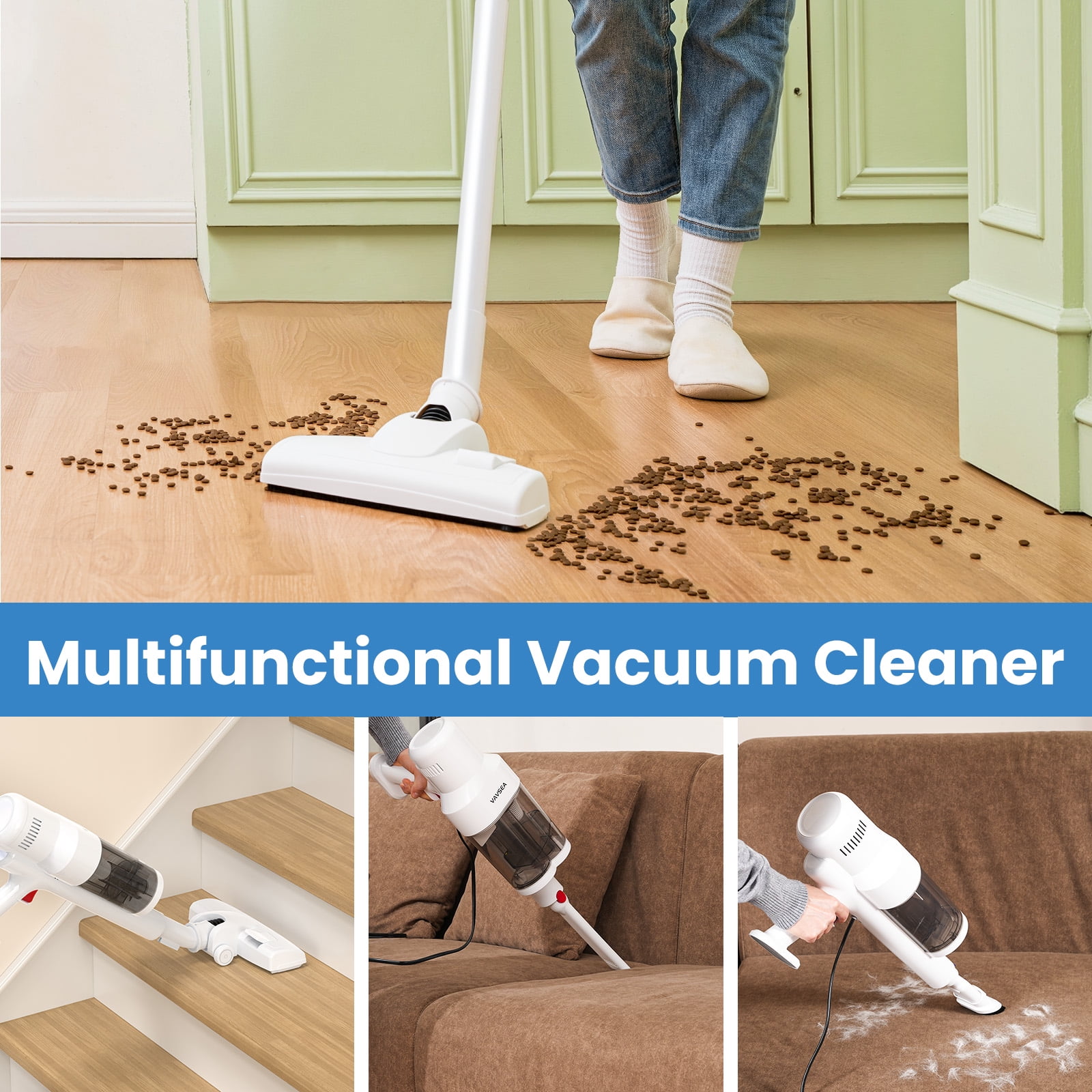800ML Dual Dust Cup: The VAVSEA vacuum cleaner features a dual dust cup design that separates larger particles to maintain strong, consistent suction by preventing blockages. 16Kpa Powerful Suction with Rubber Brush: Equipped with a 600W motor, this vacuum cleaner for home efficiently cleans hard floors and low-pile carpets, while the extendable rubber brush enhances pet hair and dust removal. Cyclonic Design & 6-Stage Filtration: The household vacuum cleaner’s cyclonic separation technology effectively separates dust and debris, preventing filter clogs. The 6-stage filtration system also prevents dust from entering the motor and extends the stick vacuum’s lifespan. Versatile Cleaning Accessories: This lightweight corded vacuum cleaner Includes a crevice tool and 2-in-1 brush for pet hair, sofas, windows, and more, with extra washable HEPA and sponge filters for lasting suction. 16.4ft Long Cord: The 16.4ft long cord allows you to clean larger areas without frequent outlet changes. Comes with a wall mount for easy storage. One-click Dump Design: The handheld vacuum cleaner’s dust cup employs a one-click dump design at the bottom, allowing you to dispose of the trash without any contact. Specification: Color: White Is Cordless: Yes Capacity:800ML Length of Cord:16.4 FT Wattage:600W Suction:16Kpa Item Weight:6.6 lbs Recommended Uses For Product: Hard Floor, Carpet Included Components: Vacuum Main Body (Main Motor & HEPA Filter & Sponge Filter ) x 1 Cleaner Head x 1 2 in 1 Combination Brush x 1 Crevice Tool x 1 Wall Bracket x 1 An Extra Sponge x 1 An Extra HEPA Filter x 1 User Manual x 1