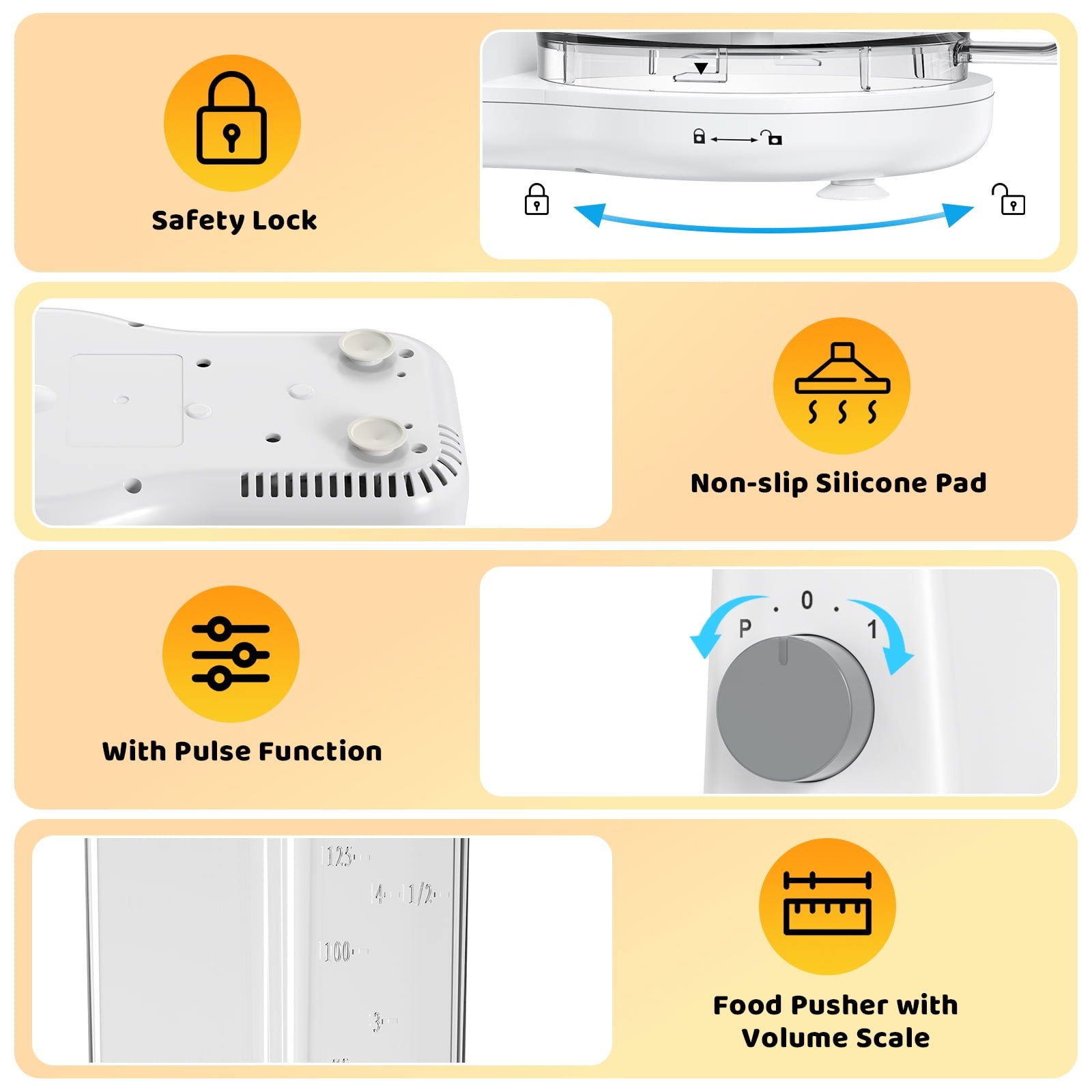 Enhance Your Culinary Experience: Elevate your cooking endeavors with the Authentic and Professional multifunctional food processor set. This comprehensive kit boasts a slicer/shredder & S Blade, enabling you to effortlessly mash nuts, shred vegetables/fruits, chop meat, and more, all within the convenience of a single machine. Convenient Separable Design: The S-Blade, Slicer, or Shredder attachments can be easily removed for thorough cleaning, ensuring impeccable hygiene. Say goodbye to stuck food as the design allows for smooth pouring after processing, guaranteeing hassle-free meal preparation. Precision in Portion Control: The included food pusher with a clear and accurate capacity scale mark simplifies portion control, enabling precise ingredient measurement and perfect ratios. This user-friendly feature mitigates the risk of errors, preventing waste and guaranteeing successful outcomes Engineered for Performance and Safety: Experience peace of mind with the Electronic Overload Protection feature, safeguarding the motor from overheating during intensive tasks. Four silicone rubbers securely anchor the processor to countertops for utmost stability. Efficient and Quiet Operation: The Quiet Powerful Motor of this food chopper blender food processor,ensures swift and efficient food processing. This energy-efficient design significantly reduces meal prep time, catering perfectly to your home cooking needs. Streamlined Cleanup: Simplify your post-cooking routine with the convenience of Dishwasher Safe Parts. Blades, bowl, and lid can be effortlessly cleaned in the dishwasher, while BPA-free materials guarantee food safety.