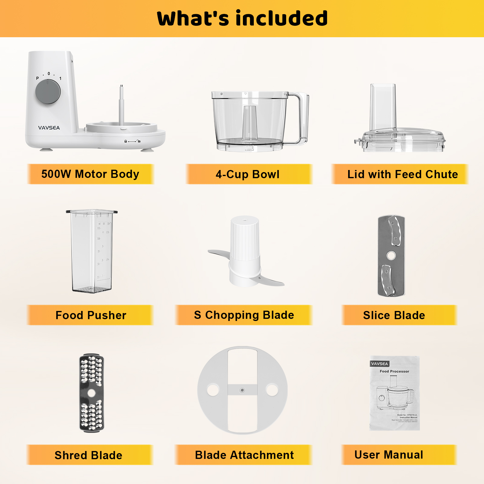VAVSEA Food Processor and Vegetable Chopper for Dicing, Chopping, Mincing, BPA Free, Stainless Steel Blades, White, 4-Cup