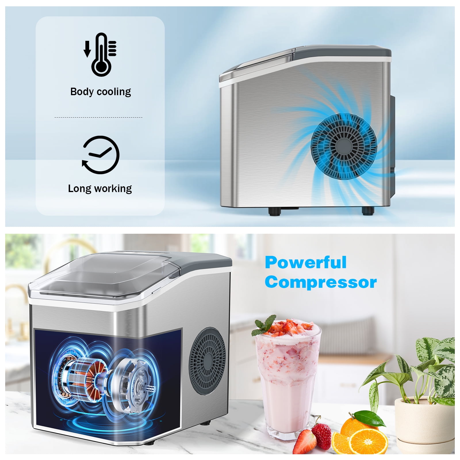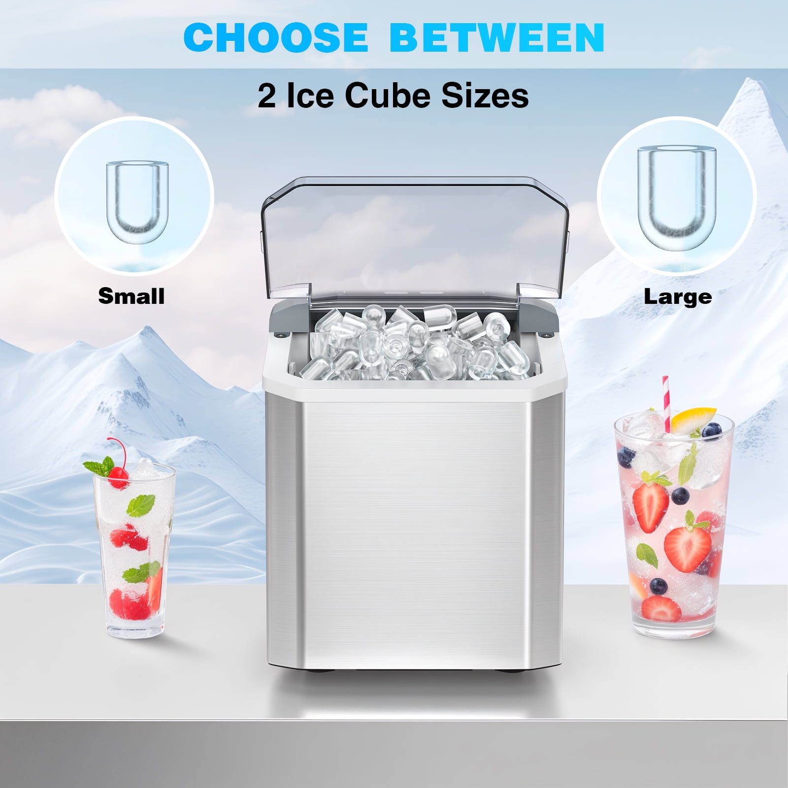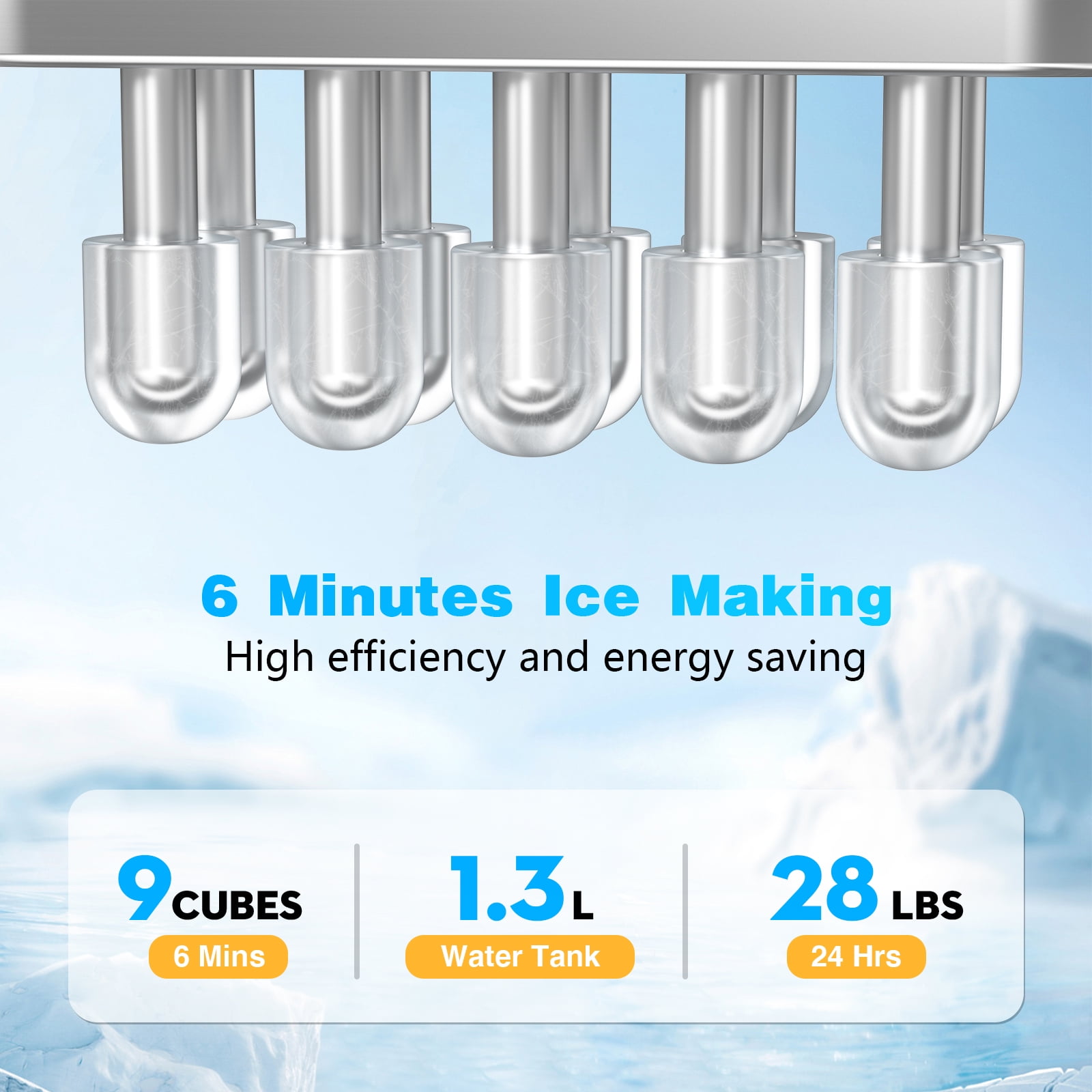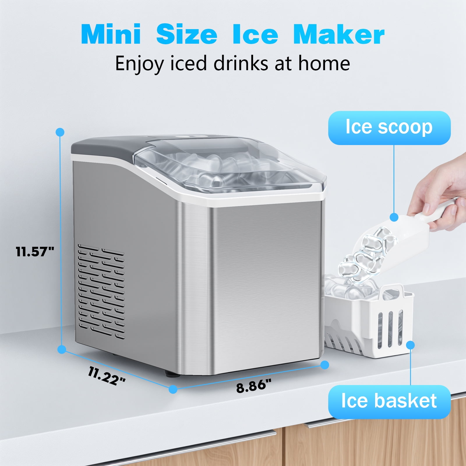 ??6 Mins Effective Ice-Making: Our VAVSEA countertop ice maker only takes 6 mins and you will enjoy the first batch of fresh bullet ice. With a 1.3L water tank and powerful compressor, the portable ice machine easily makes a maximum ice capacity of 28 lbs ice per day, and the ice basket holds up to 1.3 lbs of ice at a time. ??Two Sizes of Ice Cubes: You just need to select L/S on the control panel to have different sizes of bullet-shaped ice cubes. Small ice cubes can refrigerate food, and keep food fresh. Large ice cubes are more suitable for drinks to achieve a quick cooling effect. ??Efficient Compressor & Triple Insulation Design: The VAVSEA Countertop ice cube maker is equipped with a new generation of efficient compressors, achieving low noise while achieving fast ice making. Food-grade ABS, stainless steel housing, and 3 layers of insulation design ensure the ice can be kept for more than 3h. ??Simple Control Panel & Self-cleaning Function: Enjoy fresh ice with 3 easy steps! Fill the reservoir, switch the unit on, then select small or large ice cubes. Additionally, the ice maker machine for home has a one-touch auto-cleaning function. Press the “ON/OFF” for 5s after adding water to run automatic mode for 20mins. ??Small Footprint: This mini small ice maker measures just 11.57 x 8.86 x 11.22 inches. It is small enough to fit on most countertops, ideal for home, office, kitchen, RV, etc. Plus, the transparent window of the portable ice maker allows you to easily monitor the ice-making process. ??️Specification: Power : 120V/60Hz Daily Output : 28 lbs/day Ice-making Cycle : 6-8 mins Water Tank Capacity : 1.3L Ice Basket Capacity : 1.3 lbs Material :Stainless Steel Item Weight : 14 lbs Product Dimensions : 11.57 x 8.86 x 11.22 inches Package Includes : Ice maker x 1, Ice basket x 1, Ice scoop x 1, User manual x1 Additional Feature: countertop ice maker,ice machine,ice maker freezer,portable ice maker,small ice maker,ice cube maker,home ice maker.