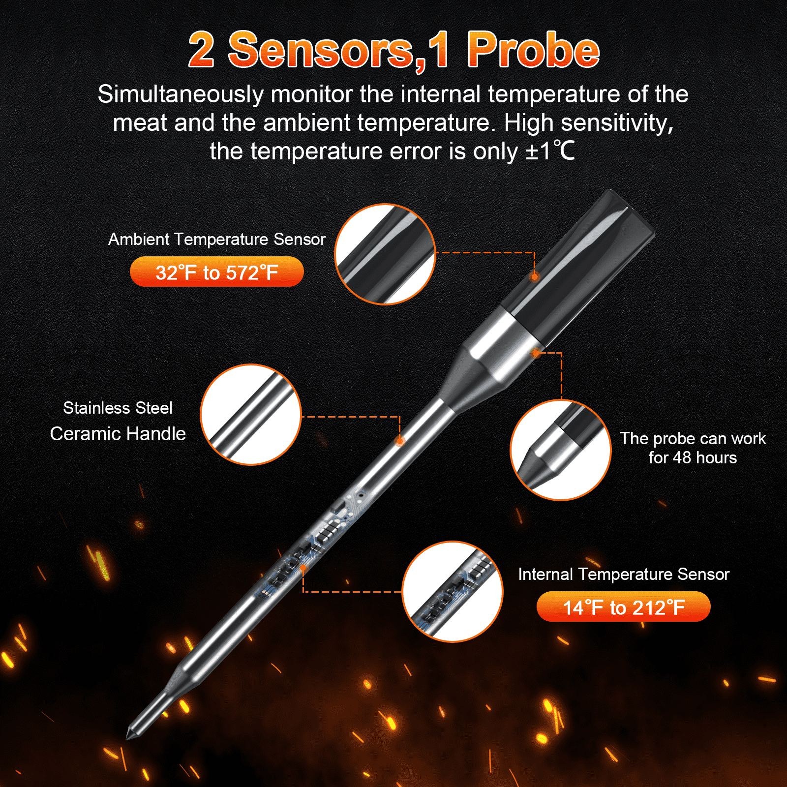 1 probe, 2 sensors: This meat thermometer digital has 2 sensors, 1 probe, which can monitor the internal temperature of meat and the ambient temperature at the same time. Ambient temperature range is 32℉ to 572℉, internal temperature range is 14℉ to 212℉. Portable & Easy to Store: VAVSEA meat thermometer features a compact design (7.1″ x 2.7″ x 1.1″) and a strong rear magnet, allowing for easy attachment to grills. It also includes a charger and a convenient storage box, making it perfect for on-the-go grilling and easy storage at home. Extended 500 ft Bluetooth Range: Connected via state-of-the-art 5th generation Bluetooth technology, this wireless grill thermometer can monitor your cooking from hundreds of feet without any hindrance, making it stand out from other smoker accessories. Versatile & Wireless Meat Thermometer: VAVSEA oven thermometer offers customizable alarms, a high/low temperature range alert, and supports 9 types of meat with easy switching between ℃ and ℉. Its completely wireless design makes it hassle-free to clean and dishwasher-safe, offering ultimate convenience for your cooking needs. Accurate and Fast: ±1℃ accuracy and 1 second response time ensure your ideal doneness every time. Each meat probe is rigorously tested and calibrated through three quality checks, ensuring reliable accuracy for your ideal doneness. Easy to Use: Barbecue thermometer just needs 3 steps to operate. Connect the thermometer to the app, pair it once, and it will automatically reconnect every time you cook. Enjoy hassle-free monitoring and perfect results, meal after meal.
