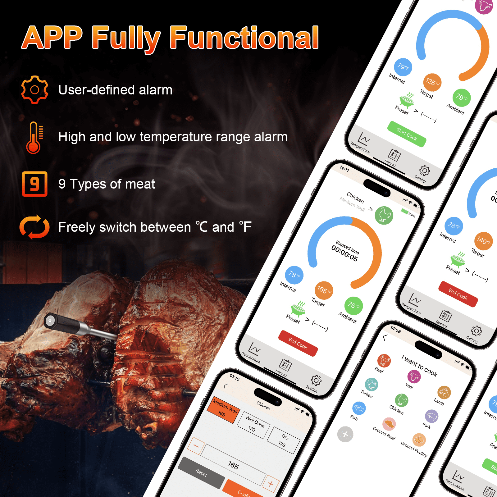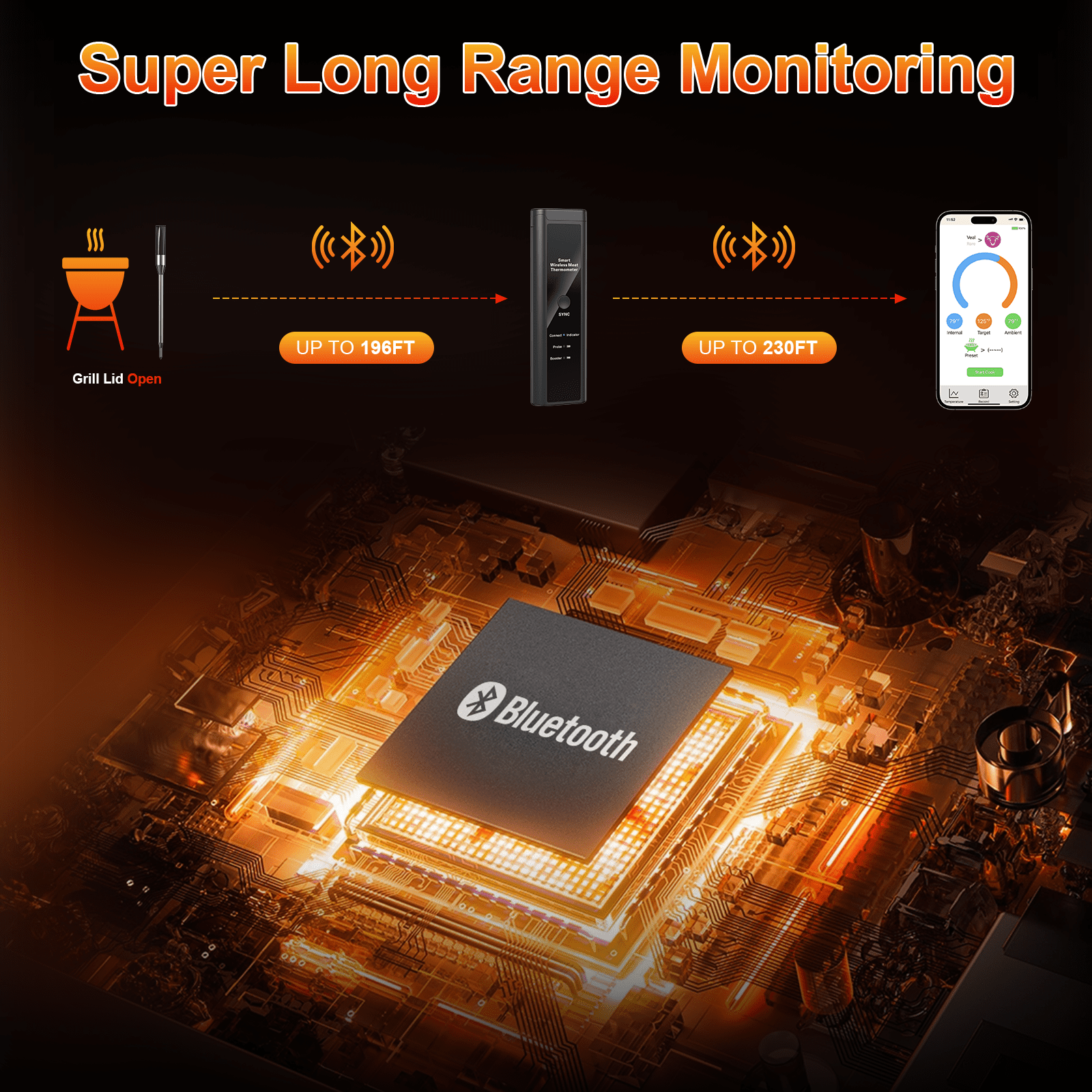 Are you tired of guessing when your meat is perfectly cooked or missing the ideal moment because you got distracted? Meet the VAVSEA Smart Wireless Meat Thermometer—your ultimate solution! This fully wireless Bluetooth thermometer provides an ultra-long range of up to 500 feet. It allows you to monitor your grill or oven from anywhere. Just insert the probe, and as soon as your food reaches the preset temperature, you’ll get an instant alert through the app. Say goodbye to overcooking and enjoy worry-free grilling, roasting, and smoking with precision. Let VAVSEA help you master every meal effortlessly!