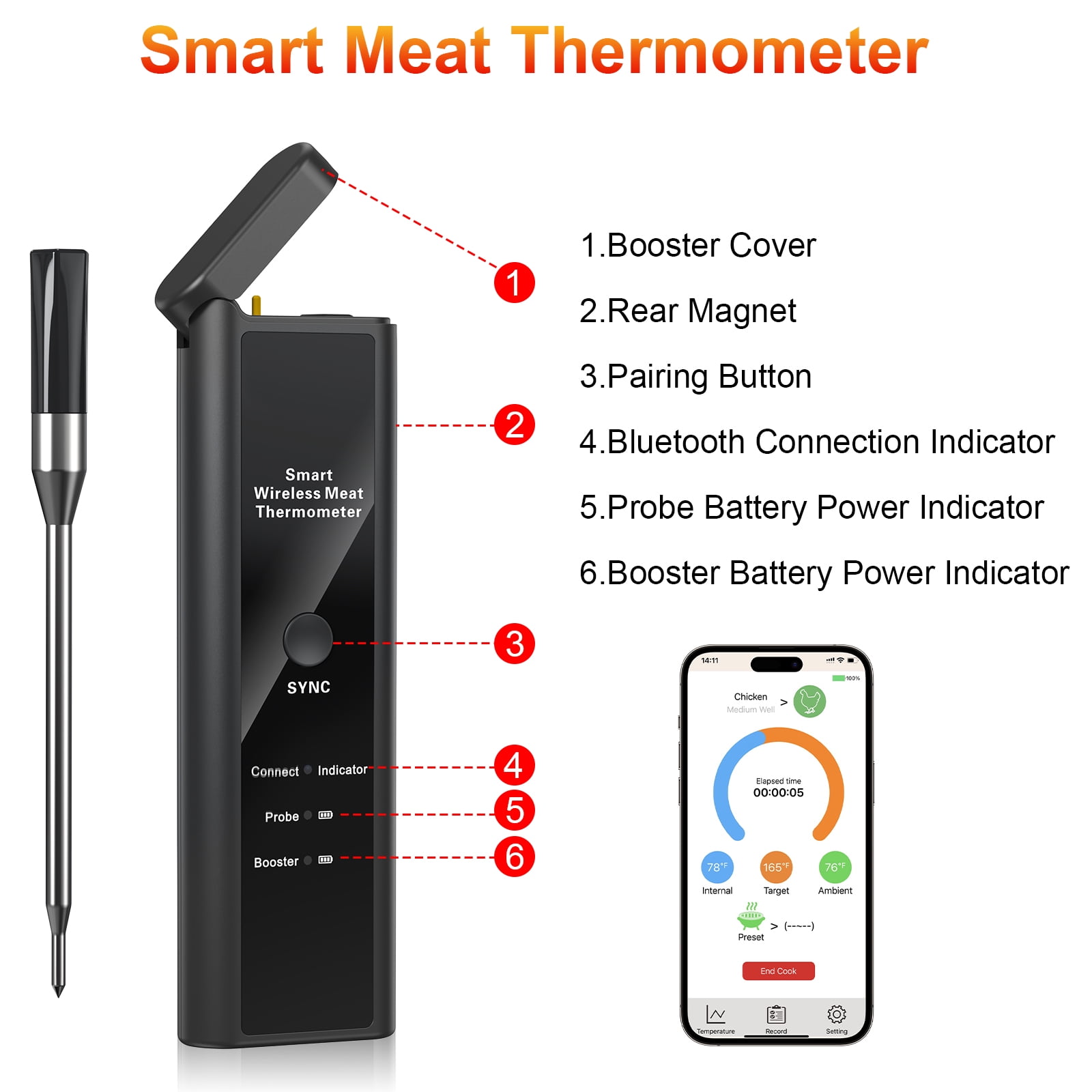 VAVSEA Smart Wireless Meat Thermometer,Digital Bluetooth Meat Thermometer with App Control for Precise Grilling, Smoking and Oven Cooking