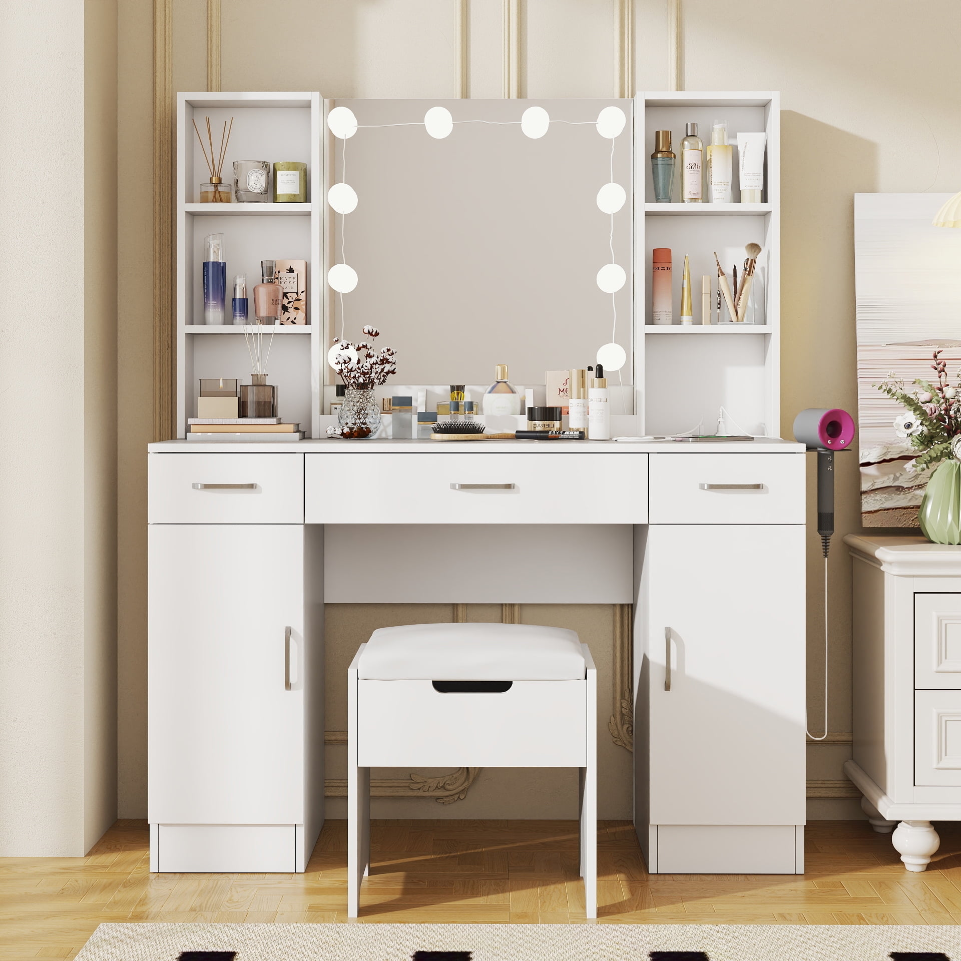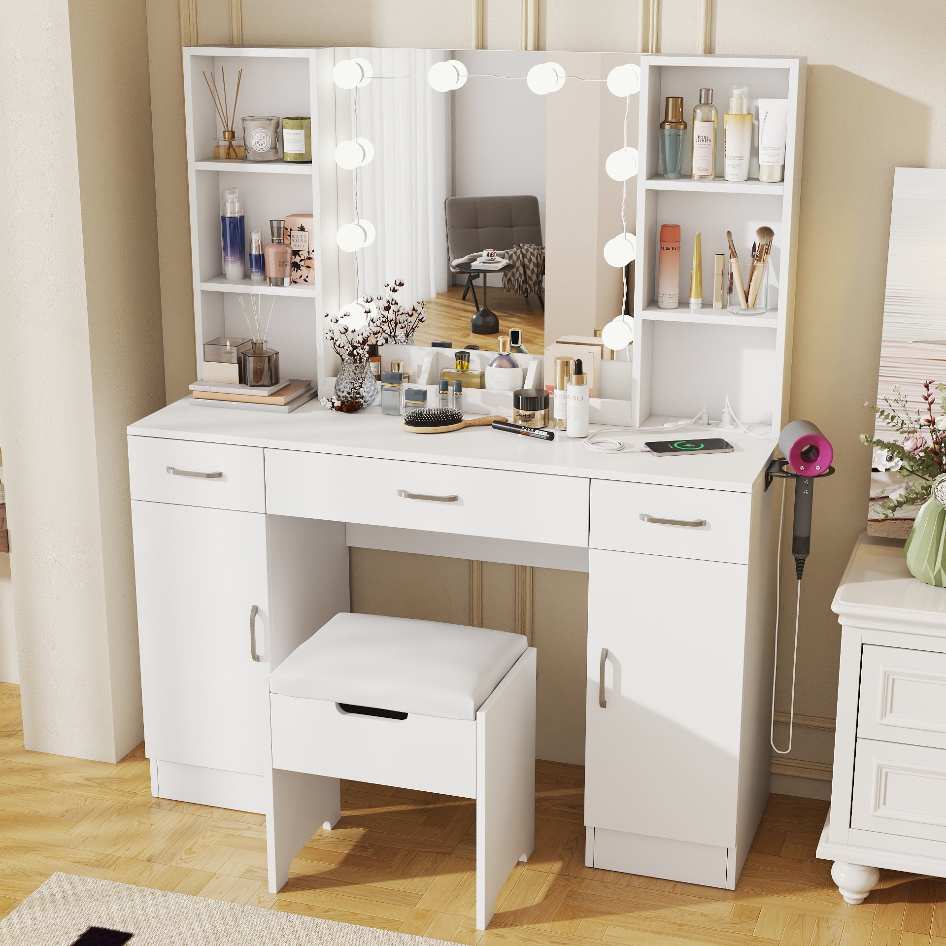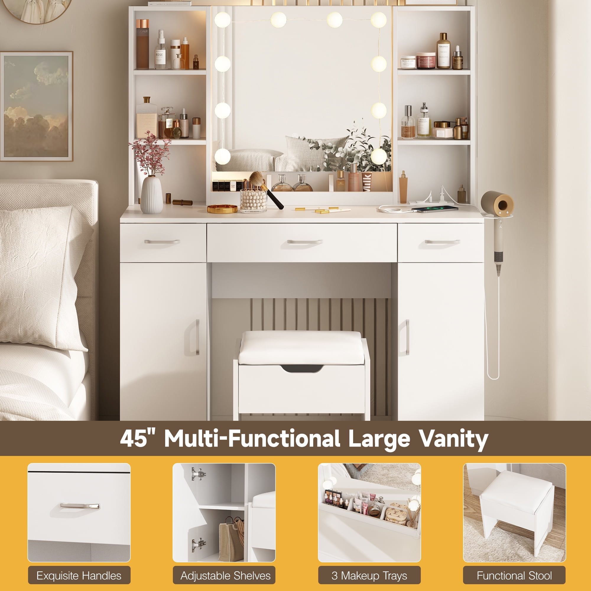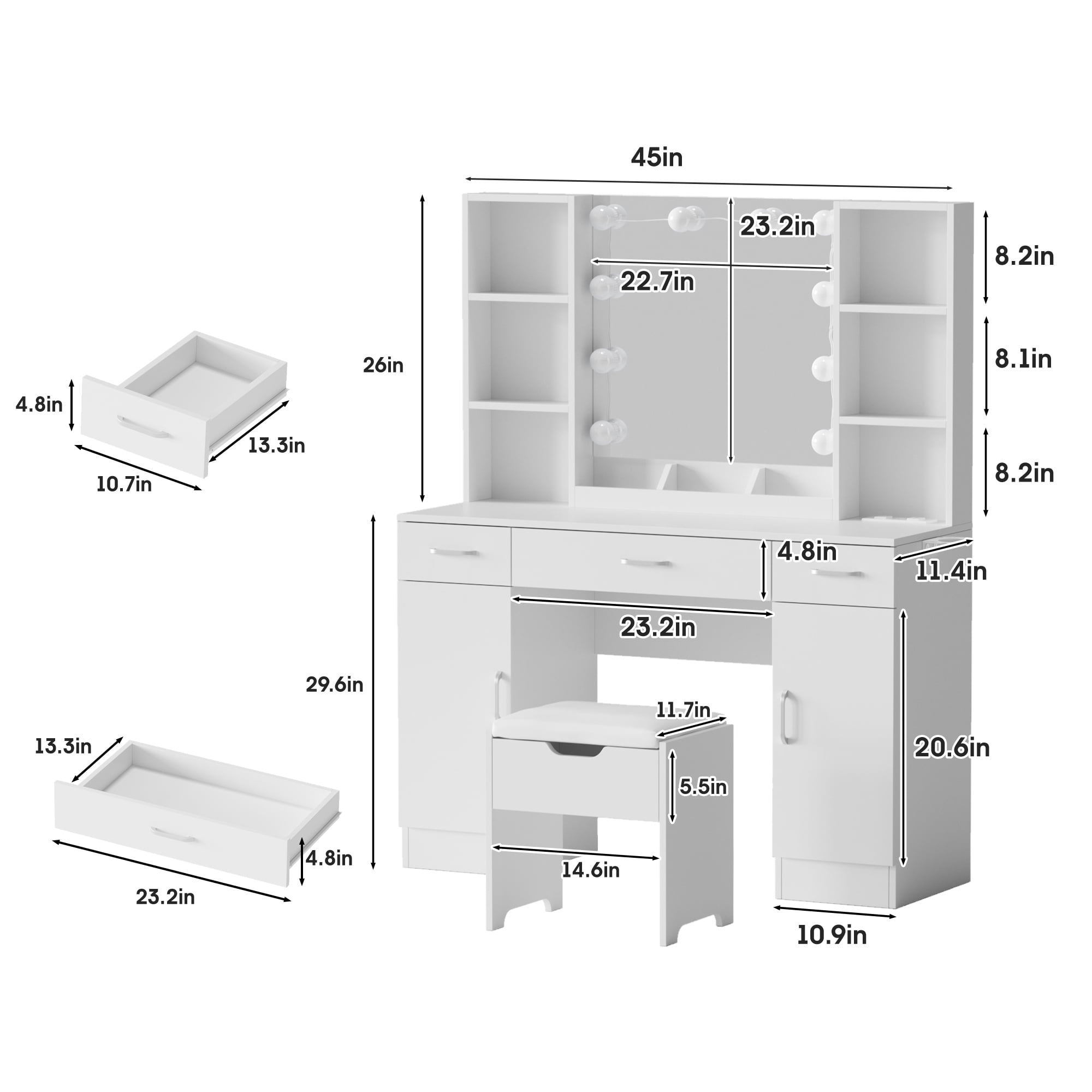 Features: 10 Hollywood light bulbs with Adjustable Brightness 3 Lighting Modes: Warm Yellow, Warm White and Cold White 2 Power Outlets(125V/12A) and 2 USB Ports(5V/2A) Built-in Hair Dryer Rack 6 Open Storage Shelves 3 Large Drawers for Storage Cushioned Stool with Storage Beautiful Modern Style Perfect for Your Bedroom, BathroomSpecifications: Color: White/Black/Brown Material: Particleboard, Metal Vanity Size: 15.4″D x 45.2″W x 55.7″H Mirror Size: 23.2″L x 22.7″HPackage Includes: 1 x Vanity Table 1 x Cushioned Stool 1 x Hair Dryer Rack 10 x LED Bulbs 1 x Power Strip 1 x Accessories 1 x Instruction Features: 10 Hollywood light bulbs with Adjustable Brightness 3 Lighting Modes: Warm Yellow, Warm White and Cold White 2 Power Outlets(125V/12A) and 2 USB Ports(5V/2A) Built-in Hair Dryer Rack 6 Open Storage Shelves 3 Large Drawers for Storage Cushioned Stool with Storage Beautiful Modern Style Perfect for Your Bedroom, Bathroom Specifications: Color: White/Black/Brown Material: Particleboard, Metal Vanity Size: 15.4″D x 45.2″W x 55.7″H Mirror Size: 23.2″L x 22.7″H Package Includes: 1 x Vanity Table 1 x Cushioned Stool 1 x Hair Dryer Rack 10 x LED Bulbs 1 x Power Strip 1 x Accessories 1 x Instruction Features: 10 Hollywood light bulbs with Adjustable Brightness 3 Lighting Modes: Warm Yellow, Warm White and Cold White 2 Power Outlets(125V/12A) and 2 USB Ports(5V/2A) Built-in Hair Dryer Rack 6 Open Storage Shelves 3 Large Drawers for Storage Cushioned Stool with Storage Beautiful Modern Style Perfect for Your Bedroom, Bathroom Specifications: Color: White/Black/Brown Material: Particleboard, Metal Vanity Size: 15.4″D x 45.2″W x 55.7″H Mirror Size: 23.2″L x 22.7″H Package Includes: 1 x Vanity Table 1 x Cushioned Stool 1 x Hair Dryer Rack 10 x LED Bulbs 1 x Power Strip 1 x Accessories 1 x Instruction 10 Hollywood light bulbs with Adjustable Brightness|3 Lighting Modes: Warm Yellow, Warm White and Cold White|2 Power Outlets(125V/12A) and 2 USB Ports(5V/2A)|Built-in Hair Dryer Rack|6 Open Storage Shelves|3 Large Drawers for Storage|Cushioned Stool with Storage|Beautiful Modern Style Perfect for Your Bedroom, Bathroom