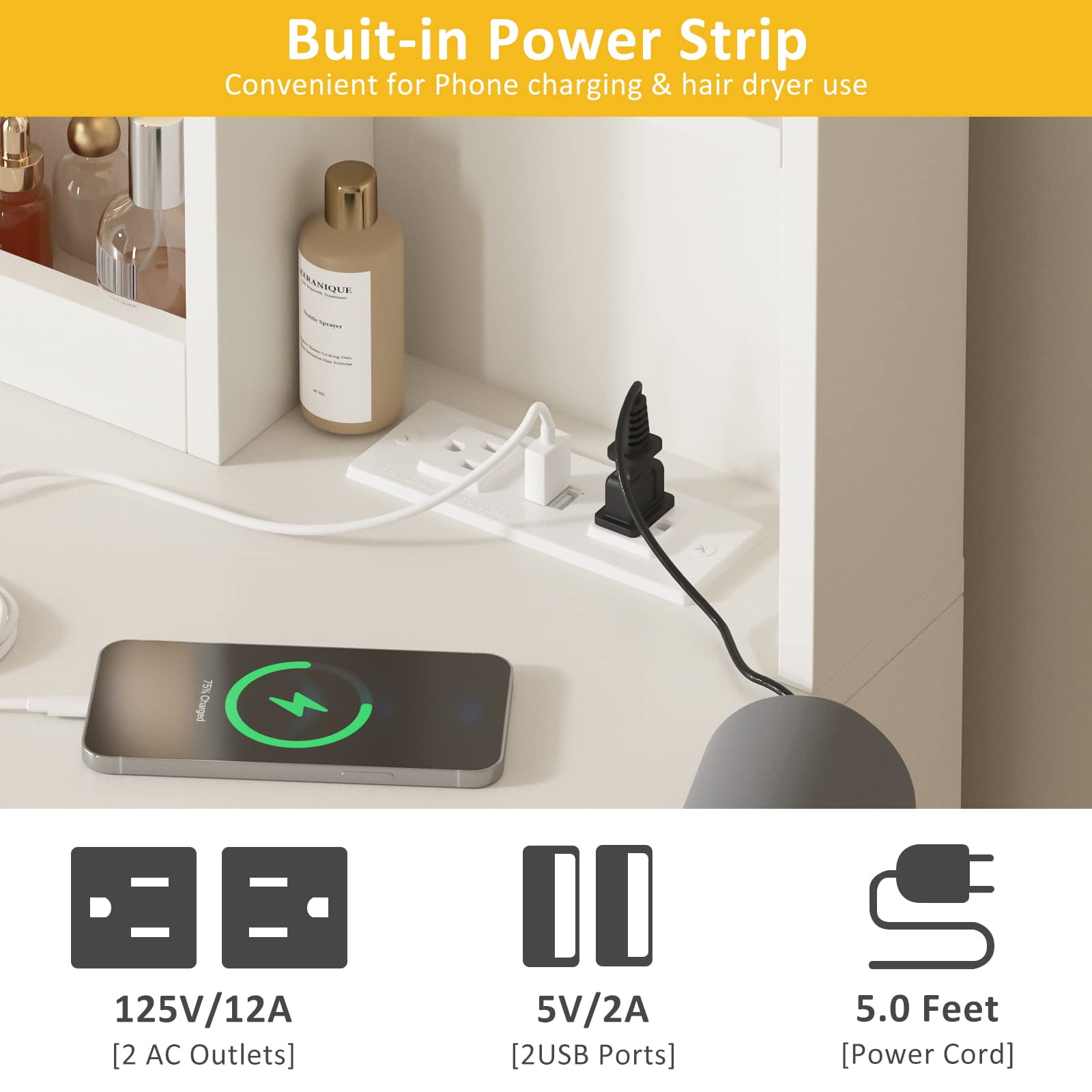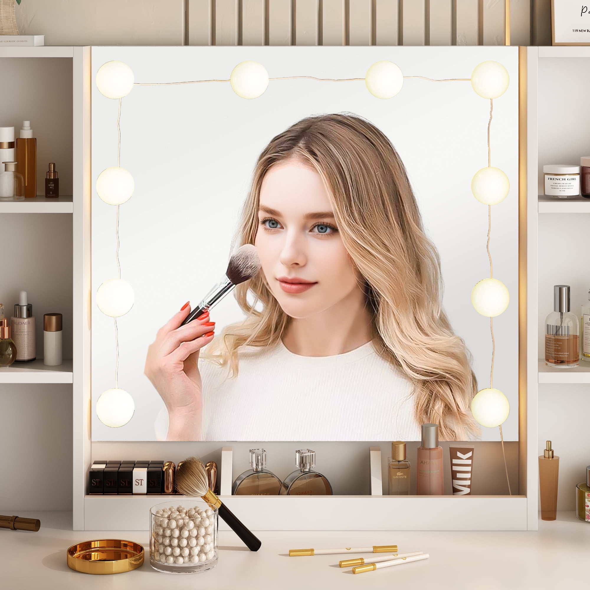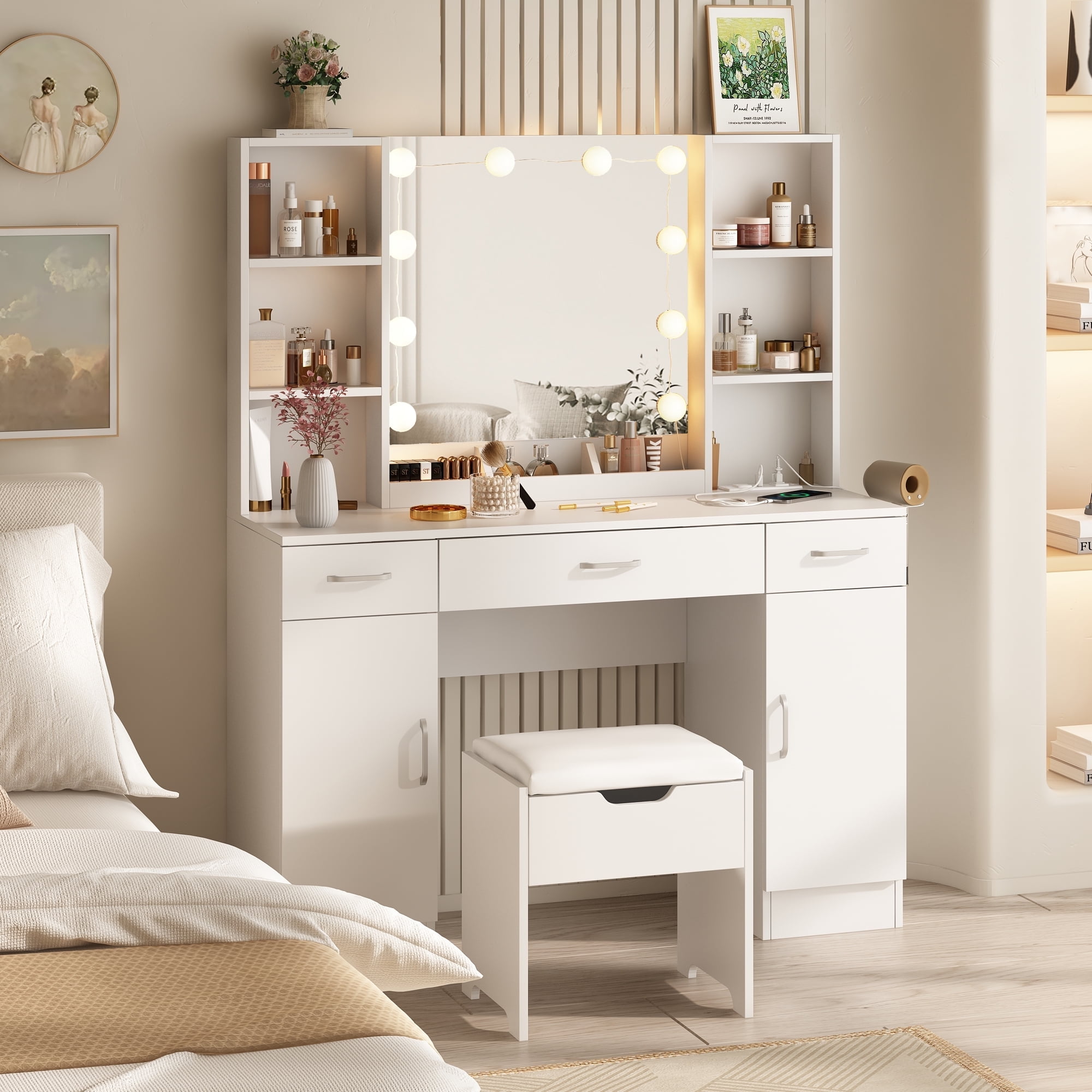 Features: 10 Hollywood light bulbs with Adjustable Brightness 3 Lighting Modes: Warm Yellow, Warm White and Cold White 2 Power Outlets(125V/12A) and 2 USB Ports(5V/2A) Built-in Hair Dryer Rack 6 Open Storage Shelves 3 Large Drawers for Storage Cushioned Stool with Storage Beautiful Modern Style Perfect for Your Bedroom, BathroomSpecifications: Color: White/Black/Brown Material: Particleboard, Metal Vanity Size: 15.4″D x 45.2″W x 55.7″H Mirror Size: 23.2″L x 22.7″HPackage Includes: 1 x Vanity Table 1 x Cushioned Stool 1 x Hair Dryer Rack 10 x LED Bulbs 1 x Power Strip 1 x Accessories 1 x Instruction Features: 10 Hollywood light bulbs with Adjustable Brightness 3 Lighting Modes: Warm Yellow, Warm White and Cold White 2 Power Outlets(125V/12A) and 2 USB Ports(5V/2A) Built-in Hair Dryer Rack 6 Open Storage Shelves 3 Large Drawers for Storage Cushioned Stool with Storage Beautiful Modern Style Perfect for Your Bedroom, Bathroom Specifications: Color: White/Black/Brown Material: Particleboard, Metal Vanity Size: 15.4″D x 45.2″W x 55.7″H Mirror Size: 23.2″L x 22.7″H Package Includes: 1 x Vanity Table 1 x Cushioned Stool 1 x Hair Dryer Rack 10 x LED Bulbs 1 x Power Strip 1 x Accessories 1 x Instruction Features: 10 Hollywood light bulbs with Adjustable Brightness 3 Lighting Modes: Warm Yellow, Warm White and Cold White 2 Power Outlets(125V/12A) and 2 USB Ports(5V/2A) Built-in Hair Dryer Rack 6 Open Storage Shelves 3 Large Drawers for Storage Cushioned Stool with Storage Beautiful Modern Style Perfect for Your Bedroom, Bathroom Specifications: Color: White/Black/Brown Material: Particleboard, Metal Vanity Size: 15.4″D x 45.2″W x 55.7″H Mirror Size: 23.2″L x 22.7″H Package Includes: 1 x Vanity Table 1 x Cushioned Stool 1 x Hair Dryer Rack 10 x LED Bulbs 1 x Power Strip 1 x Accessories 1 x Instruction 10 Hollywood light bulbs with Adjustable Brightness|3 Lighting Modes: Warm Yellow, Warm White and Cold White|2 Power Outlets(125V/12A) and 2 USB Ports(5V/2A)|Built-in Hair Dryer Rack|6 Open Storage Shelves|3 Large Drawers for Storage|Cushioned Stool with Storage|Beautiful Modern Style Perfect for Your Bedroom, Bathroom
