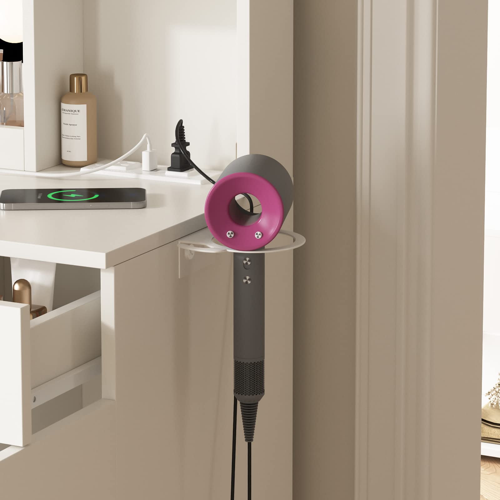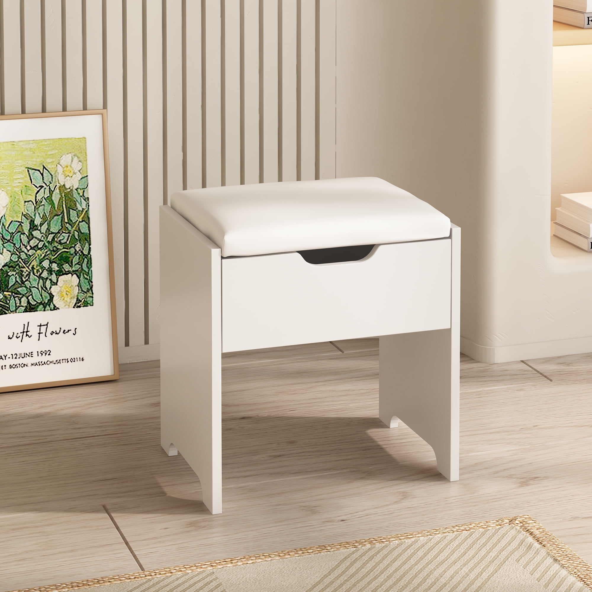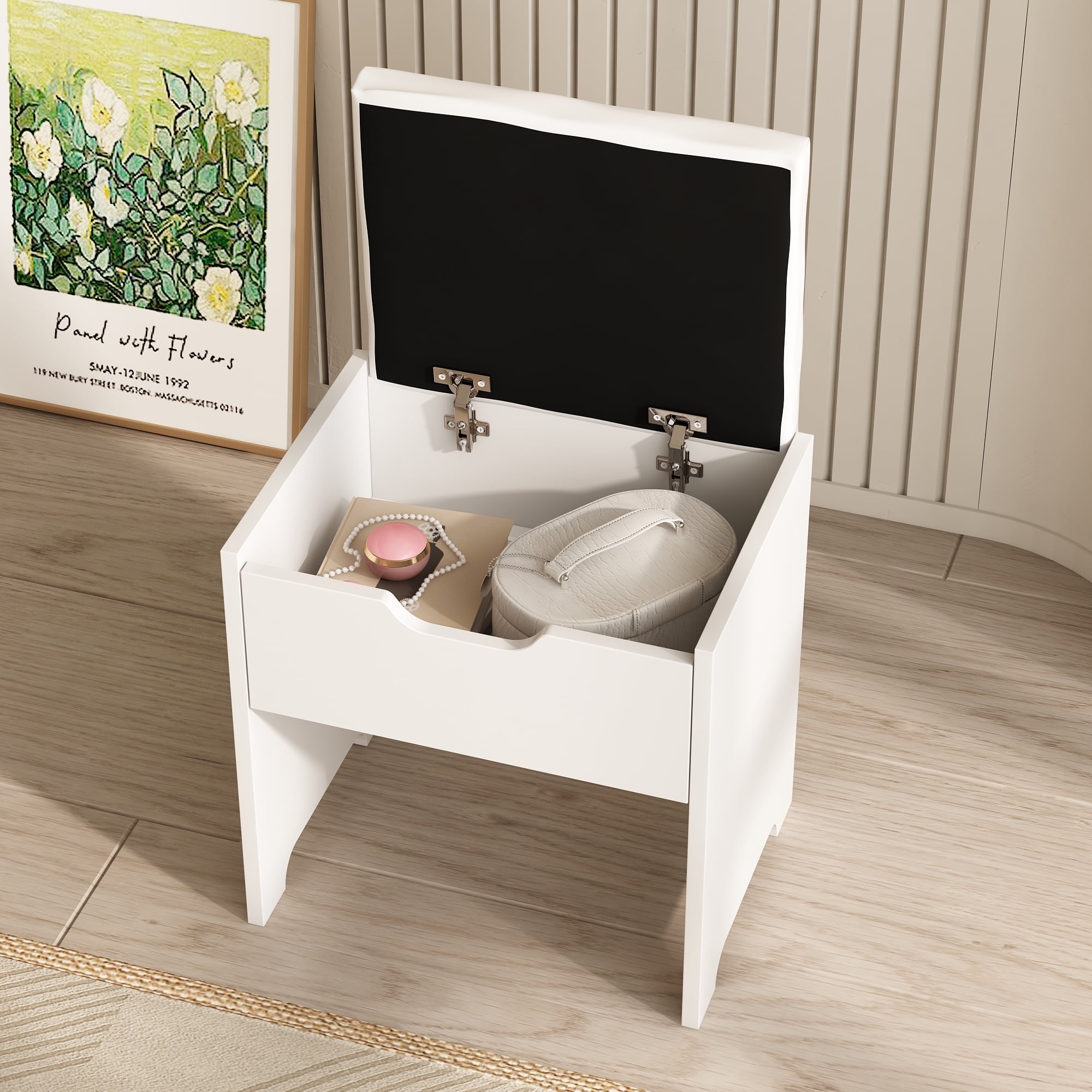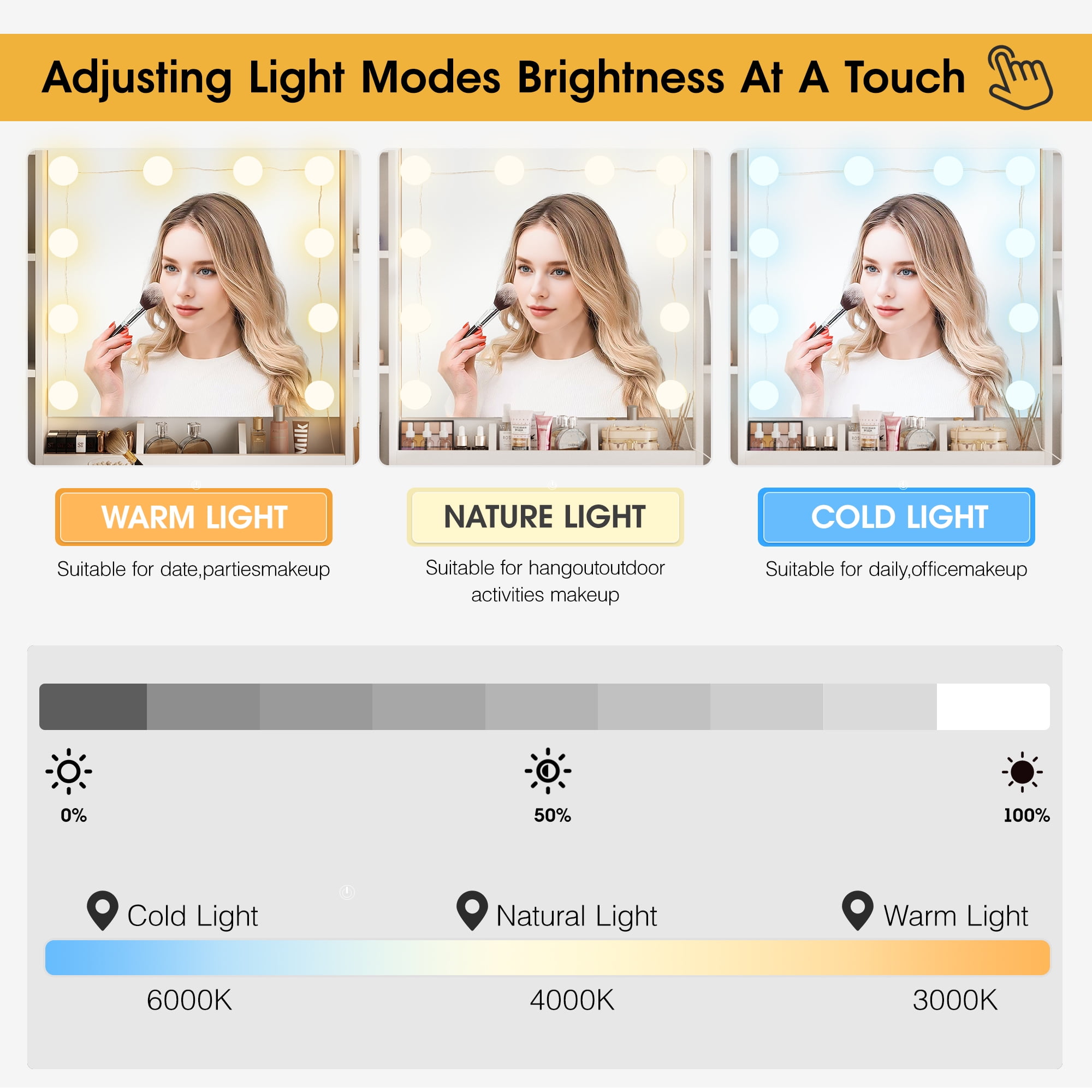 Features: 10 Hollywood light bulbs with Adjustable Brightness 3 Lighting Modes: Warm Yellow, Warm White and Cold White 2 Power Outlets(125V/12A) and 2 USB Ports(5V/2A) Built-in Hair Dryer Rack 6 Open Storage Shelves 3 Large Drawers for Storage Cushioned Stool with Storage Beautiful Modern Style Perfect for Your Bedroom, BathroomSpecifications: Color: White/Black/Brown Material: Particleboard, Metal Vanity Size: 15.4″D x 45.2″W x 55.7″H Mirror Size: 23.2″L x 22.7″HPackage Includes: 1 x Vanity Table 1 x Cushioned Stool 1 x Hair Dryer Rack 10 x LED Bulbs 1 x Power Strip 1 x Accessories 1 x Instruction Features: 10 Hollywood light bulbs with Adjustable Brightness 3 Lighting Modes: Warm Yellow, Warm White and Cold White 2 Power Outlets(125V/12A) and 2 USB Ports(5V/2A) Built-in Hair Dryer Rack 6 Open Storage Shelves 3 Large Drawers for Storage Cushioned Stool with Storage Beautiful Modern Style Perfect for Your Bedroom, Bathroom Specifications: Color: White/Black/Brown Material: Particleboard, Metal Vanity Size: 15.4″D x 45.2″W x 55.7″H Mirror Size: 23.2″L x 22.7″H Package Includes: 1 x Vanity Table 1 x Cushioned Stool 1 x Hair Dryer Rack 10 x LED Bulbs 1 x Power Strip 1 x Accessories 1 x Instruction Features: 10 Hollywood light bulbs with Adjustable Brightness 3 Lighting Modes: Warm Yellow, Warm White and Cold White 2 Power Outlets(125V/12A) and 2 USB Ports(5V/2A) Built-in Hair Dryer Rack 6 Open Storage Shelves 3 Large Drawers for Storage Cushioned Stool with Storage Beautiful Modern Style Perfect for Your Bedroom, Bathroom Specifications: Color: White/Black/Brown Material: Particleboard, Metal Vanity Size: 15.4″D x 45.2″W x 55.7″H Mirror Size: 23.2″L x 22.7″H Package Includes: 1 x Vanity Table 1 x Cushioned Stool 1 x Hair Dryer Rack 10 x LED Bulbs 1 x Power Strip 1 x Accessories 1 x Instruction 10 Hollywood light bulbs with Adjustable Brightness|3 Lighting Modes: Warm Yellow, Warm White and Cold White|2 Power Outlets(125V/12A) and 2 USB Ports(5V/2A)|Built-in Hair Dryer Rack|6 Open Storage Shelves|3 Large Drawers for Storage|Cushioned Stool with Storage|Beautiful Modern Style Perfect for Your Bedroom, Bathroom