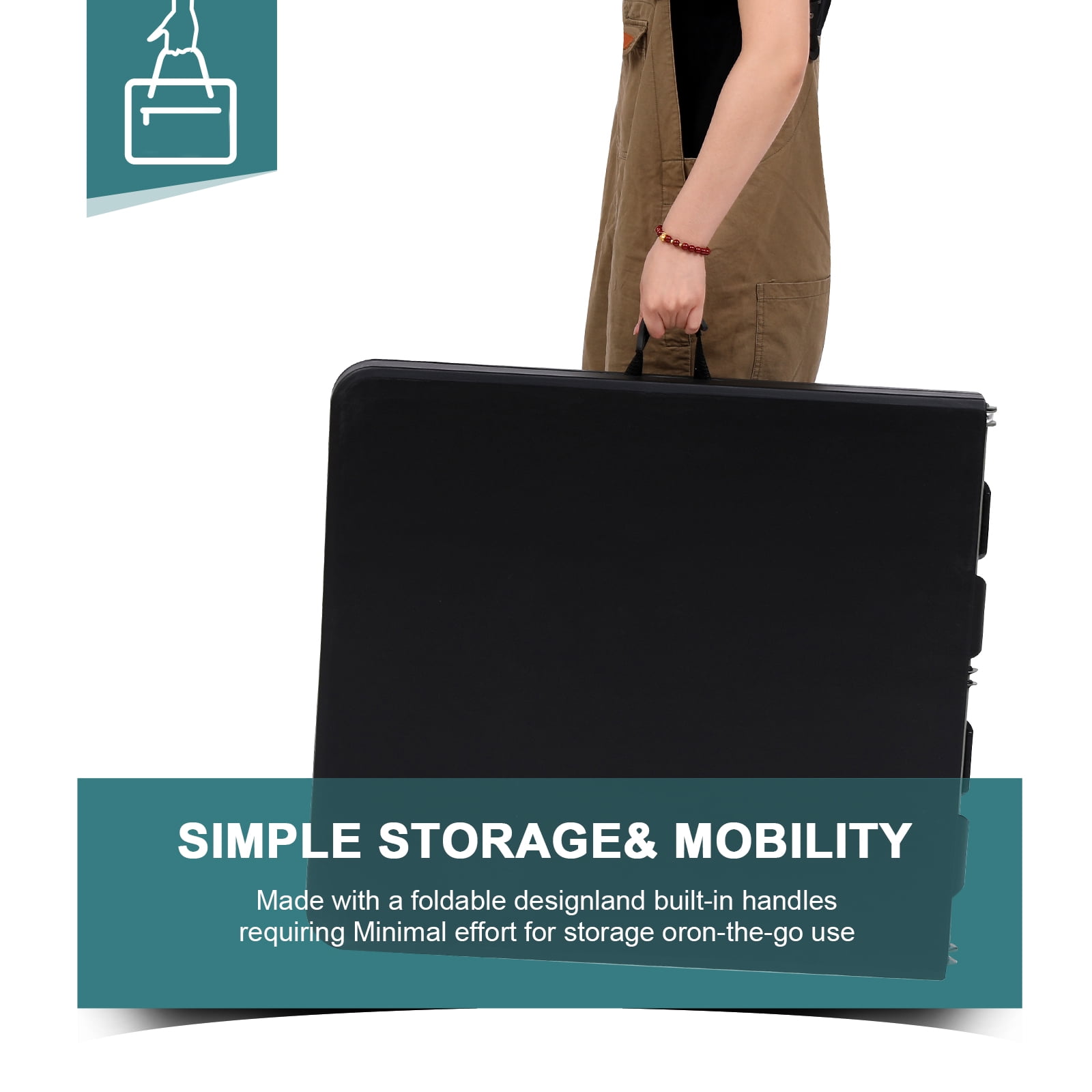 Ensuring steadfast support: The folding table incorporates Powder-coated steel legs, camping table frame joint locks, and non-slip rubber feet, collectively contributing to the plastic table’s stability throughout various events. Designed for portability: The folding table features a foldable design, complete with a side lock and handle, rendering the plastic table easily transportable. Promoting versatility: you to transport the folding table to any desired location, catering to a variety of needs and occasions. Requiring no assembly: The folding table arrives fully assembled and folded. additional steps or assembly requirements. Facilitating efficient storage: The plastic table can be easily folded up and discreetly stored behind your dresser.