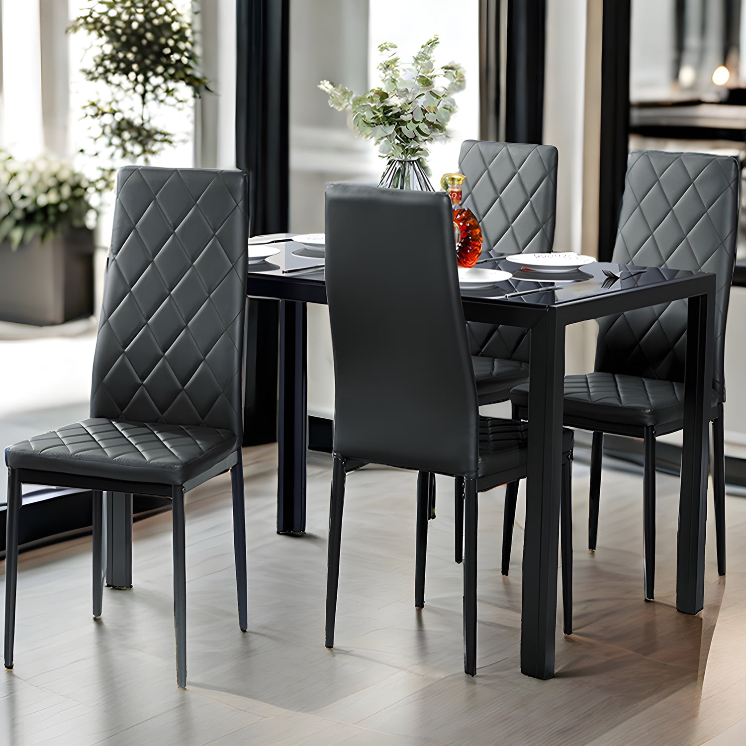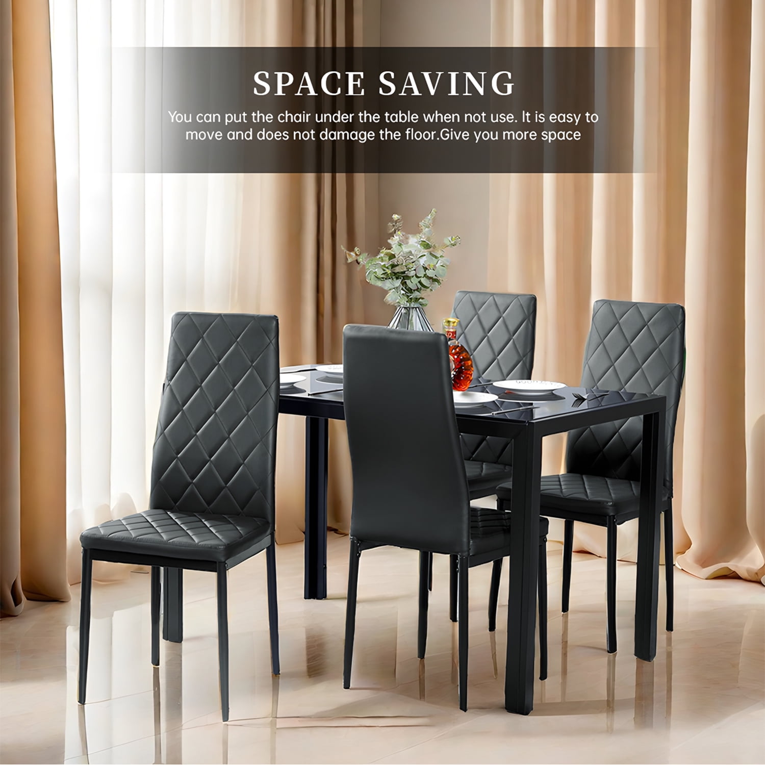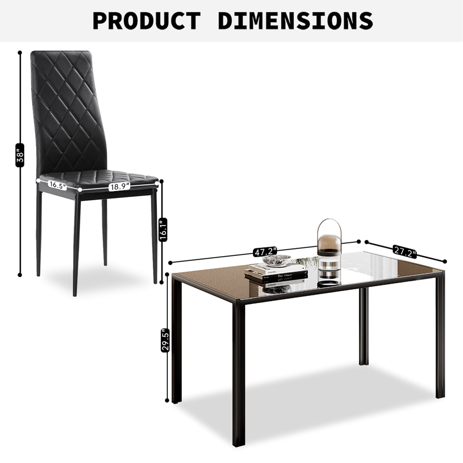 5 Piece Kitchen Dining Set Glass Metal Table and 4 Chairs Breakfast Furniture ●♥● Delicate Design: This kitchen dining set includes one tempered glass top table and 4 PVC leather chairs which makes it looks fantastic in any dining room. There is no doubt to say that such an elegant addition and suit any decor style dining room with the black colors. ●♥●Easy Clean and Assembly: PVC leather for chair, beautifully furnished black color, smooth glass surface finish for table easy for daily clean. This chair and table set has straight forward illustrations and descriptions. Every screw and pin has its own code and it’s easy to understand the assemble progress. It won’t take you much time and could save your energy. -Brand new and high quality -Rust-resistant -Sturdy structure -Smooth glass surface finish for table -PVC leather for chair -Beautifully furnished black color -Suitable for diverse rooms -Easy to assemble and maintain The product is packed in two packages. Specifications Color: Black Table material: Metal frame and glass table Chair material: PVC, sponge, metal Table size: 47.2″ x 27.2″ x 29.5″ (L x W x H) Glass thickness: 8 mm Chair size: 18.9″ x 16.5″ (L x W) Height from ground to back: 38″ Seat height: 16.1″