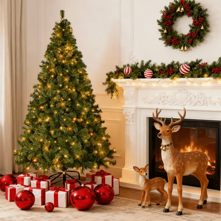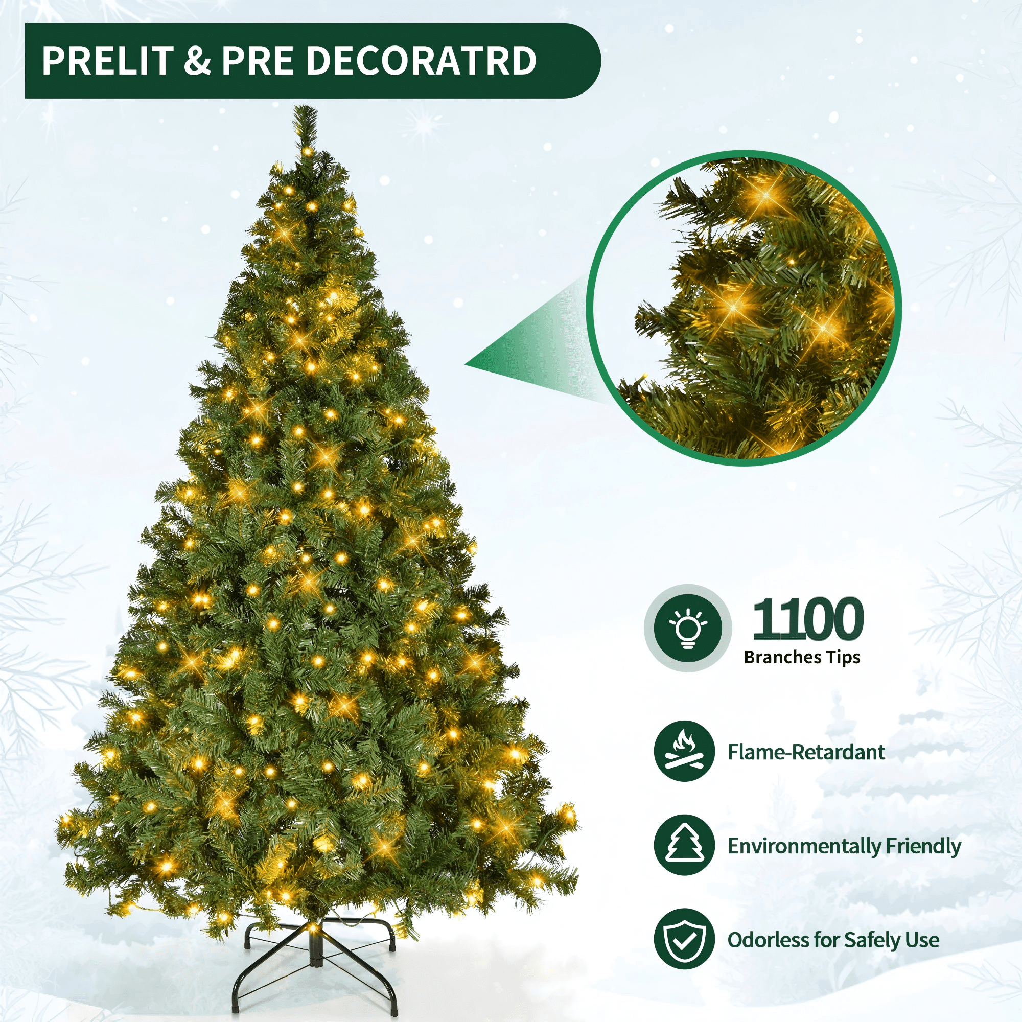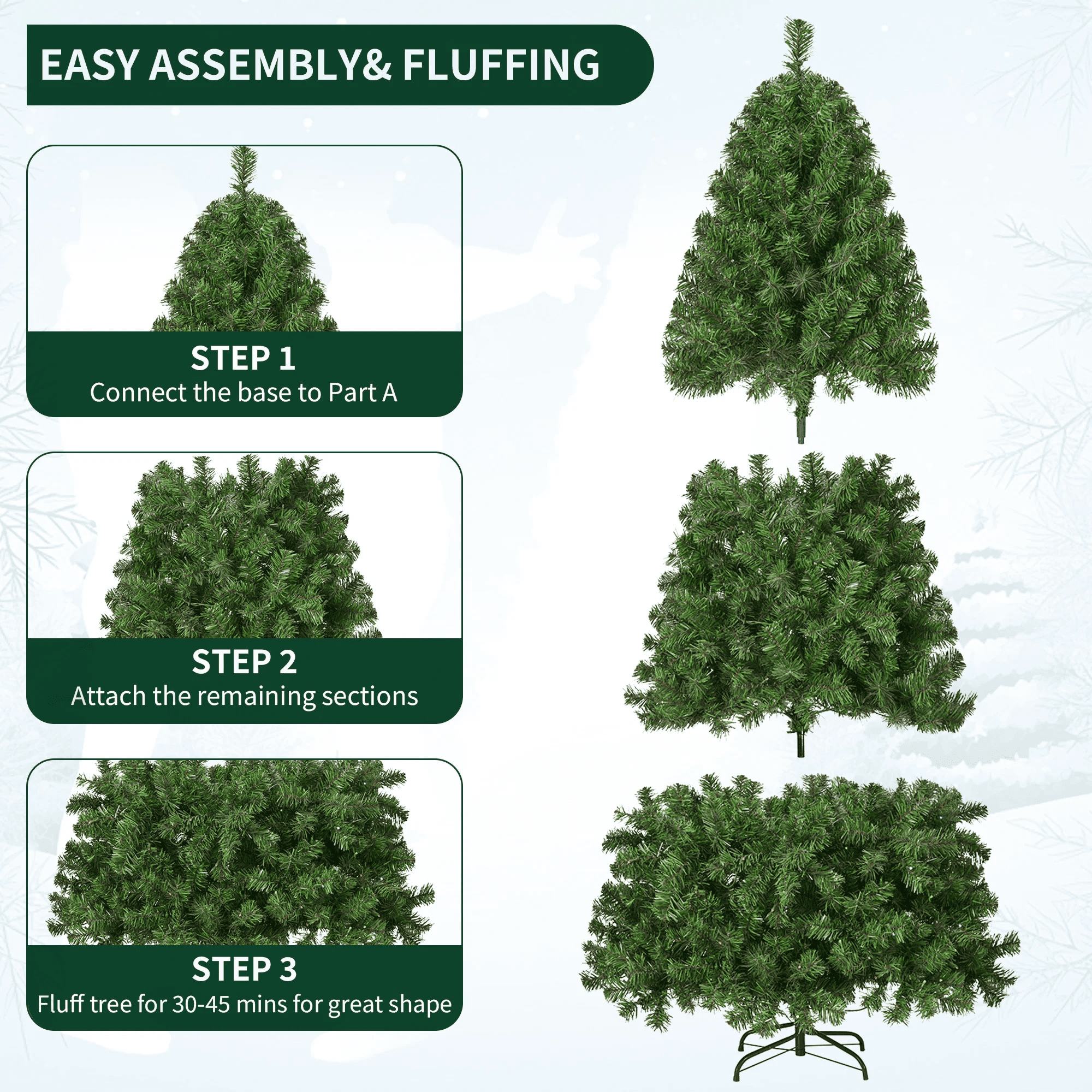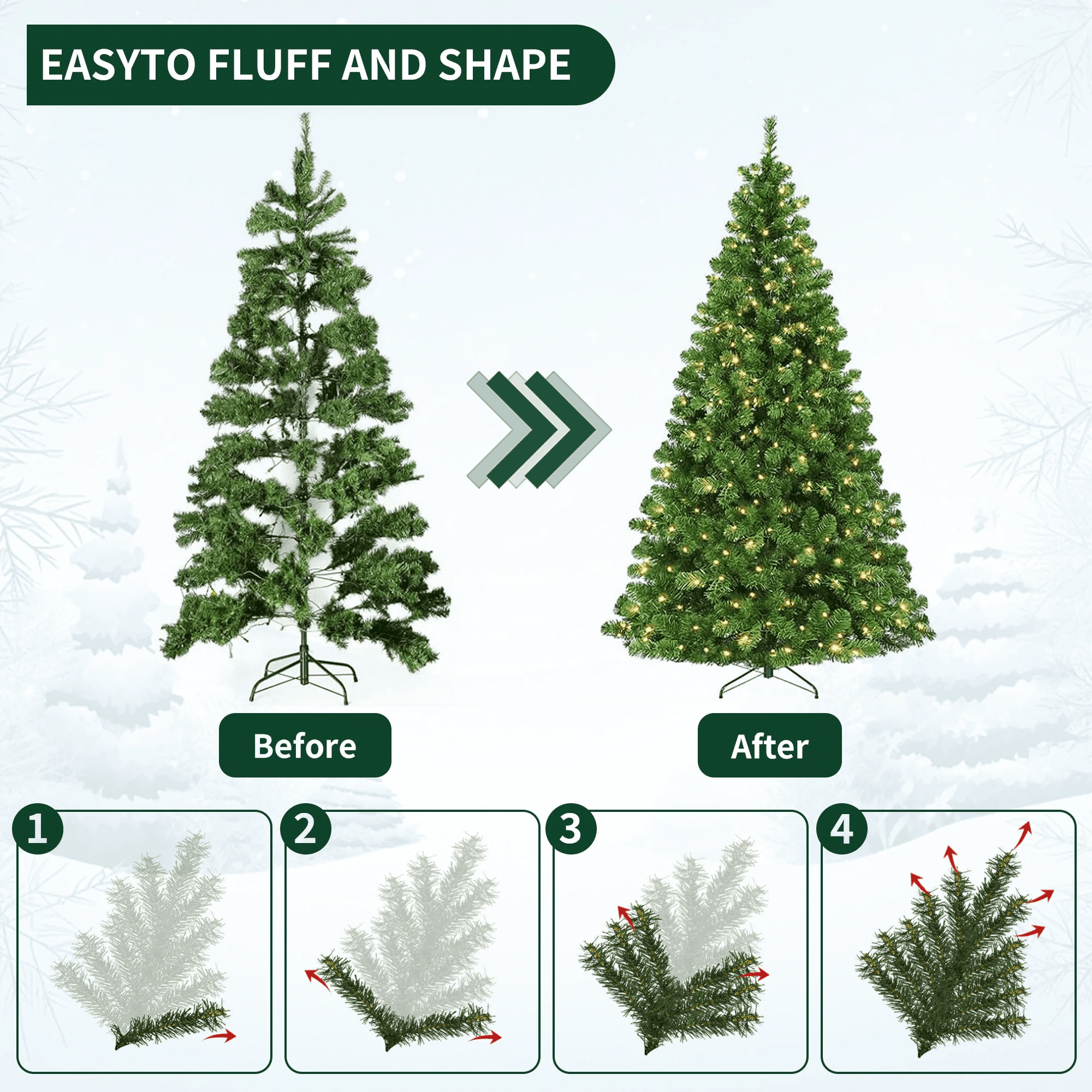 ※:CLASSIC PINE TREE: Inspire holiday cheer this season with a Christmas tree that helps make the season feel complete; equipped with sturdy branches, strong enough to hold garland and all your favorite ornaments for a customized look. ※:EASY ASSEMBLY & FLUFFING: Put the tree together in just 3 steps: simply connect the base to the largest section of the tree before attaching the remaining sections and easily fluffing the branches ※:MANY WAYS TO DECORATE: Accentuate different areas of your living space, office, or even a holiday party by customizing your tree with garland, lights, ornaments, and more! ※:HIGH-QUALITY: Crafted with durable metal hinges and flame-retardant PVC branches that stand tall with the help of a sturdy metal base, so you can enjoy your tree for holiday seasons to come! ※:FULL APPEARANCE: Fully fluff the branches to provide a healthy, natural appearance, with 1100 branch tips and 250 incandescent lights to capture that authentic Christmas look
