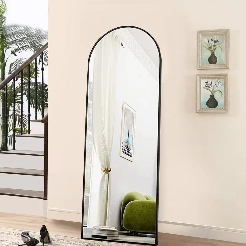 Modern Elegance: Elevate your room decor with our arched full-length floor mirror. Its modern style seamlessly complements any room, adding a touch of elegance and creating a sense of openness and brightness. Versatile Placement: This multifunctional mirror offers various placement options. Tilt it against the wall, install it vertically, or use the U-shaped bracket for a freestanding display. The convenient hook on the back makes it suitable for both indoor and outdoor settings. Unique Design: The smooth arched-top frame sets our floor mirror apart. The thin aluminum alloy frame adds a classic touch, making it a standout piece in any space. Upgrade your room’s aesthetic with this classy and distinctive mirror. Reflect Your Style: With a generous size of 65 x 22 inches, our large dressing mirror ensures you see your entire figure at once. Perfect for daily commuting, dating, or preparing for important events, this mirror lets you check your outfit effortlessly. Easy Installation: Effortlessly integrate this mirror into your space. Whether leaning against the wall or hung using the included wall-mounted hooks, the installation is a breeze. Enhance your room’s ambiance with this stylish and functional full-length mirror.