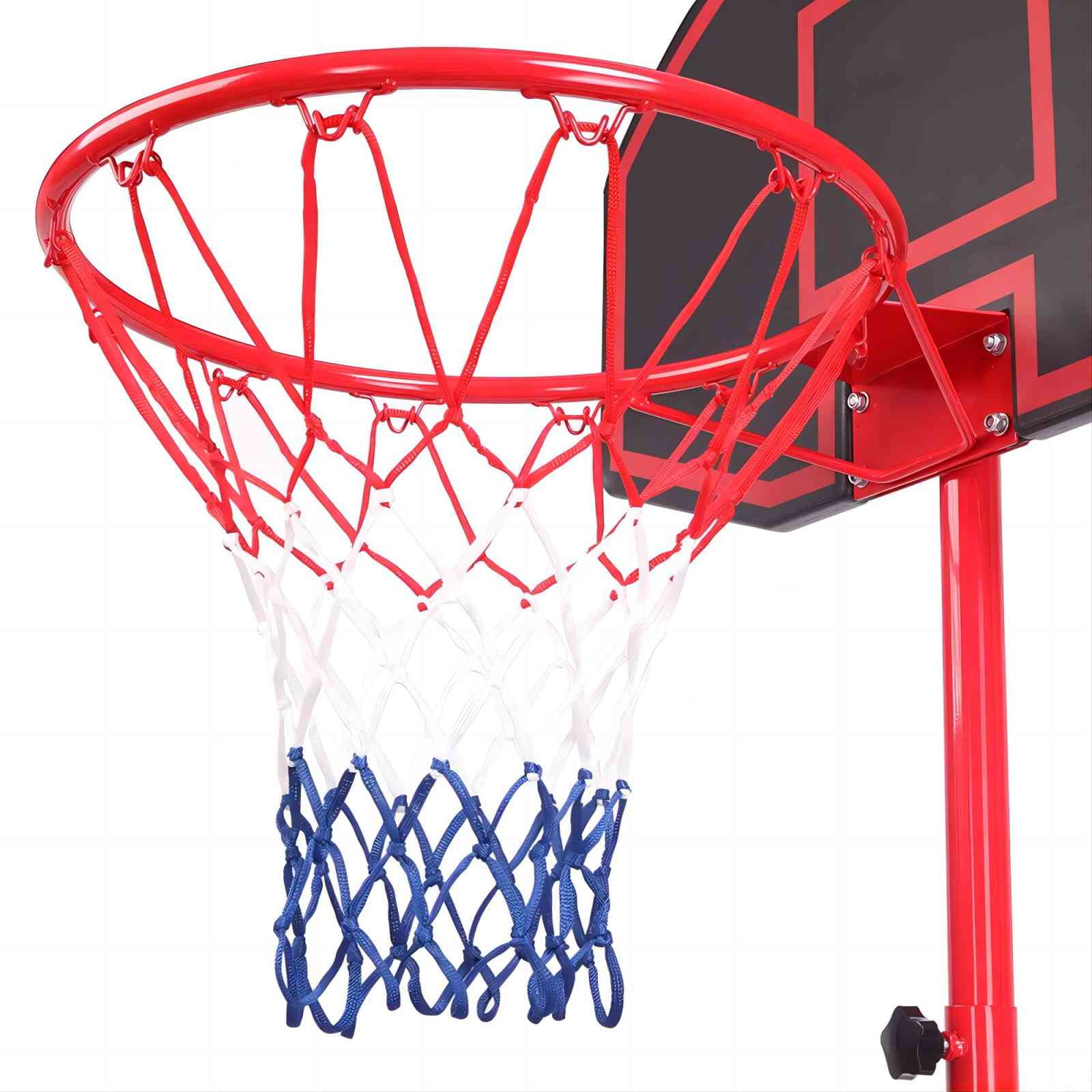 Vebreda 5.2′-7′ Adjustable Height Durable Outdoor Portable Basketball System (Teen) Material: Constructed from galvanized steel pipe (42 x 1.2 mm), HDPE, and Dacron net for durability Color: Black and red design for a stylish look Backboard Dimensions: 27.17 x 17.72 inches (69 x 45 cm) for optimal play Hoop Dimensions: 42 cm x 1 mm for a standard basketball hoop experience Base Dimensions: 28.94 x 17.72 x 5.51 inches (73.5 x 45 x 14 cm) for stability