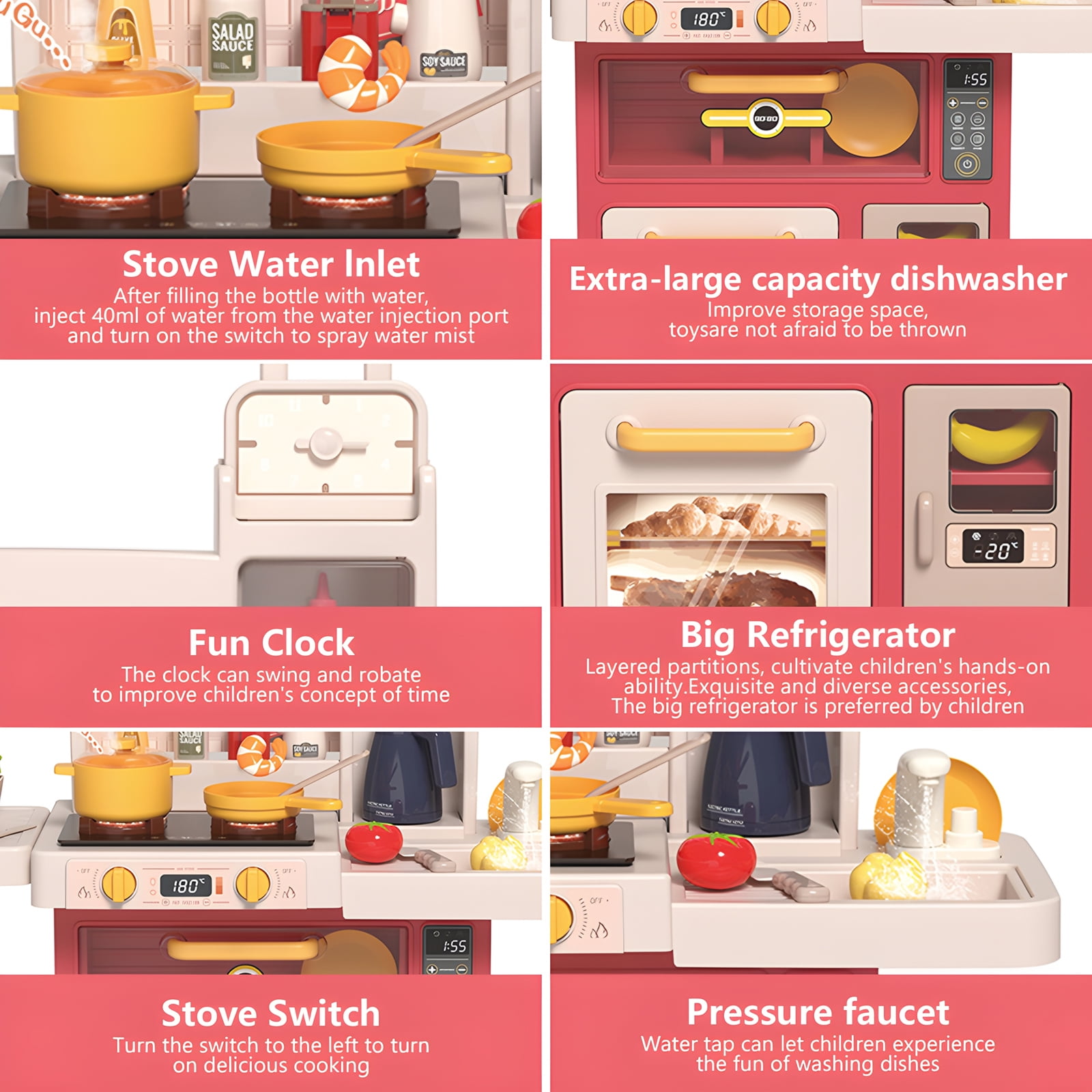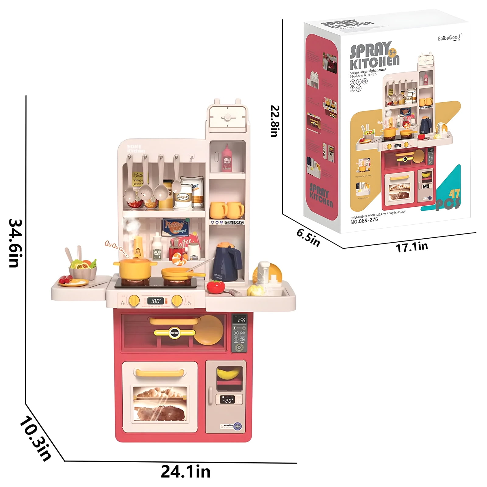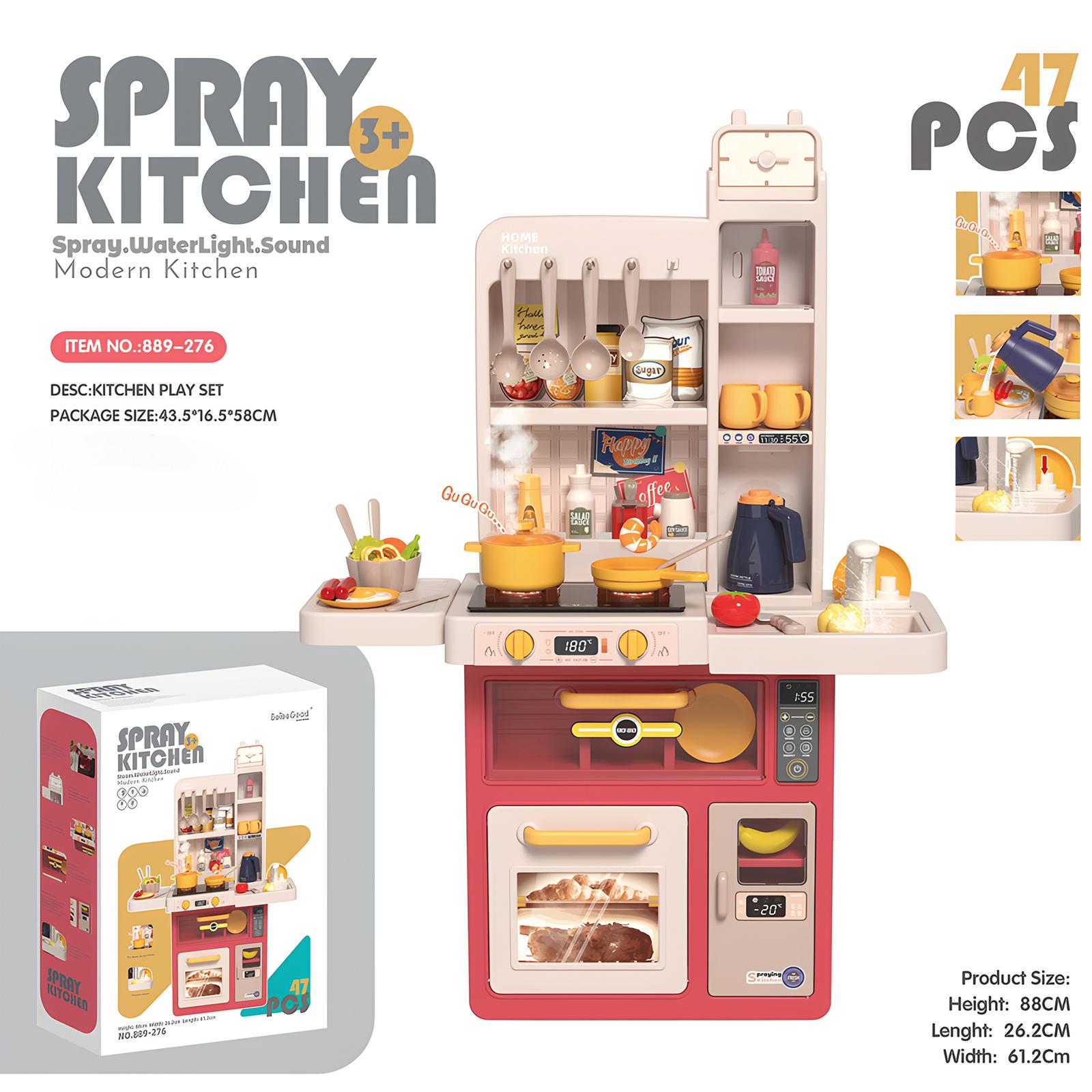 Interactive Cooking Stove with Lights & Sounds: This vibrant kitchen playset features a cooking stove with realistic sounds and lights, bringing the excitement of real-life cooking to your child’s playtime. When the burner is “on,” kids can hear sizzling and see steam rising, creating an immersive, engaging experience that encourages imaginative play. It helps develop sensory awareness and motor skills while offering endless fun. Complete Kitchen Set with 47 Pieces: The set includes 47 pieces of cookware, utensils, and food items, allowing young chefs to prepare, cook, and serve their favorite pretend meals. With a variety of pots, pans, plates, cups, and food pieces, children can explore endless cooking combinations. The variety of items not only fuels creativity but also promotes role-playing, social skills, and problem-solving. Safe & Durable Design for Toddlers: Designed with safety in mind, this kitchen playset is made from high-quality, non-toxic materials that are safe for children. The smooth edges and sturdy construction ensure durability during hours of play. It is the ideal gift for toddlers, encouraging pretend play while providing a safe and enjoyable environment. It also meets all safety standards, giving parents peace of mind. Educational & Skill-Building Play: This pretend kitchen set helps children develop essential life skills such as hand-eye coordination, fine motor skills, and the ability to follow instructions. As they “cook” and “serve,” they also practice social skills like sharing, taking turns, and communicating. The realistic features of the playset also enhance cognitive abilities as kids learn about different kitchen tools and food items. Perfect Gift for Kids & Toddlers: This Kids Kitchen Playset makes an ideal gift for birthdays, holidays, or any occasion. Its bright pink design appeals to both boys and girls, sparking imagination and fostering creativity. With its realistic features, kids can pretend to be professional chefs, creating meals for their family and friends. It’s an excellent toy for encouraging independent play and group activities.