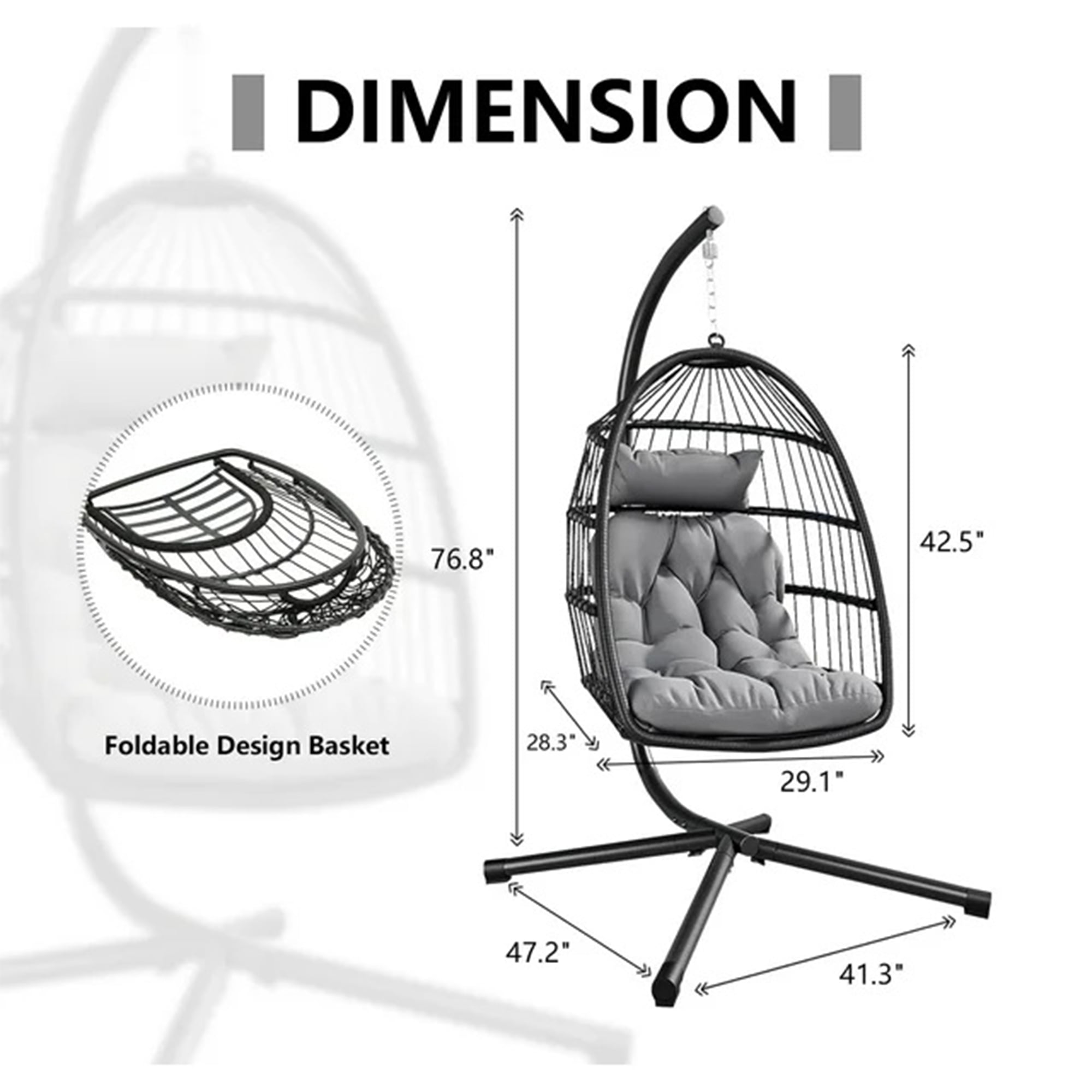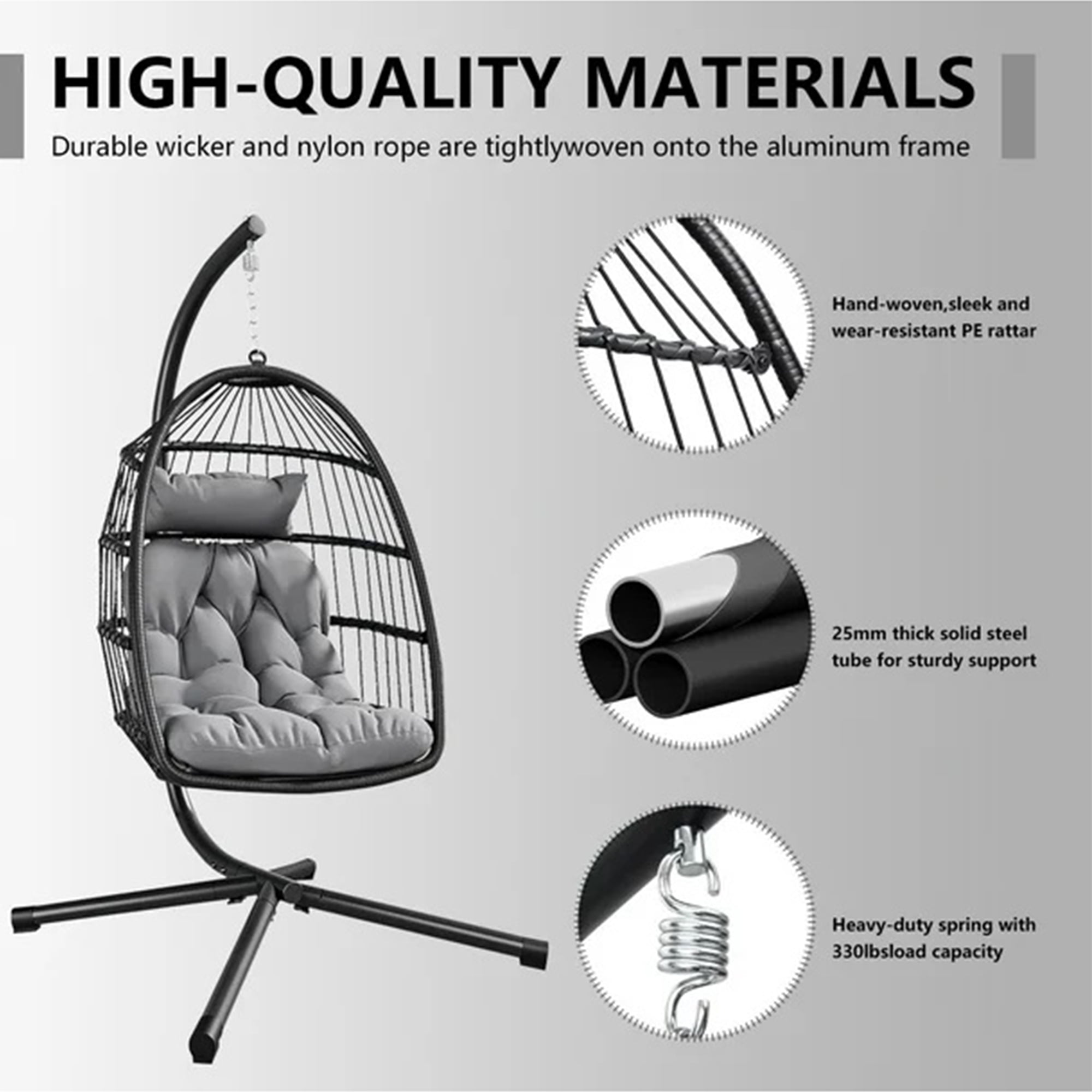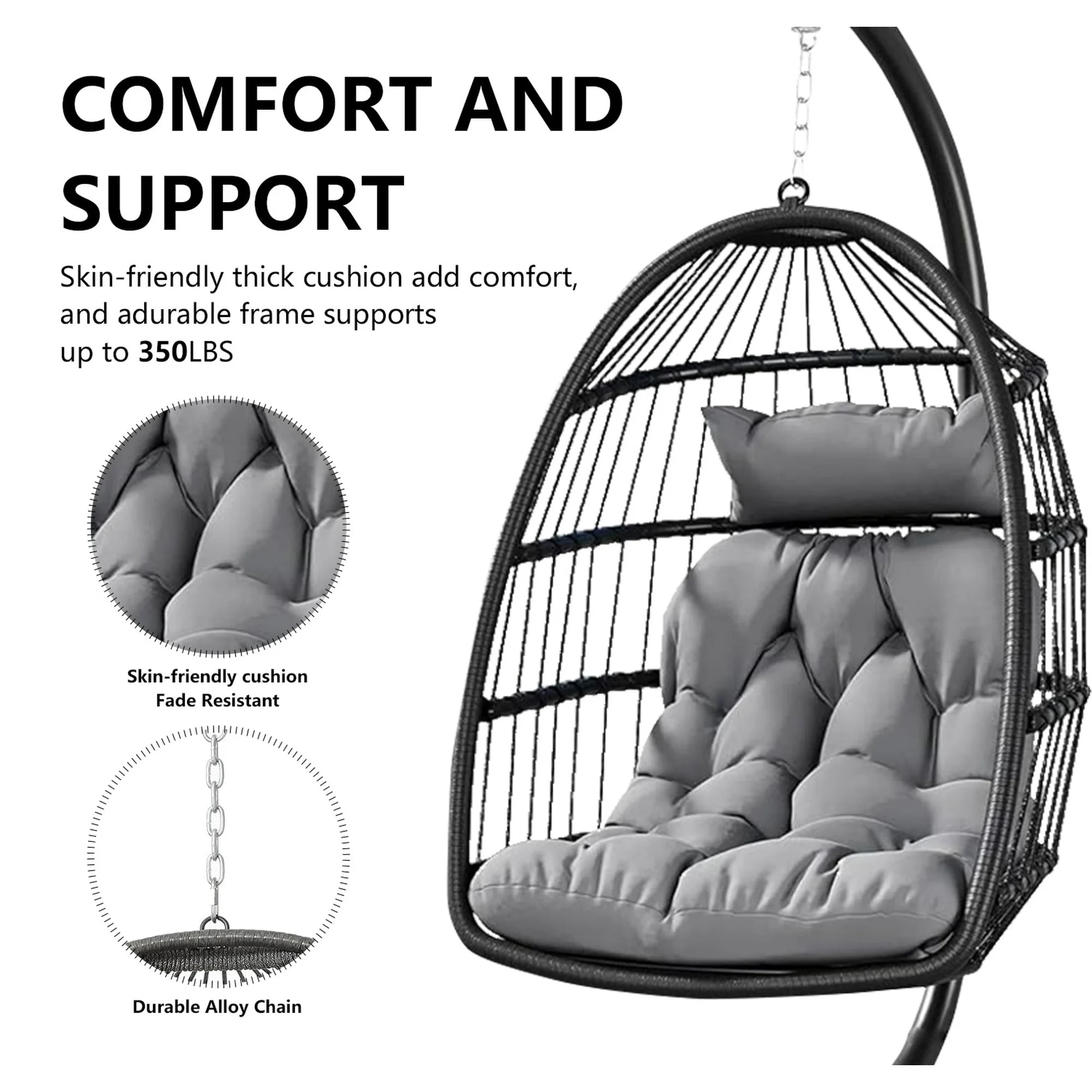 Heavy-duty steel hook & carabiner (supports up to 330 lbs / 150 kg) Plush cushion + removable pillow for total lounge comfort Adjustable headrest with secure straps to prevent slipping Safety-first design: Reinforced base + locking safety strap Includes protective waterproof cover to prolong durability Non-slip foot pads for added stability on any surface