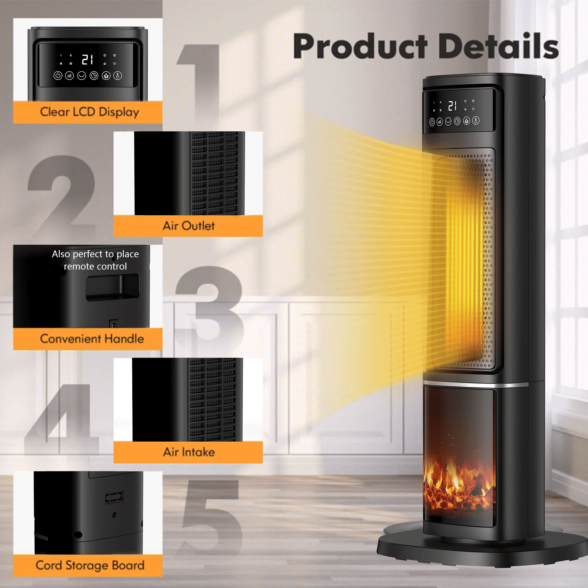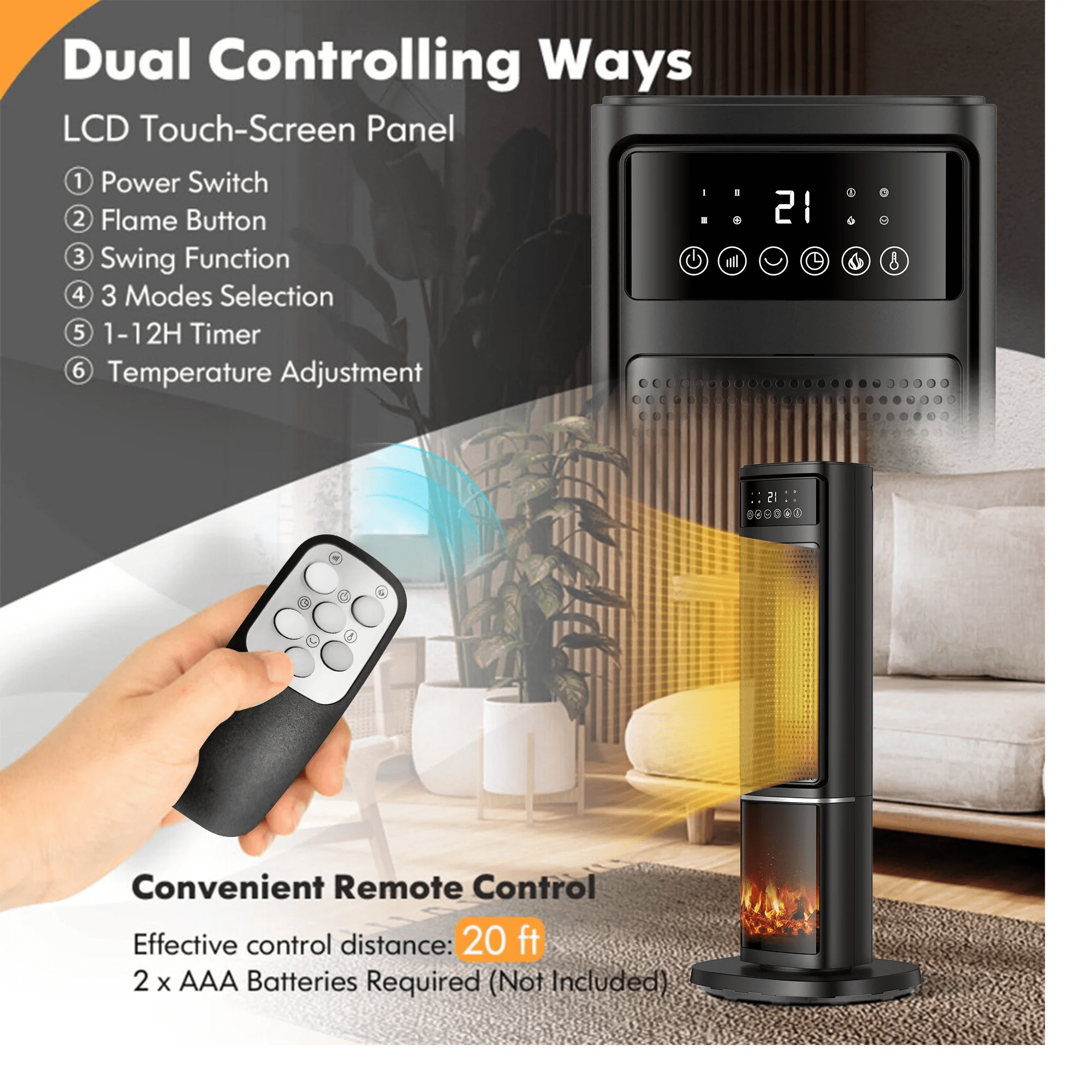 About this item 2s Fast and Powerful Heating:The tower heater with energy-efficient 1500W PTC ceramic heating technology rapidly heats up to 200ft² area. 80° wide angle oscillation. Its captivating 3D flame effect with relaxing fire crackling sound provides an immersive experience for you. This electric heater is a fabulous addition to your lovely home and also a warm gift for your family and friends. Multi-Protection Safety: This space heater is made of V-0 flame retardant material avoiding any fire hazard. Includes tip-over and overheating protection, safety plugs to protect kids and pets. Commitment to your safety by FCC and ETL certification. Quiet for Sleeping: The fan wheel with oblique airflow and silent wind technology to reduce air turbulence. 45dB Quiet Heating provides a noiseless experience and lets you sleep peacefully or concentrate on work in the cold winter. Energy Saving: 3 Heating Modes (Fan Only/High/Low), the heater has a precise internal thermostat system. Adjusts the power according to the ambient temperature to save energy consumption. 50-80 ℉adjustment for heating for different needs. Easy to Use: In addition to the simple and clear touch panel on the top, it is also equipped with a more functional remote control. When you are comfortable lying on the sofa, you can easily control the power button, oscillation mode, 3D flame, adjust the heating mode and timer. The LED display on the indoor electric heater has a clear ambient temperature display, which facilitates you to set the target temperatureProduct information 3 Heat Settings: High, Low, Fan Only 12Hr Auto-Off 80° Wide Oscillating 2s Fast Heating for Whole Room Overheat Protection Tip-Over Protection V0 Flame Retardant Material Remote Control LED Touch Display 45dB Low Noise PTC Ceramic Heater 50-80°F digital thermostat