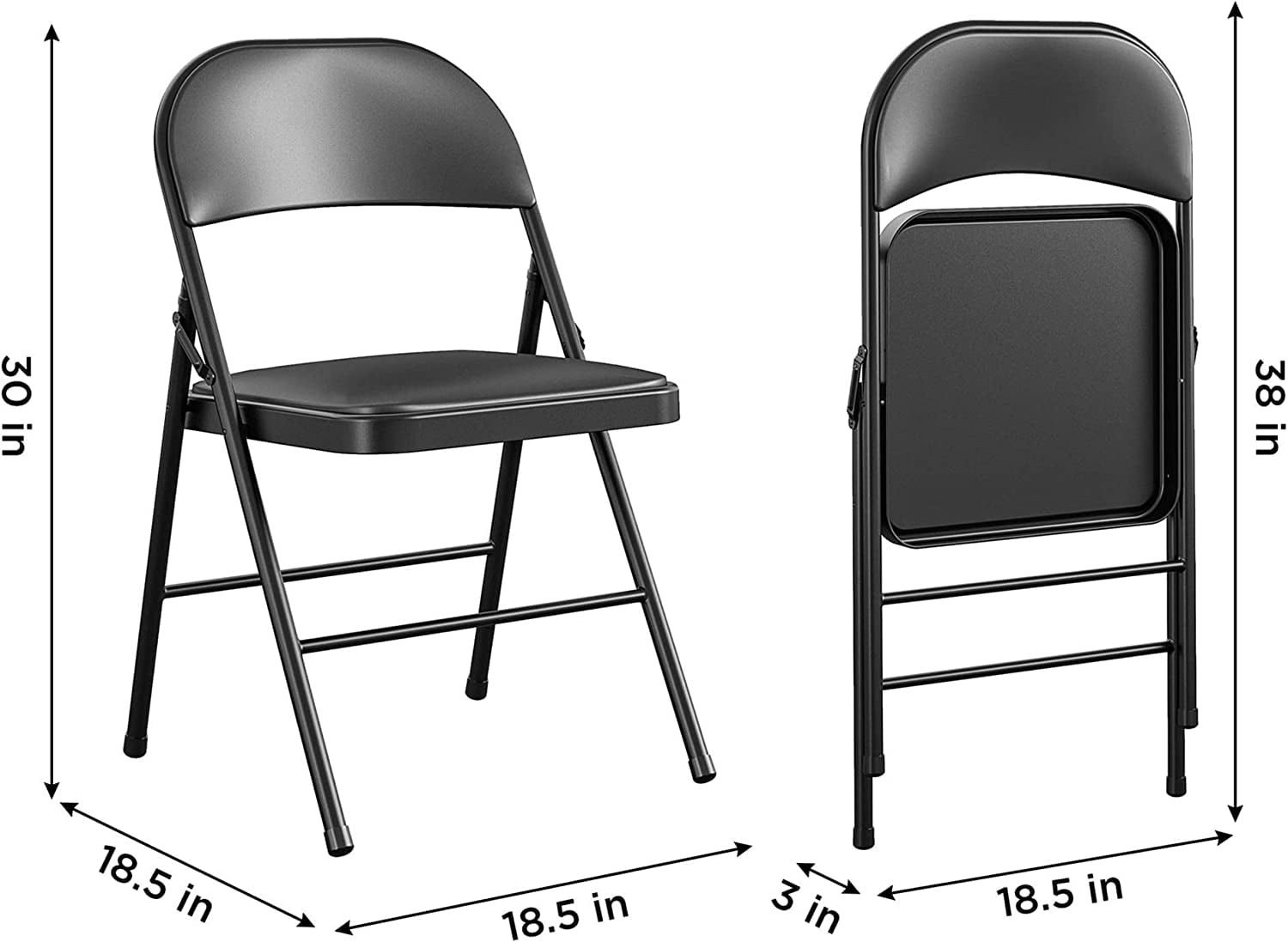 Constructed out of a vinyl seat and steel frame combination, this chair to be a long-term purchase you can use with peace of mind and no regrets! The black steel legs make our adult chair heavy duty while retaining its stylish simplicity for office wedding banquet field camping lights indoor outdoor activities. Featured with this are non-marring leg tips intended to prevent slipping when in use and protect your floor’s surface from any possible damage. Before storing, simply wipe down this easy to clean chair using a damp cloth. When not in use, you can easily fold this lightweight chair for flat, compact storage and easy transportation. Built to last, this chair includes double cross braces and is constructed of durable all-steel allowing for a 330lbs. weight capacity. Create your dream dining arrangement for entertaining or everyday use. Specifications: 1. Color: Black 2. Dimensions: 18″ x 18″ x 31”(L x W x H) 3. Seat Dimensions: 15.75″ x 15.75″ (L x W) 4. Backrest Dimensions: 17.32″ x 7.09″ (L x W) 5. Material: Iron Tube & Fabric 6. Weight Capacity: 330lbs 7. Each Chair Weight: 8.38lbs 8.Package Includes: 4 x Foldable Chairs