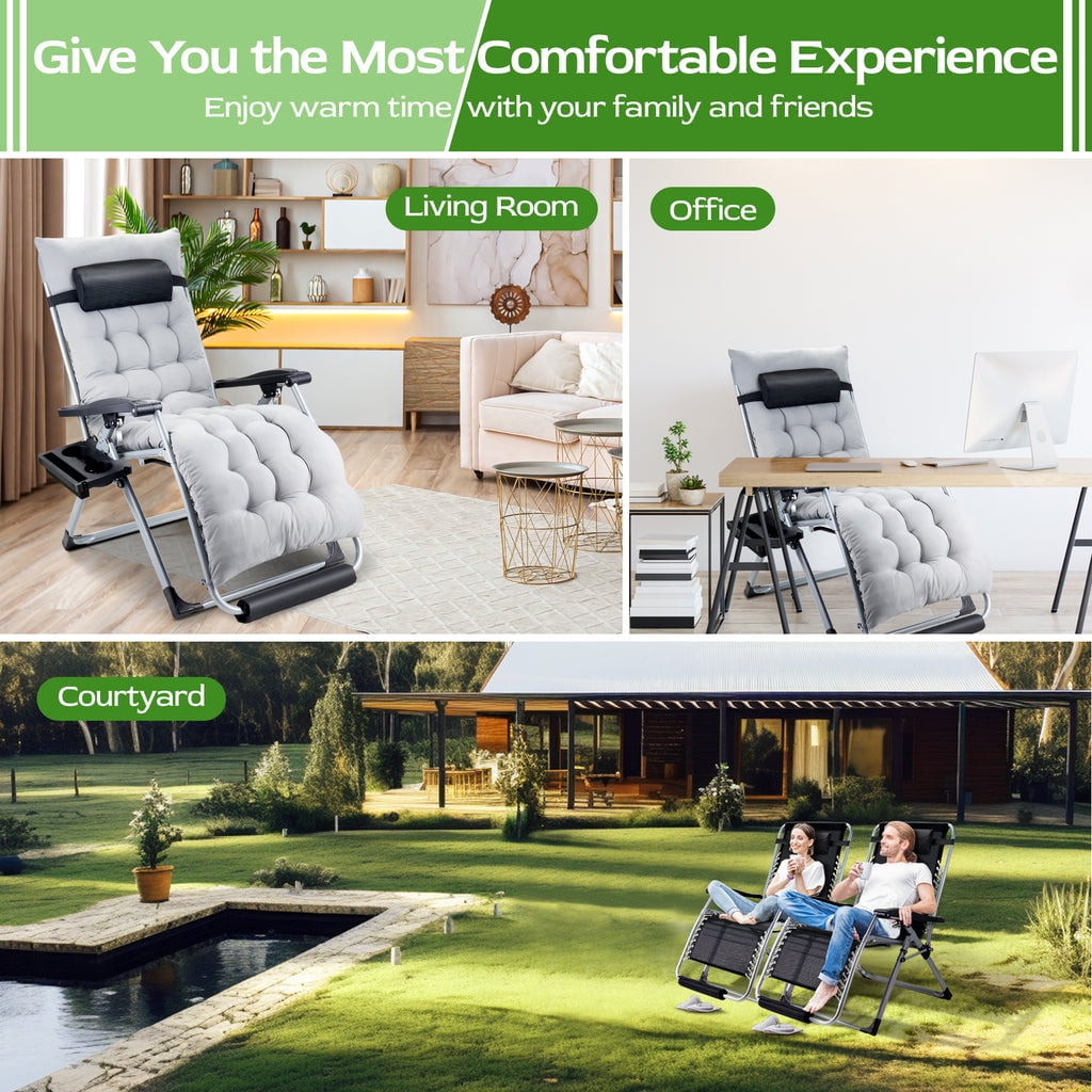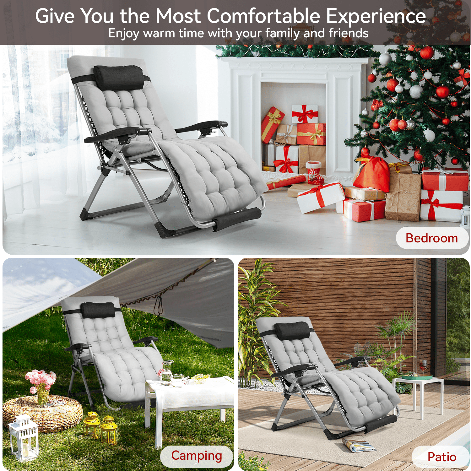 [Strong load bearing capacity] : Zero gravity chairs can withstand 500lbs, with removable upholstered and pillow, made of high quality breathable textile fabric, easy to deform, strong resilience, easy to clean; [Four seasons] : In winter, with a comfortable cushion, soft and warm; Spring and autumn weather slightly cool, plus a blanket, comfortable and at ease; Summer removable mattress, cool breathable cushion, bring a bit of comfort and enjoyment to summer; [Flexible adjustment] : This is a large zero gravity recliner that can be adjusted from 110 to 170 degrees, whether lying or sitting, giving you a very comfortable angle to enjoy life; [Integrated installation] : After receiving, you can directly open the use, the cushion is separate, according to personal needs to decide whether to install, after use, folding can be stored; [Suitable for a variety of occasions] : With this folding zero gravity chair, you can take a nap in the courtyard lawn, outdoor picnic, balcony, living room, study, office, swimming pool, whether children, adults, the elderly are suitable for your various daily needs.