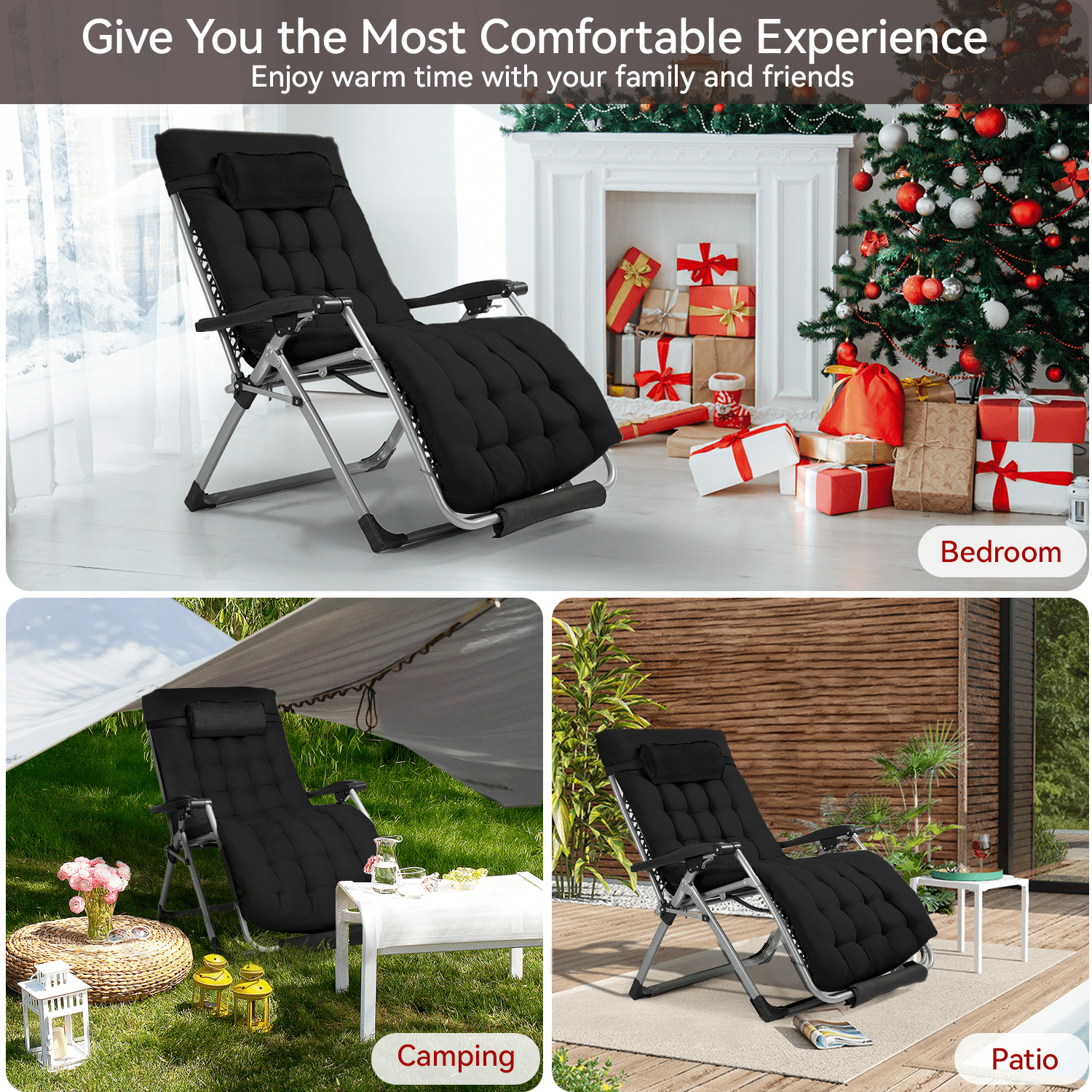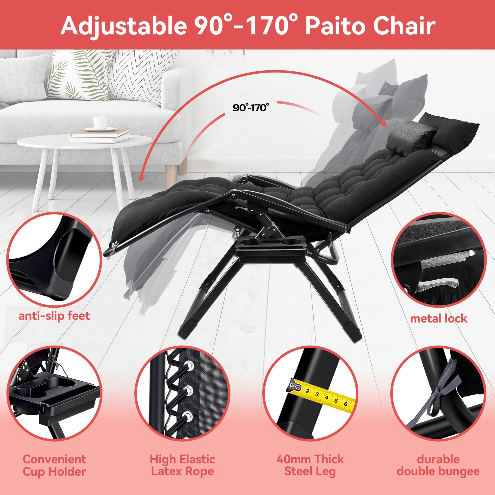 [Strong load bearing capacity] : Zero gravity chairs can withstand 500lbs, with removable upholstered and pillow, made of high quality breathable textile fabric, easy to deform, strong resilience, easy to clean; [Four seasons] : In winter, with a comfortable cushion, soft and warm; Spring and autumn weather slightly cool, plus a blanket, comfortable and at ease; Summer removable mattress, cool breathable cushion, bring a bit of comfort and enjoyment to summer; [Flexible adjustment] : This is a large zero gravity recliner that can be adjusted from 110 to 170 degrees, whether lying or sitting, giving you a very comfortable angle to enjoy life; [Integrated installation] : After receiving, you can directly open the use, the cushion is separate, according to personal needs to decide whether to install, after use, folding can be stored; [Suitable for a variety of occasions] : With this folding zero gravity chair, you can take a nap in the courtyard lawn, outdoor picnic, balcony, living room, study, office, swimming pool, whether children, adults, the elderly are suitable for your various daily needs.