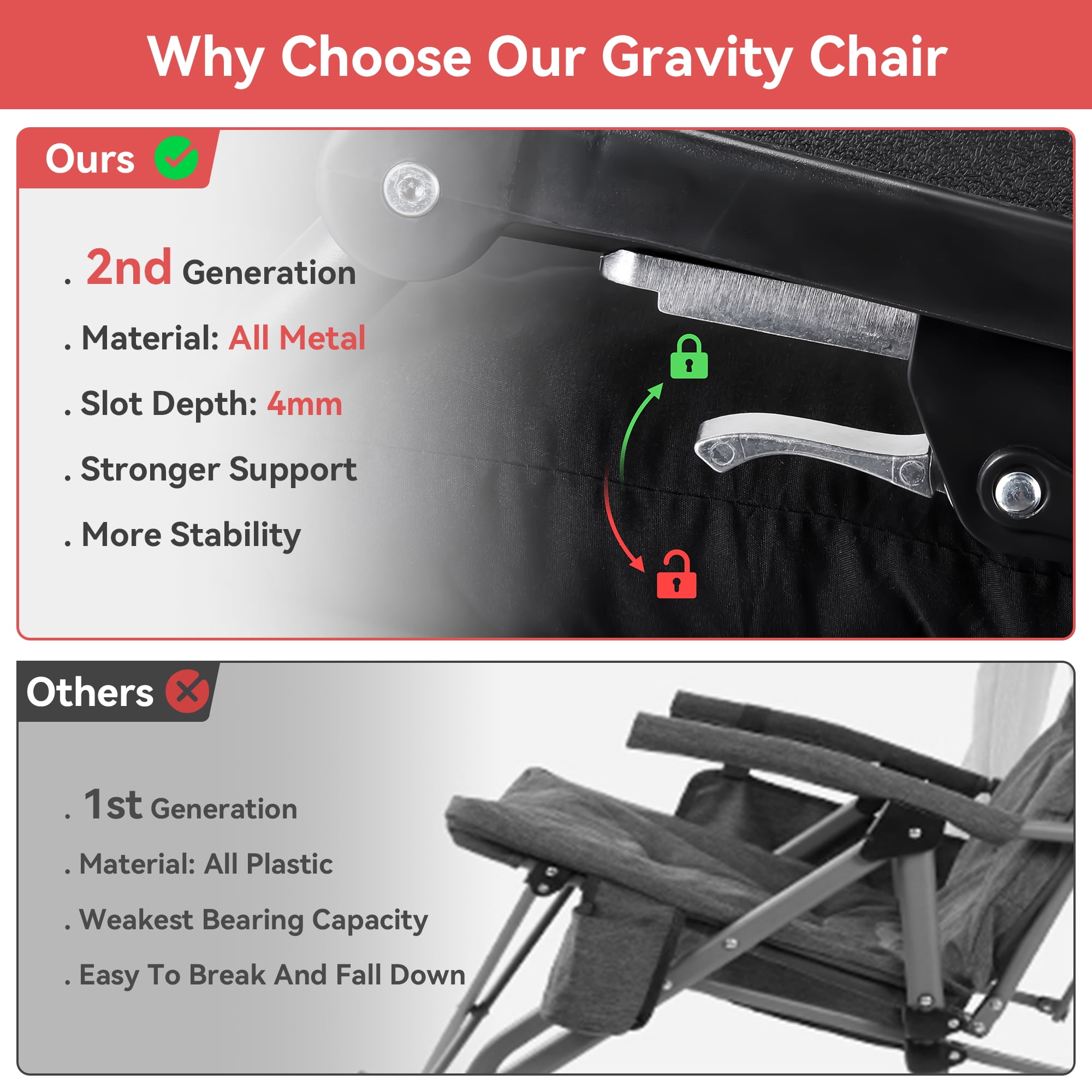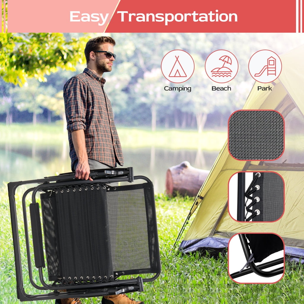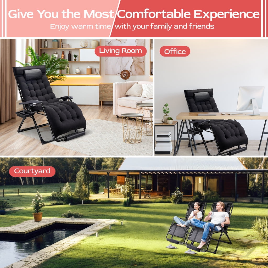 VECUKTY brings you a convenient life!VECUKTY Reclining Lounge Chair with Removable Cushion & Tray ????????[OVERSIZED XXL SIZE] Colorï¼Black/Gray Set up size is 33″W x 31″D x 45″H Folding size is 33″W x 37″L x 5.7″H Cushion Pad is 70″L x 33″W CHAIR WEIGHT is 23.8lbs The WEIGHT CAPACITY is 550lbs ????????[LONG-LASTING & DURABLE USE] The zero gravity chair can take 500-560 pounds of weight. This outdoor patio reclining chair is extra durable and will last you a lifetime. This professional outdoor padded lounge chair is built with premium quality materials, which provide increased durability and resistance. ????????[COMFORTABLE & ERGONOMIC DESIGN] The zero gravity chair is designed to satisfy your ultimate comfort. The armrest of outdoor padded lounge chair is thick and contoured. It will serve you whether sitting or lying, outdoor and indoor. Our folding lounge chair comes with a thick and soft pad, and the ergonomic design of this outdoor recliner chair can relieve pressure on your spine, improve circulation, and reduce muscle tension. ????????[REMOVABLE SOFT PAD] Intuitive design features that this outdoor recliner chair can be used by anybody. You can remove the soft cushion from outdoor patio reclining chair to promote better airflow durin.Whether it’s summer or winter, you deserve it. ????????[ADJUSTABLE & ZERO-GRAVITY CHAIR] Our folding lounge chair has an adjustable design that can be adjusted from 110 to 170-degree angle. This amazing feature of outdoor recliner chair helps you select the optimal angle that brings you to a comfortable, relaxing position. Simply push the clip to unlock the position, and pull the clip back to secure it at your desired position. ????????[WIDELY APPLICATION] Whether relaxing by reading a book or getting a quick break, this comfortable outdoor patio reclining chair is your one of the best choice. This padded lounge chair can be used indoors, for outdoor activities, such as family gatherings, BBQs or beach day, or at the office, lawn and yard.