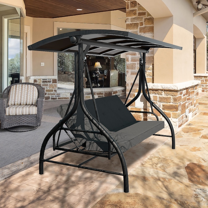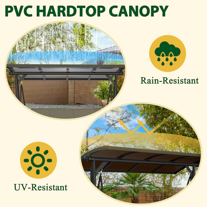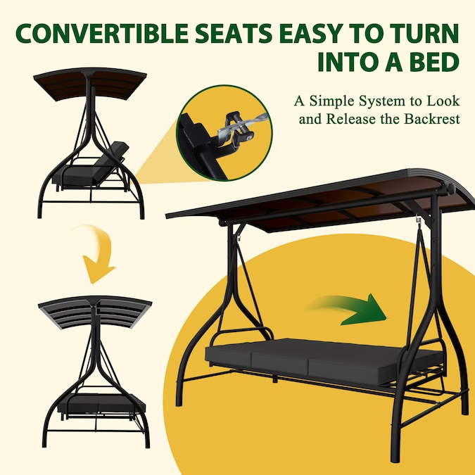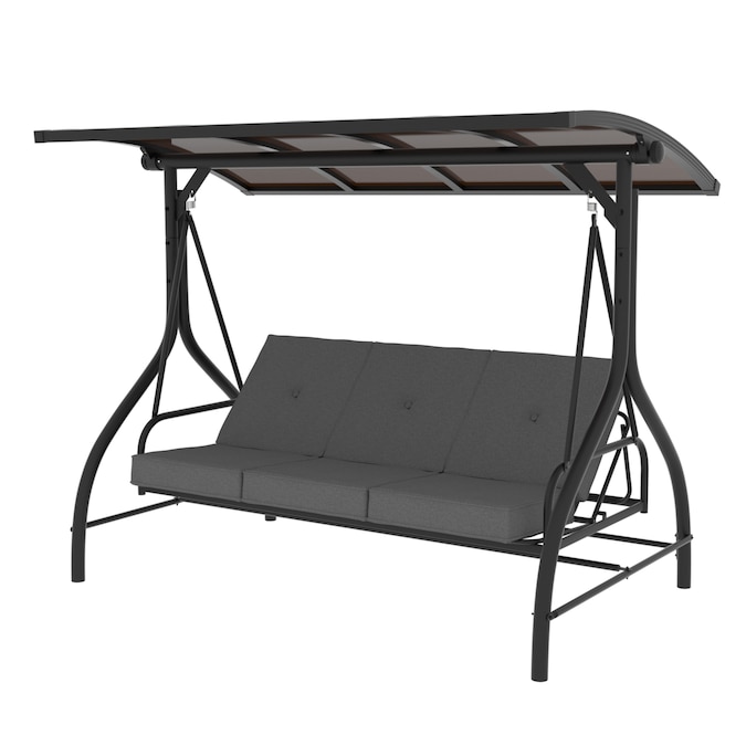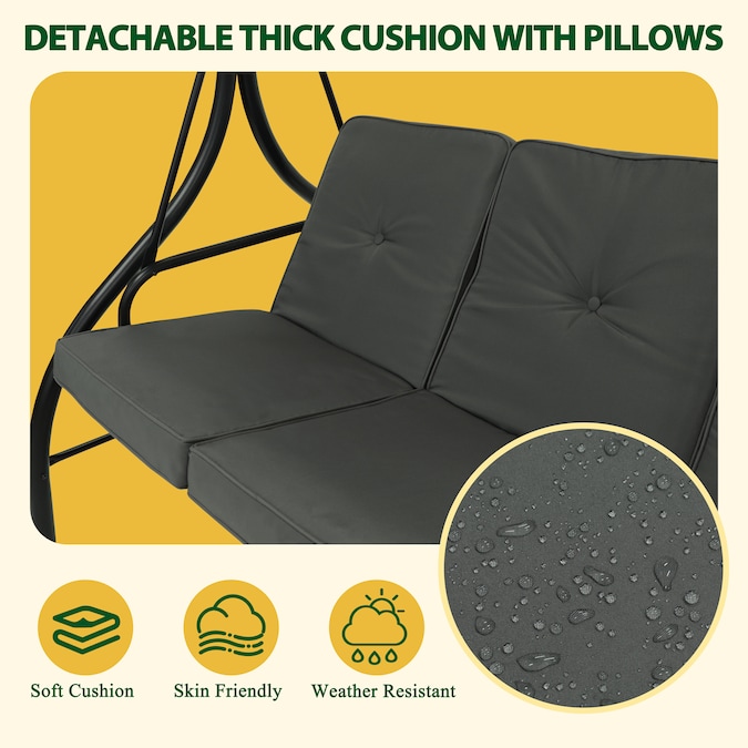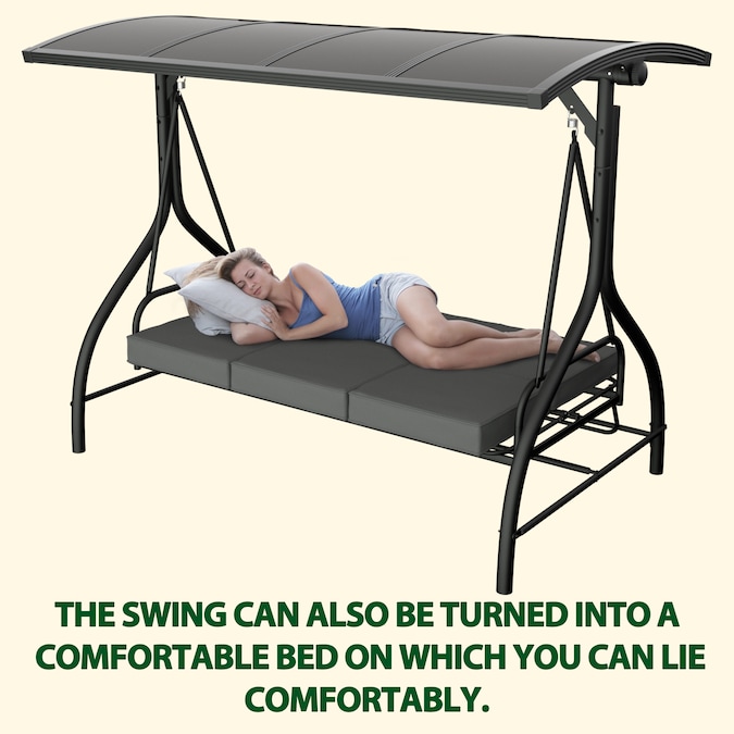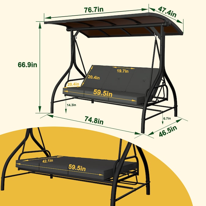 The removable adjustable canopy of this 3-person porch swing is intentionally upgraded with two extra powder-coated steel tubes to give the swing way better ability of wind resistance, supportive stability while rotating and good looking from being collapsing easily. Upgraded to PC top design for better protection against UV rays and better stability. This PC swing comes with comfortable cushions and good hardware to bring you a cozy experience.You can also adjust the canopy in 45 degrees according to your needs for the best shade.