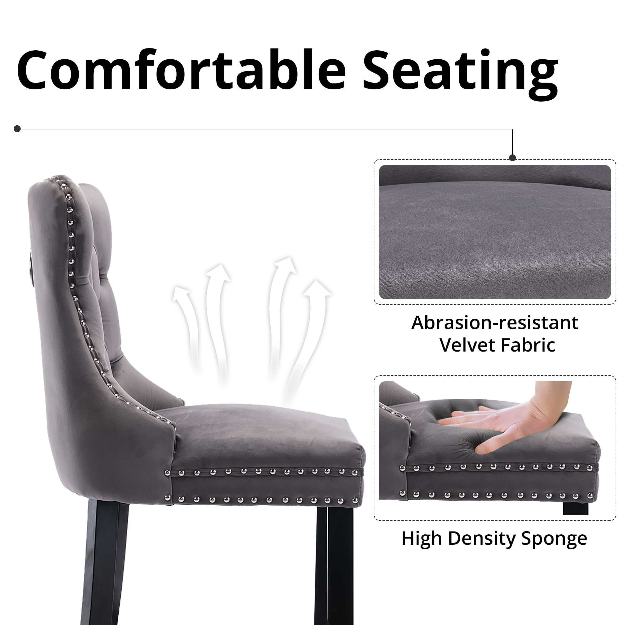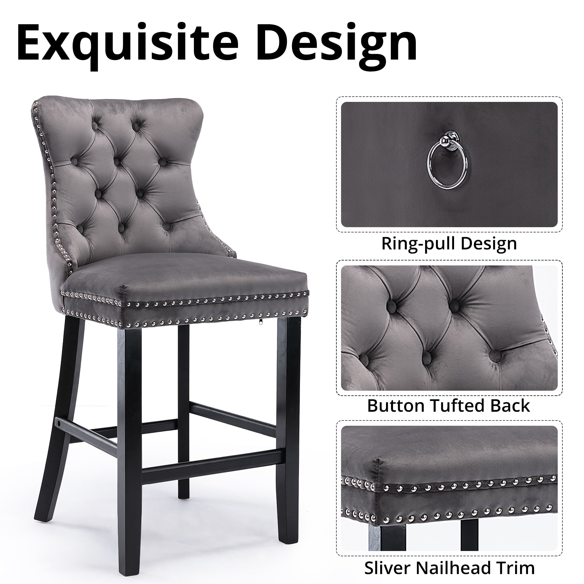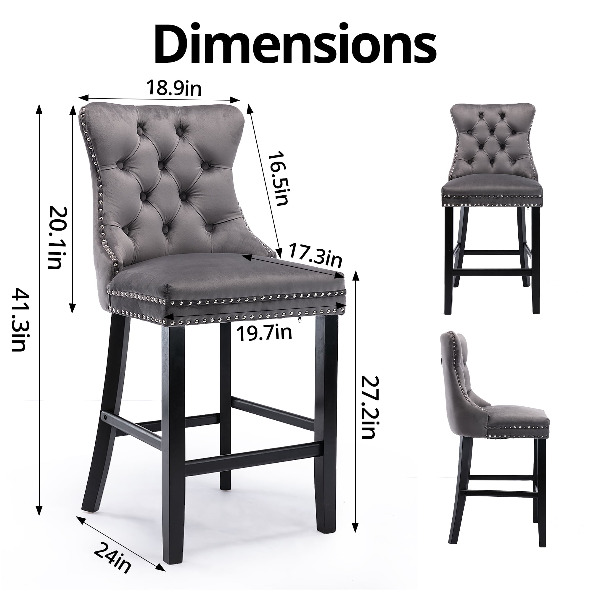 Quality & Comfortable Material: Boasting lavishly soft velvet upholstery and stylish solid wood legs, this versatile chair will enhance any dining area. Silver decorative studs around the cushion and backrest make this chair a bright spot in your home and adds an extra design to finish the look. Comfortable Seating: Featuring soft velvet upholstery seat, the bar chair provides a great sitting experience. And the high and ergonomic-designed backrest and footrest can provide more support for your body while sitting, making it relaxing and safe at the same time. Solid and Durable Construction: The ring behind the back has a decorative effect, also help to pull the chair out. Springs and thick soft sponge padding provide maximum comfort. the solid dining room chairs are steady and strong to bear a great capacity up to 300lbs. Besides, the solid legs under the seat provides you with extra stability. Wide Ranges of Occasions: With Advanced but elegant appearance, our Upholstered Barstools combine decoration and function, which will be a great addition to your dining room, kitchen, bar, cafe, bistro, coffee house, restaurant, etc. fit various occasions according to your needs and likes. Overall Dimension: 24”L x 20.1”W x 41.5”H. Any problem pls feel free to contact us and we will try our best to solve for you well.