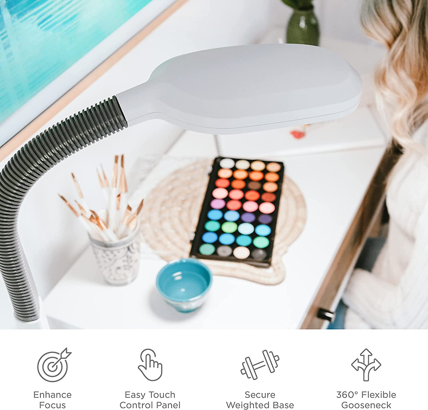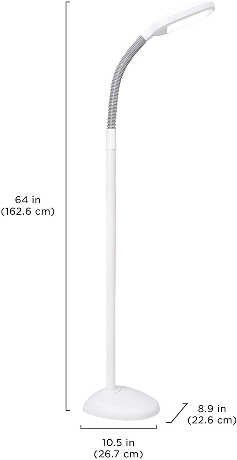 FULL SPECTRUM, LED LIGHT – Long-lasting, LED light delivers better brilliance and truer color for reading and performing detailed tasks PERSONALIZED SETTINGS – Customize your experience by choosing between 5 light intensity levels and 3 color temperature settings ranging from warm white to daylight SLEEK, MODERN DESIGN – Contemporary take on the traditional gooseneck floor lamp that fits seamlessly in any space REDUCE EYE STRAIN AND EYE FATIGUE – Mimicking natural daylight, this floor lamp is flicker-free and equipped with an Optix lens to control glare, while helping to reduce eye strain and eye fatigue LIFE IN A BETTER LIGHT – With over 60 years in healthy lighting and the creator of the original HappyLight®, our US-based team is here for you with live support and a 1-year warranty