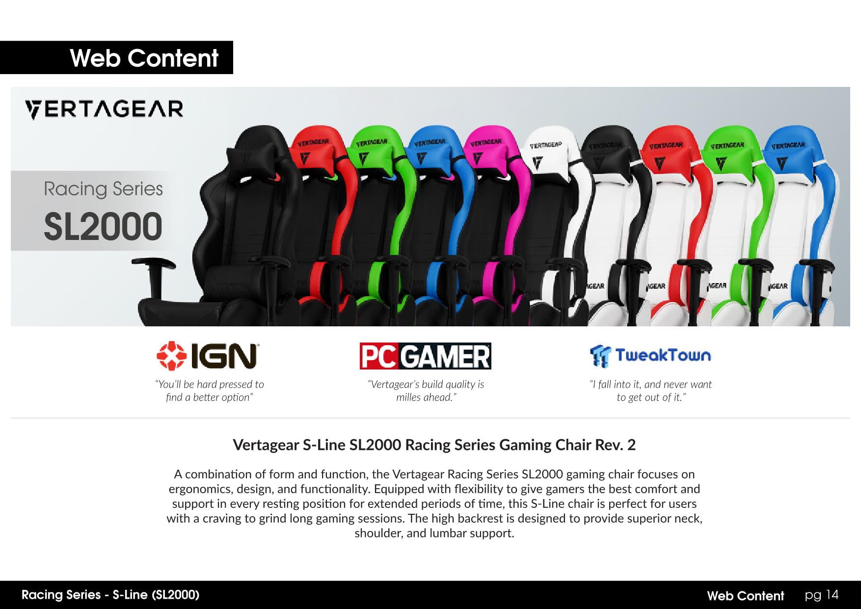 A combination of form and function, the Vertagear Racing Series S-Line SL2000 gaming chair focuses on ergonomics, design, and functionality. Designed to give wide range of adjustability that gives gamers the best comfort and support in every gaming position for extended period of time, this S-Line chair is perfect for users with a craving to grind long gaming sessions. The high backrest is designed to provide superior neck, shoulder, and lumbar support.