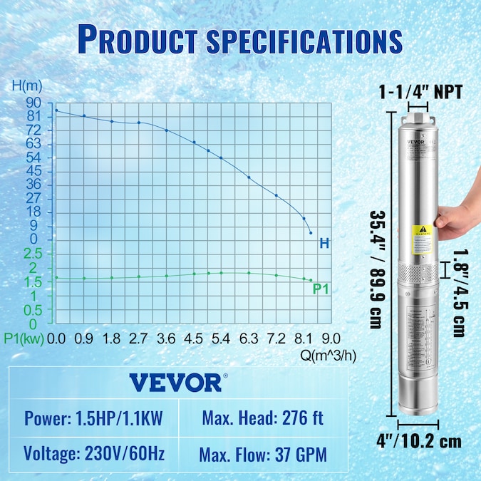 - Max flow: 37GPM; Max head: 276 ft, Power: 1.5HP, 230V; Diameter: 4-IN; It comes with a 33 ft electric cord