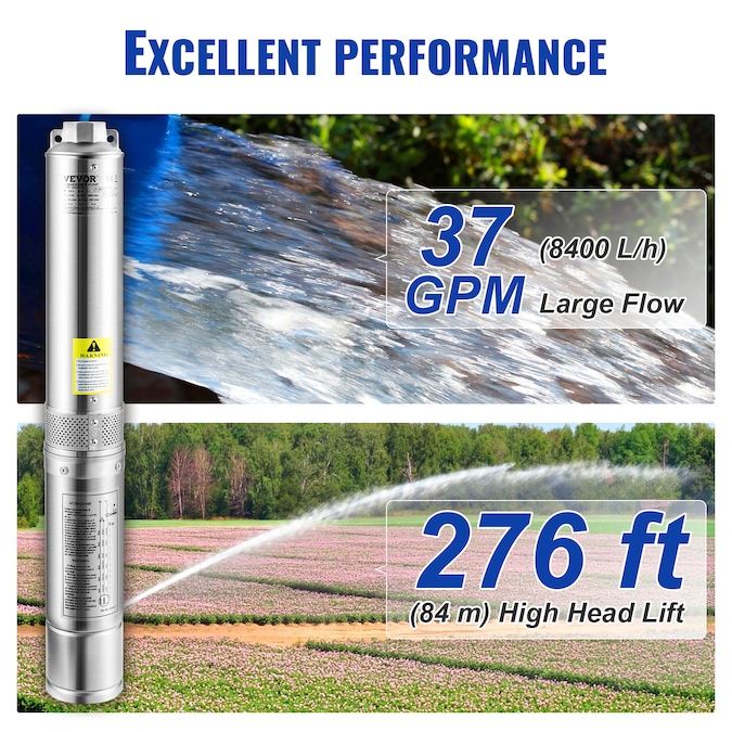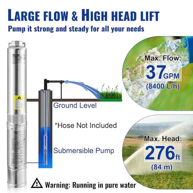 - Enhanced Pump Flow AND Head: Power: 1.5 HP, 230V; Diameter: 4-IN (for 4-IN or bigger well casing); Discharge: 1-1/4-IN NPT; This deep well submersible pump is designed with 5-stage thermoplastic impellers, providing 37GPM max flow and 276 ft max head; It comes with a 33 ft electric cord, making life without modern plumbing a lot easier; Pump out your worries with ease and relax; No challenge is too big for you