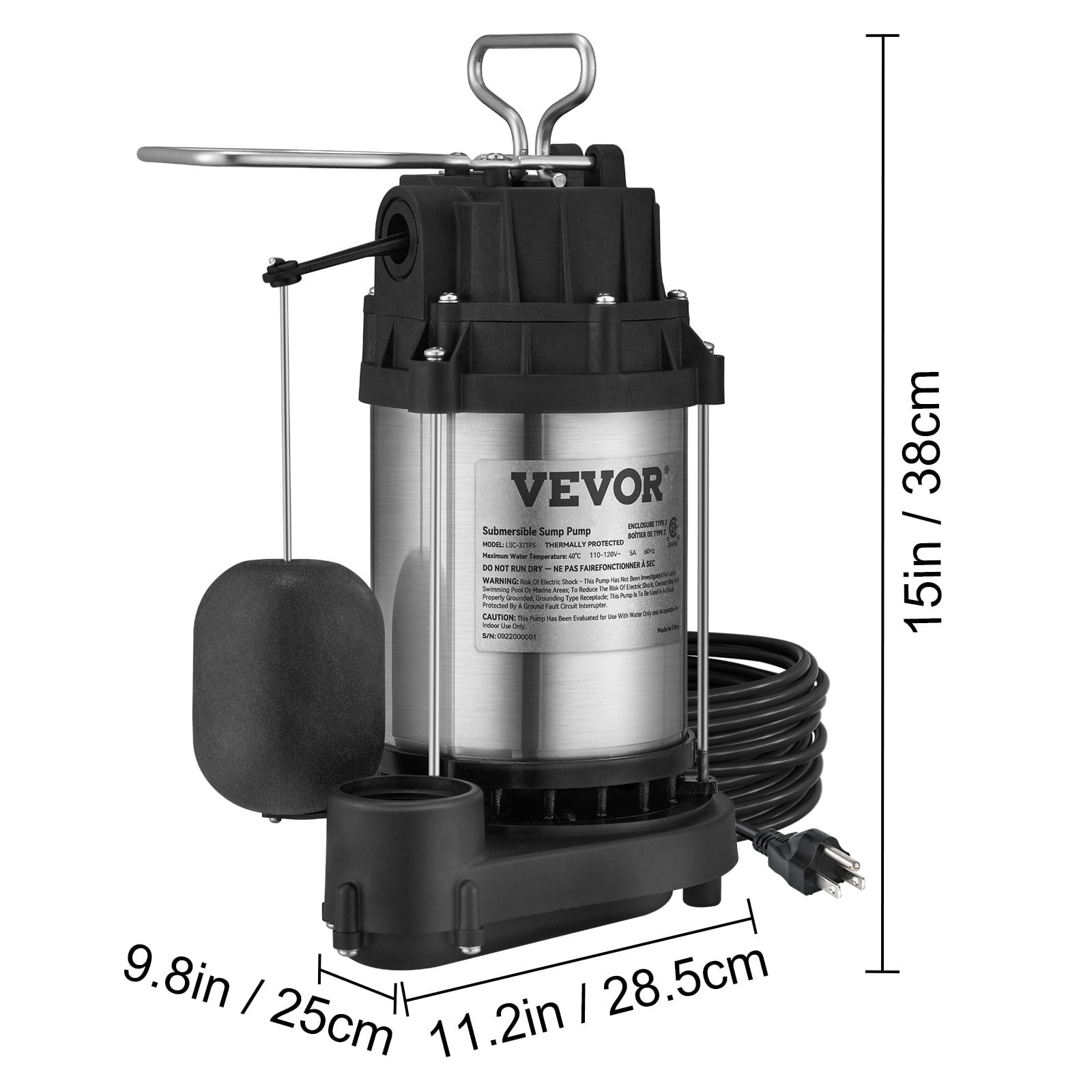 Brand Introduction VEVOR is a leading brand that specializes in equipment and tools. Along with thousands of motivated employees,VEVOR is dedicated to providing our customers with tough equipment & tools at incredibly low prices. Today, VEVOR has occupied markets of more than 200 countries with 10 million plus global members. Why Choose VEVOR? 1.Tough Quality Assurance 2.Incredibly Low Prices 3.Fast & Secure Delivery 4.30-Day Free Returns 5.24/7 Professional Customer Service Product Description 1/2 HP Submersible Sump Pump A must-have tool for every home! Efficient & Durable Motor The 1/2 HP powerf Tested to UL Standards copper motor makes our sump pump maintain long-term quick drainage performance. It features thermal overload protection and low noise during operation. Excellent Performance Different lifts correspond to various flow rates. The larger the flow is, the lower the water height required in the pump. So you can choose the proper flow and rate needed. Runs on Its Own Are you tired of turning the pump on directly? Well, our sump pump comes with a sensitive float switch to allow the pump to automatically turn on/off according to the water level. Runs on Its Own Are you tired of turning the pump on directly? Thanks to the vertical float switch, our basement sump pump will start working automatically when the water level rises above 9.8″ and stop working when the water level is below 3.1″. Premium Materials This heavy-duty sump pump is made of durable cast iron and stainless steel to withstand underwater environments. The sealing structure can protect the inner motor and ensure long service life. Easy to Install Our automatic sump pump only takes a few minutes to install and requires minimum maintenance. Plug it in and forget it. It is perfect for keeping your basement clean and dry. Specifications Model: LSC-371PS Voltage: 110-120V 60HZ Horse Power: 1/2 HP Amps: 5 A Max. Lift: 28 ft/8.5 m Max. Flow: 72 GPM Power Cord Length: 10 ft / 3 m Water Temperature: 32-95℉ / 0-35℃ Protection Type: IPX8 Package Content 1 x Sump Pump