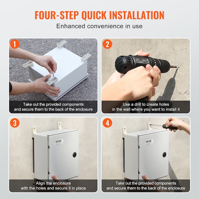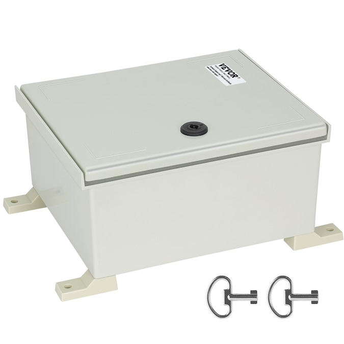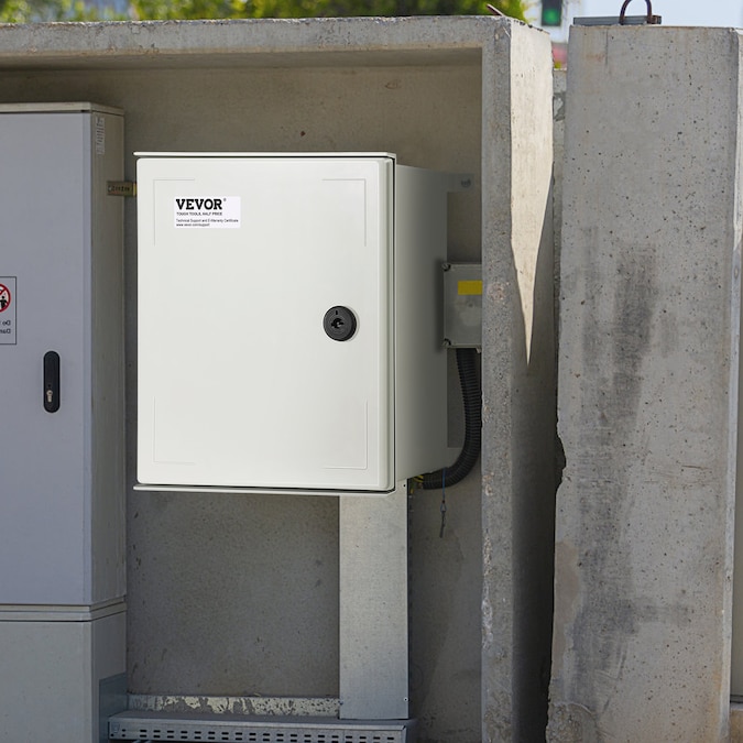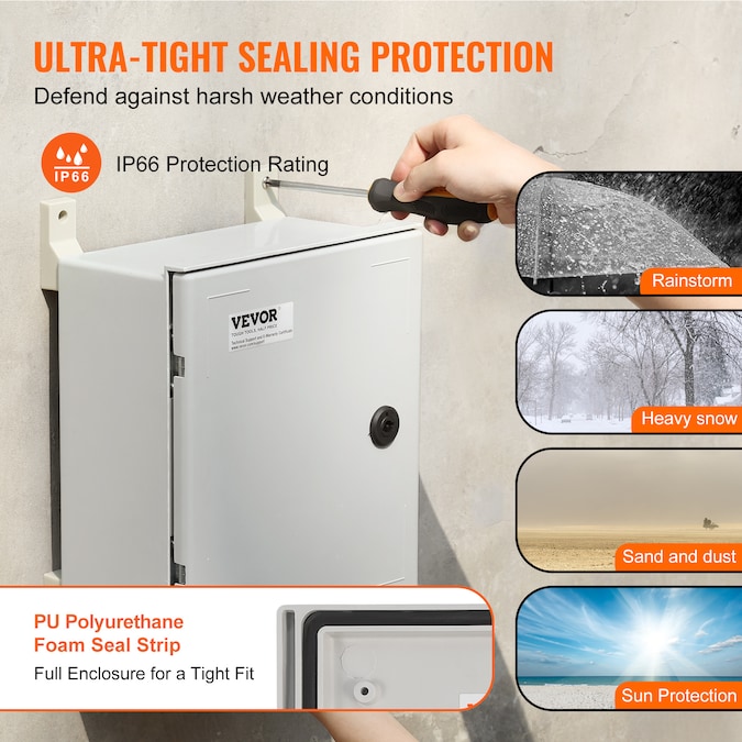 Electrical Enclosure Box–Begin your security setups: IP66 Grade and High Security and DIY Projects; The electric enclosure box is meticulously crafted from heavy-duty fiberglass reinforced polyester; Precise lock design, high-strength hinges, sealing strips, and IP66 protection grade are all used to secure your plug-ins, power cords, and other equipment in harsh environments; It is widely used for indoor and outdoor applications, such as electricity, construction, hotel, and other industries; A robust well-crafted electrical enclosure box provides optimal protection and ensures consistent performance all year long; Choose a name you can trust, VEVOR; [Package Content] 1 x Electrical Box; 2 x Keys; 1 x Galvanized Back Plate; 3 x Guide Rails; 1 x Set of Hanging Accessories