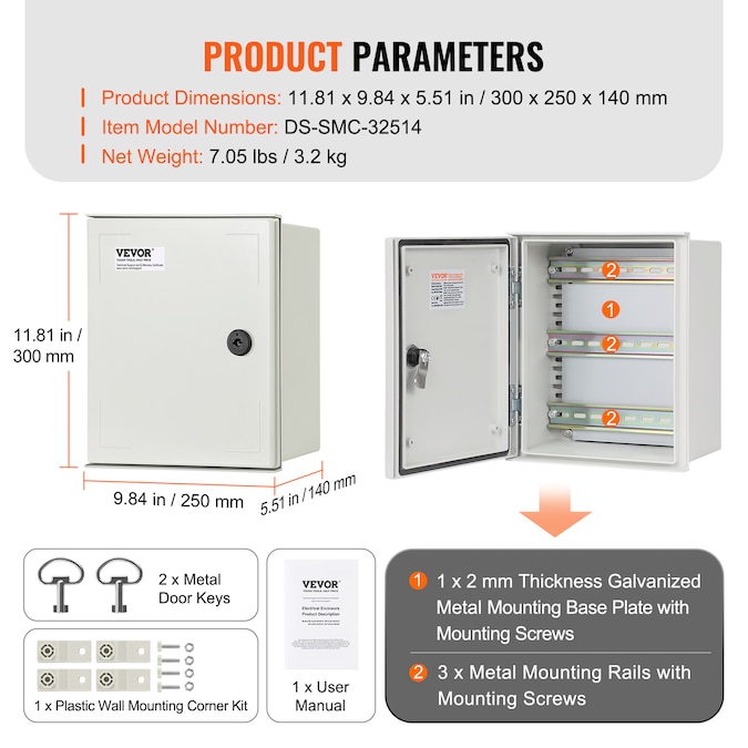 - Specifications: Material: SMC; IP Rating: IP66; NEMA Rating: NEMA Type 3, 3X; Mounting Type: Wall-Mount; Mounting Plate: Galvanized Back Plate; Outer Dimensions(H x W x D): 11.8 x 9.8 x 5.5 inch / 30 x 25 x 14 cm; Inner Dimensions(H x W x D): 10.8 x 9.4 x 5.5 inch / 27.5 x 24 x 14 cm; Net Weight: 7.72 lbs/3.5 kg; Application: Indoor/Outdoor
