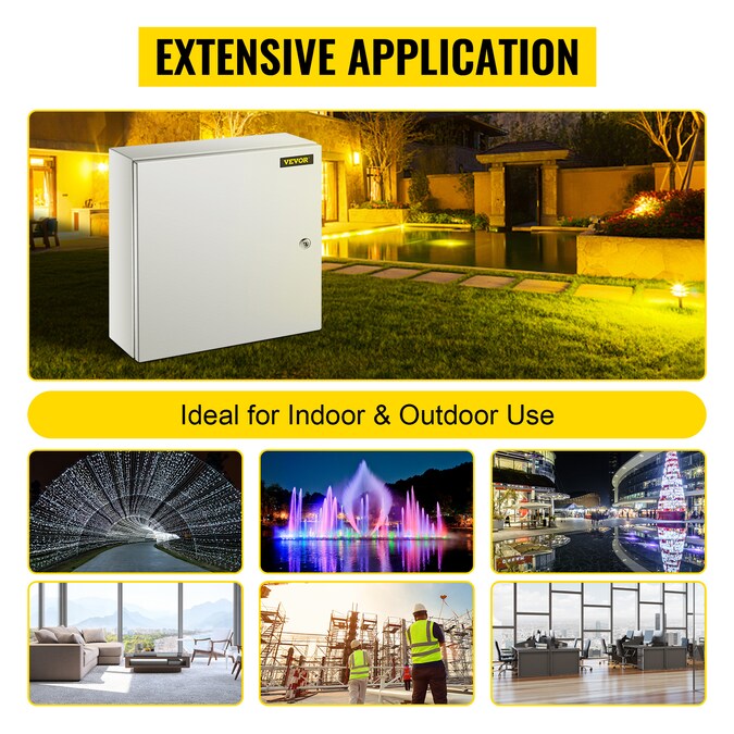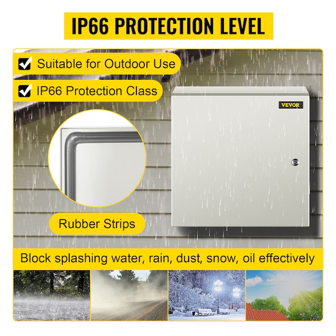 Electrical Enclosure Box–Begin your safety setups; IP66 Grade and High Security and DIY Projects; The electric enclosure box is made of high-quality carbon steel; Precise lock design, high-strength hinges, sealing strips, and IP66 protection grade are all used to protect your plug-ins, power cords, and other equipment from the influence of the weather; Therefore, to ensure the circuit protected from liquids and corrosion; Sturdy Steel Construction; IP66 Waterproof Grade; Reinforced Lock and Hinge; Convenient Operation; Exquisite Details Design; [Package Content] 1 x Electrical Box; 2 x Keys; 1 x Mounting Plate(The mounting plate has been assembled in the box); 1 x Set of Wall Mounting Pendants; 1 x Bottom Sealing Plate