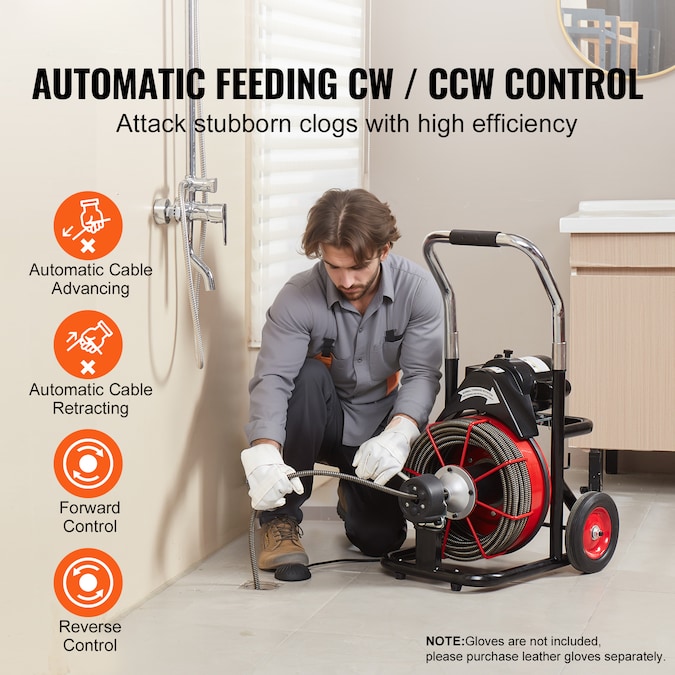 - Drain Cleaner Machine: Are you tired of clogged drainage pipes, expensive plumbing services, and incomplete unclogging? Say bye to unpleasant smells and trouble maintenance! Let VEVOR electric drain cleaning machine with 100 FT x 1/2 In solid core cable solve all blockage problems in one go without any worries!; [Package Content] 1 x Pair of Gloves; 8 x Cutters; 1 x Hex Wrench; 2 x Drain Cleaner Sticks; 2 x Hex Screws; 1 x Washer; 1 x User Manual
