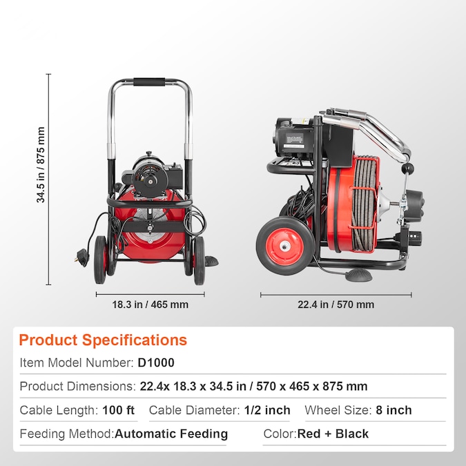 - Specification: Item Model Number: D1000; Feeding Method: Automatic Feeding; Cable Length: 100 ft; Cable Diameter: 1/2 inch; Color: Red + Black; Wheel Size: 8 inch; Net Weight: 112.32 lbs / 50.95 kg (including all accessories); Product Dimensions: 22.4 x 18.3 x 34.5 in / 570 x 465 x 875 mm