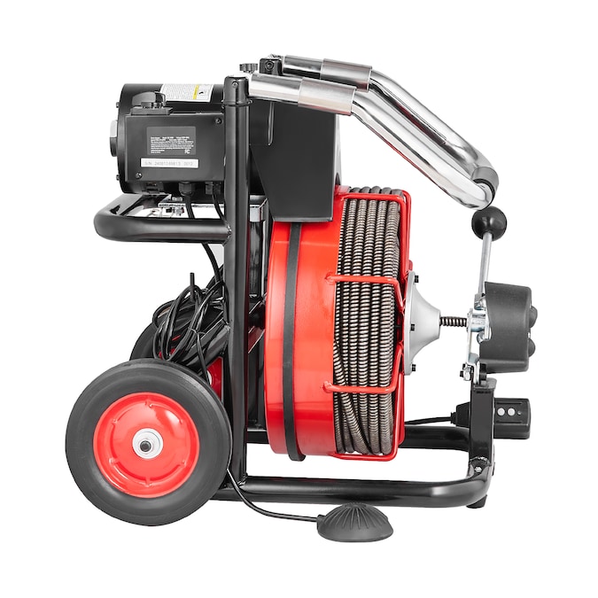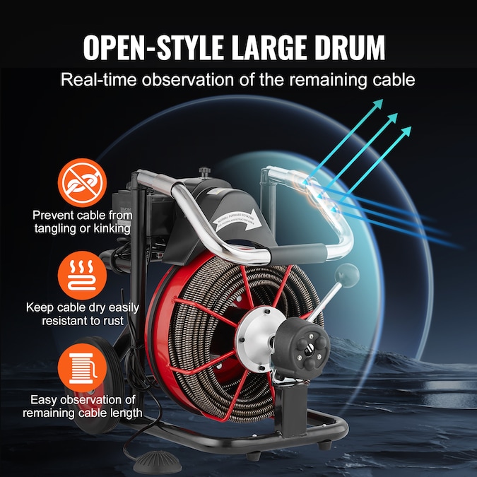 - Portable and Space-Saving: Take it anywhere, store it with ease! This drain cleaning machine is equipped with 8-in wheels, enabling effortless movement; The foldable handle provides a comfortable grip, while making it convenient to store when not in use