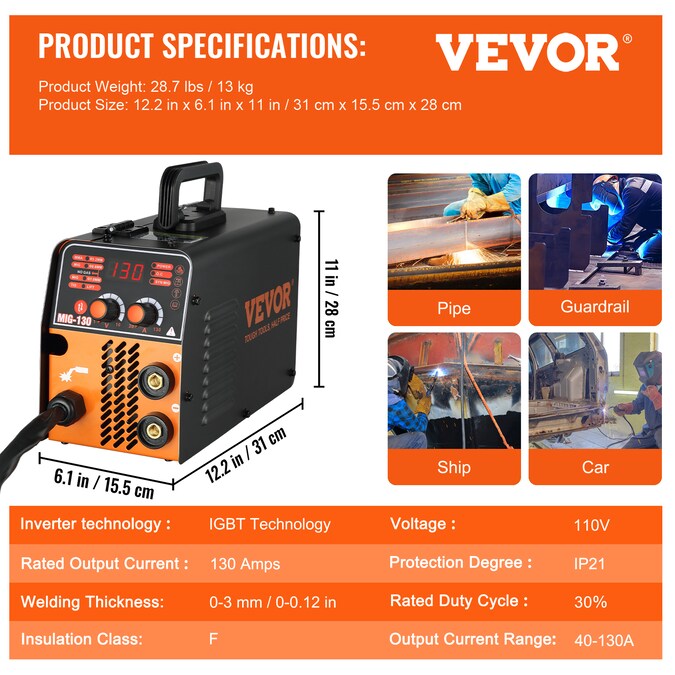 - Specification: Model: MIG-130; Input Power Voltage: 110V; Rated Output Current: 130 Amps; Welding Thickness: 0 – 0.12 in / 0 – 3 mm; Output Current Range: 40-130A; Insulation Class: F; Protection Class: Ip21; Product Size: 12.2 x 6.1 x 11 in / 31 cm x 15.5 cm x 28 cm; Product Weight: 28.7 lbs / 13 kg