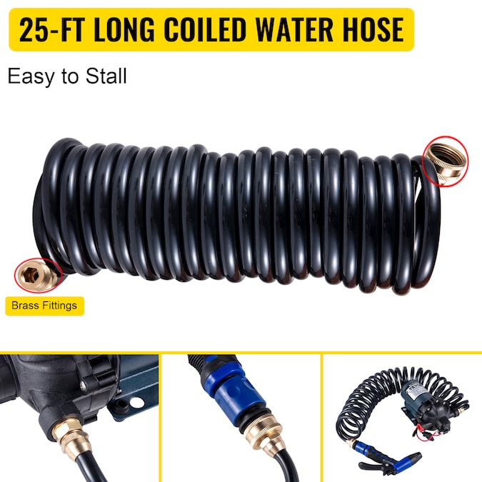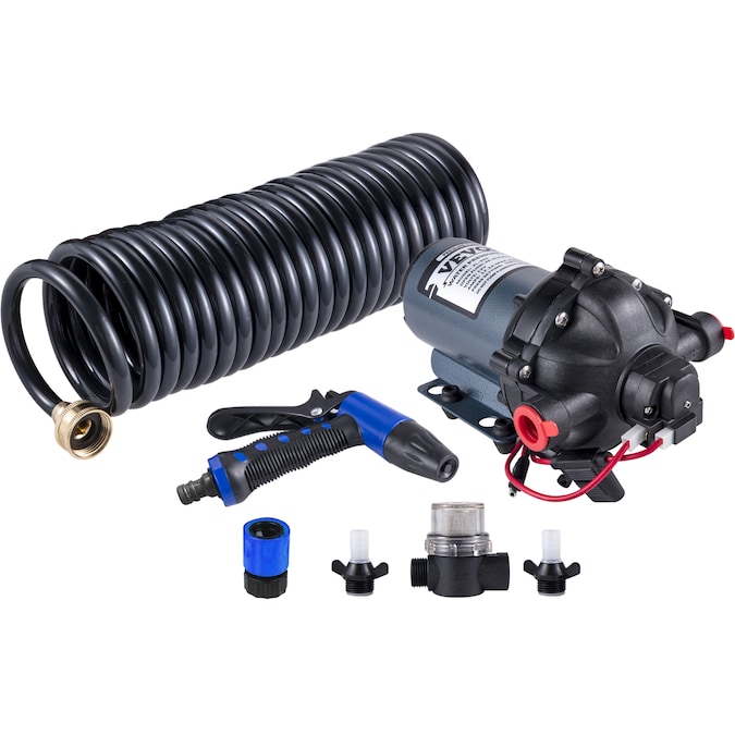 - Voltage: 12V DC; Flow Capacity: 5.5 Gallons Per Minute; Water Pressure: 70 PSI; With 25 ft Coiled Hose