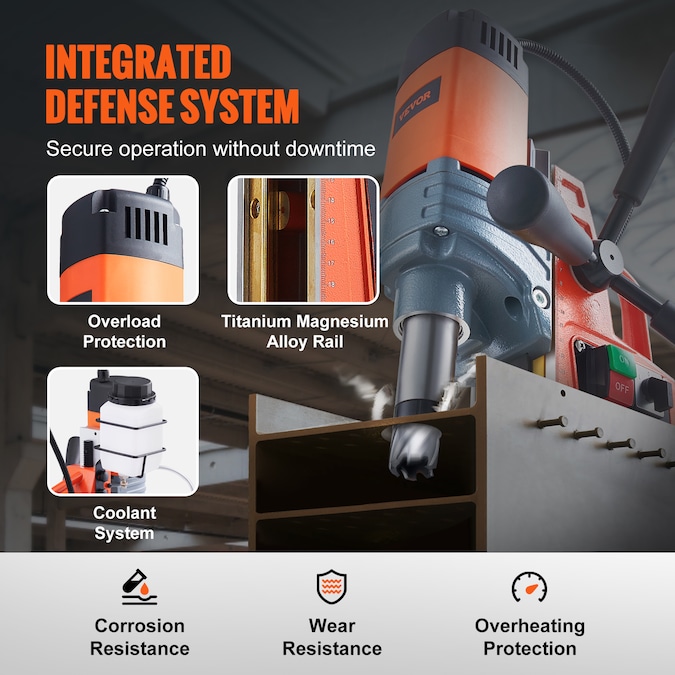1450W Electromagnetic Drill Press: Get ready to drill smarter, not harder! Equipped with a powerful motor, our electric drill press can generate exceptionally strong power to drill holes of various diameters at variable speeds; Thanks to its 12800N holding force, our mag drill can anchor itself on any steel or iron surface tightly to accurately position and drill holes without burr at any speed; Now, that sounds powerful! Manufactured from a high-quality titanium magnesium alloy, this drill press is an essential tool for residential construction, heavy-duty industries, and steel manufacturing;; [Package Content] 1 x Drill Chuck Key; 1 x Drill Chuck; 1 x Coolant Tank & Stand; 1 x Coolant Tube; 1 x Rope; 1 x Thimble; 3 x Hex Wrenches; 1 x Universal Crank; 6 x Coring Bits; 3 x Hand Cranks; 1 x User Manual